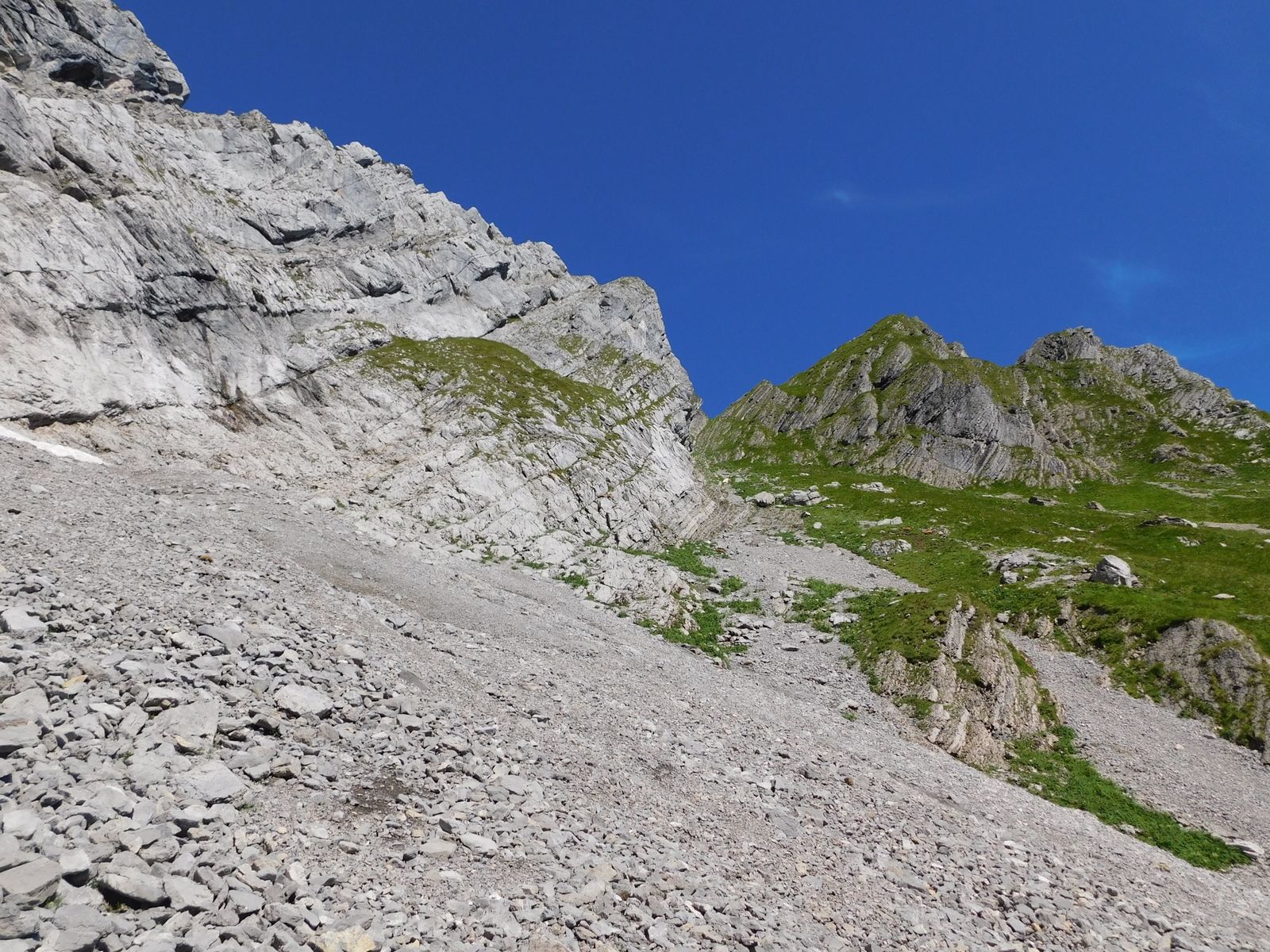 Am Ende des Falkenkars steigt man eine Grasrinne hinauf zur Zwischenscharte in der Bildmitte: