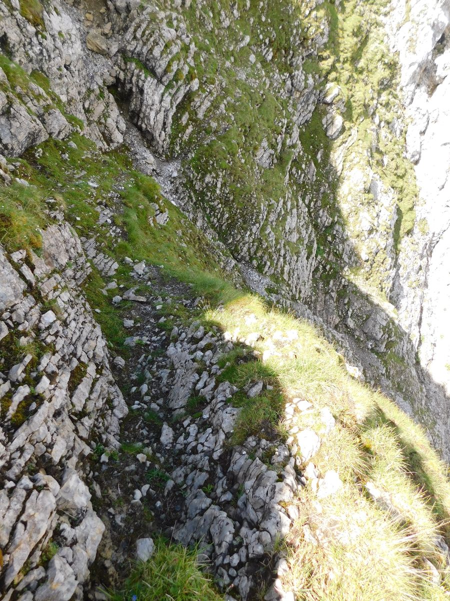 Von der Zwischenscharte muss man eine steile Grasflanke hinunterqueren und zur Grünen-Rinn-Scharte aufsteigen. Es ist aber nicht so wild wie es auf manchen Fotos aussieht, immerhin ist bei der Querung ein schmaler Pfad vorhanden: