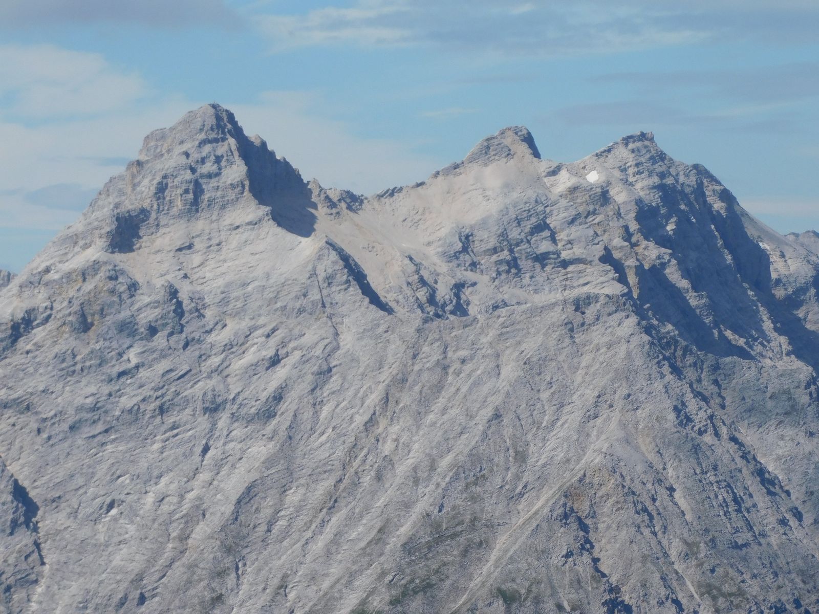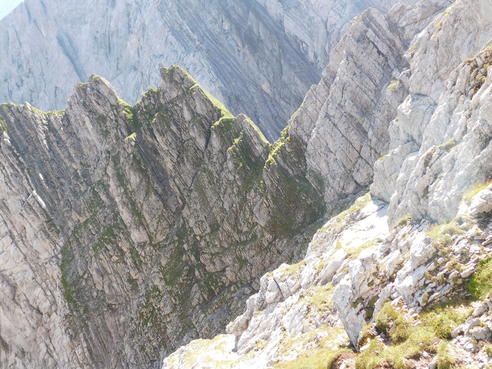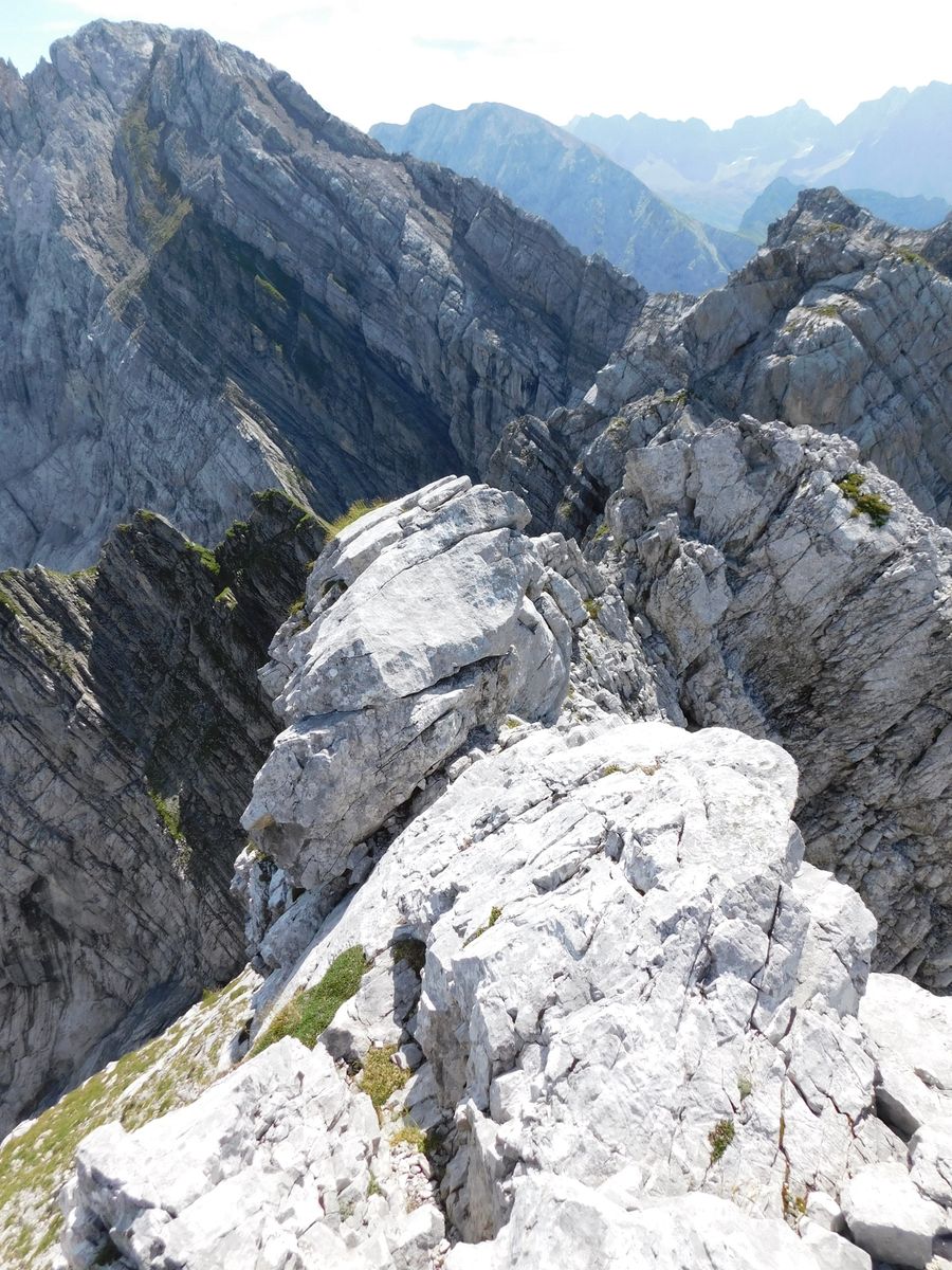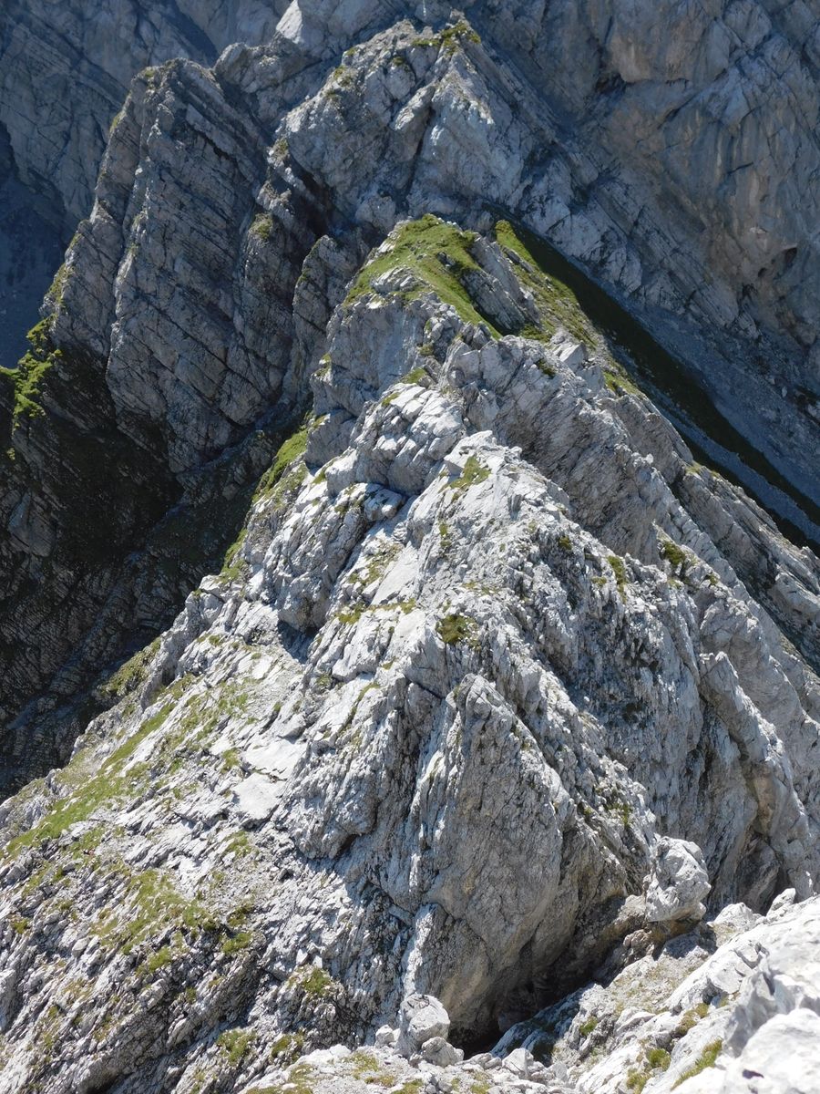 Zoom-Foto von der Zwischenscharte zu einer weiteren Schlüsselstelle - man muss den Grat kurz nach Norden verlassen und durch die Rinne in der Bildmitte auf-/absteigen (bzw. knapp daneben). Das war klettertechnisch die knackigste Stelle, meiner Meinung nach 2+