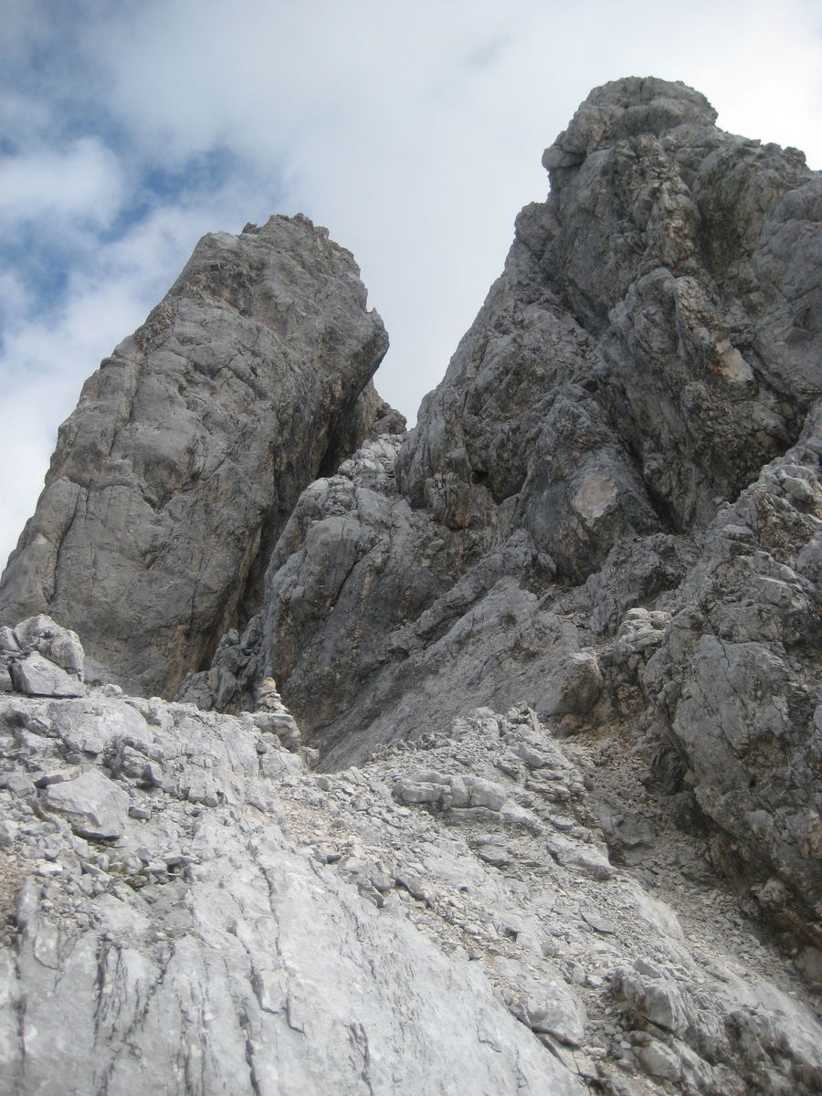 In der Mitte der Signalgipfel, links davon die Scharte und die Schuttrinne. Um zur Schuttrinne zu kommen, muss man erst eine Weile auf die Südseite hinüberwechseln: