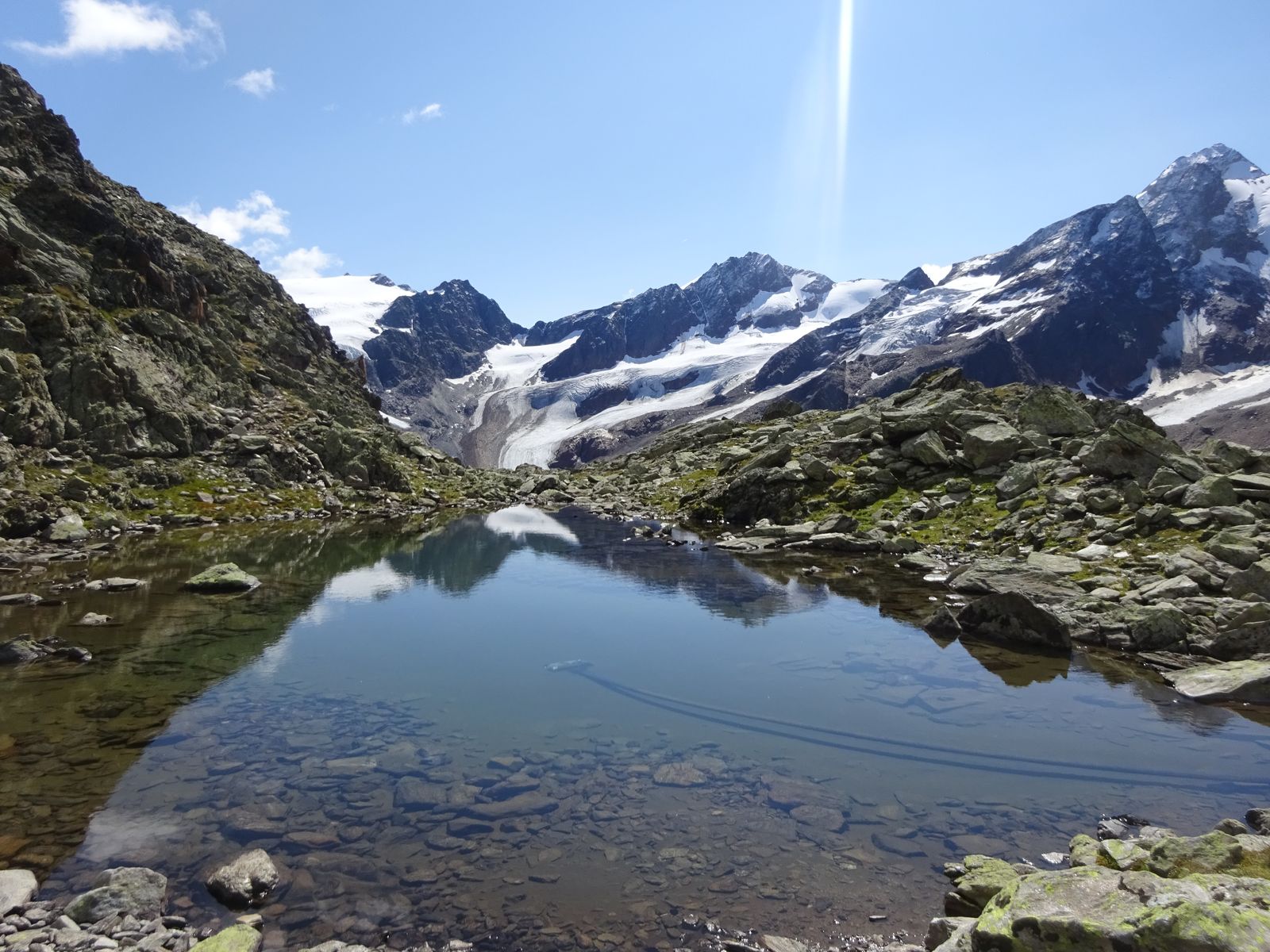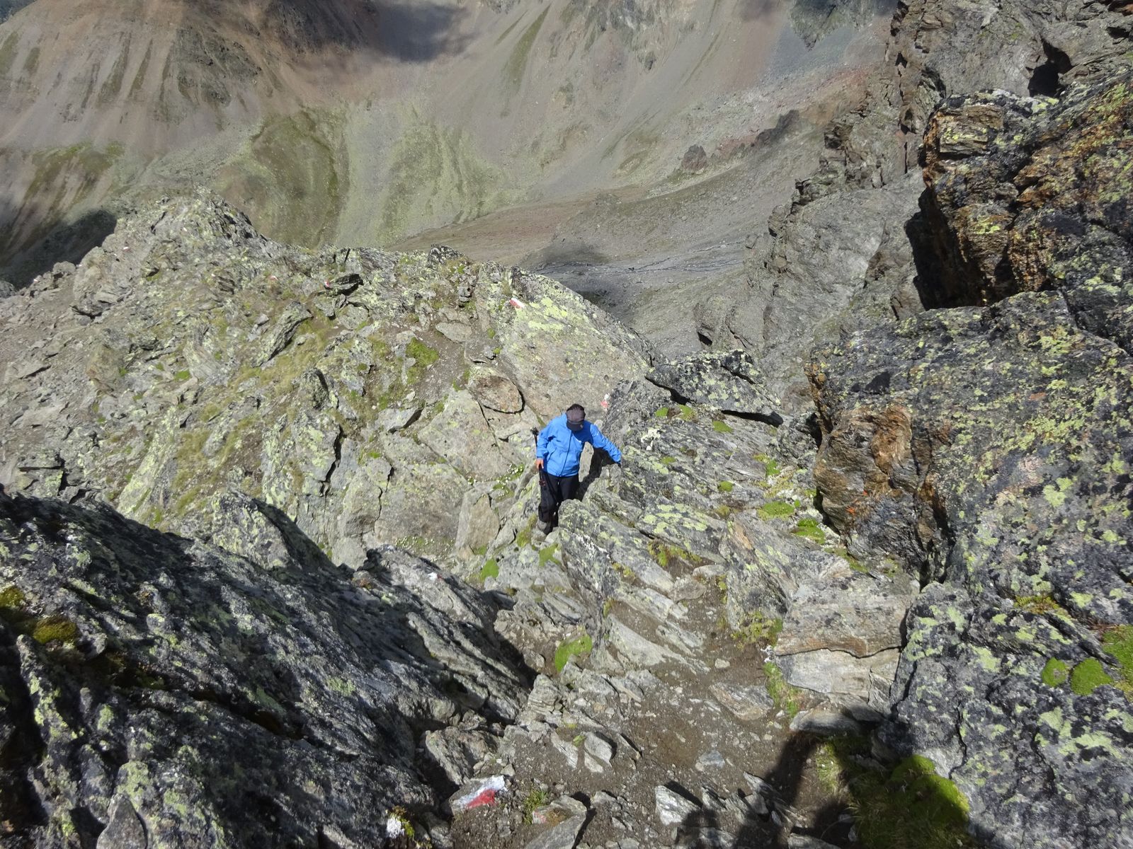 Wir sind gestern zum Abschluss unserer neuntägigen Südtirol-Reise vom Brenner zum Reschen im Langtauferer Tal gewesen und auf den Schmied gestiegen. Zunächst ging es auf dem normalen, wunderschönen Hüttenweg zur Weißkugel-Hütte. Von hier aus gibt es zwei Optionen, um auf den Schmied zu gelangen, die sich natürlich sehr gut zu einer Rundtour verbinden lassen. Ich hatte den steileren Weg für den Aufstieg (bei der Hütte links abzweigen) geplant und so folgten wir Beschilderung und Markierung, bis uns nach etwa einer halben Stunde der Hüttenwirt entgegenkam und uns fragte "Wisscht´s es eigentlich, dassch es heit a Erschtbegehung machtsch?" Auf unsere etwas verwunderten Blicke klärte er uns auf, dass er in den letzten Tagen einen neuen Weg auf den Schmied markiert habe, der weniger steil und dafür landschaftlich attraktiver sei als der alte. Und wir seien nun die ersten, die den Steig begehen... Ohne den alten Steig zu kennen, gebe ich ihm recht, da der neue Weg an einem kleinen, flachen See auf etwa 2700 Metern vorbeiführt (ganz toller Platz zum Fotografieren!), in dem man im August oft sogar Baden kann, da er sich schnell erwärmt. Vom Gipfel (, der seit gestern eine Markierungsstange sowie ein Gipfelbuch hat; das "Gipfelkreuz steht rund 70 Meter tiefer auf der sogenannten Adlerhöhe,) sind wir dann auf dem anderen Steig wieder zur Hütte und auf dem Weißkugel-Höhenweg nach Melag zurück. Insgesamt eine landschaftlich gewaltig schöne und abwechslungreiche Tour! Anforderungen: Überwiegend einfach (T2-3); nur auf den letzten 200 Höhenmetern muss man hin und wieder Hand anlegen, wobei es nie wirklich ausgesetzt ist (T4-).