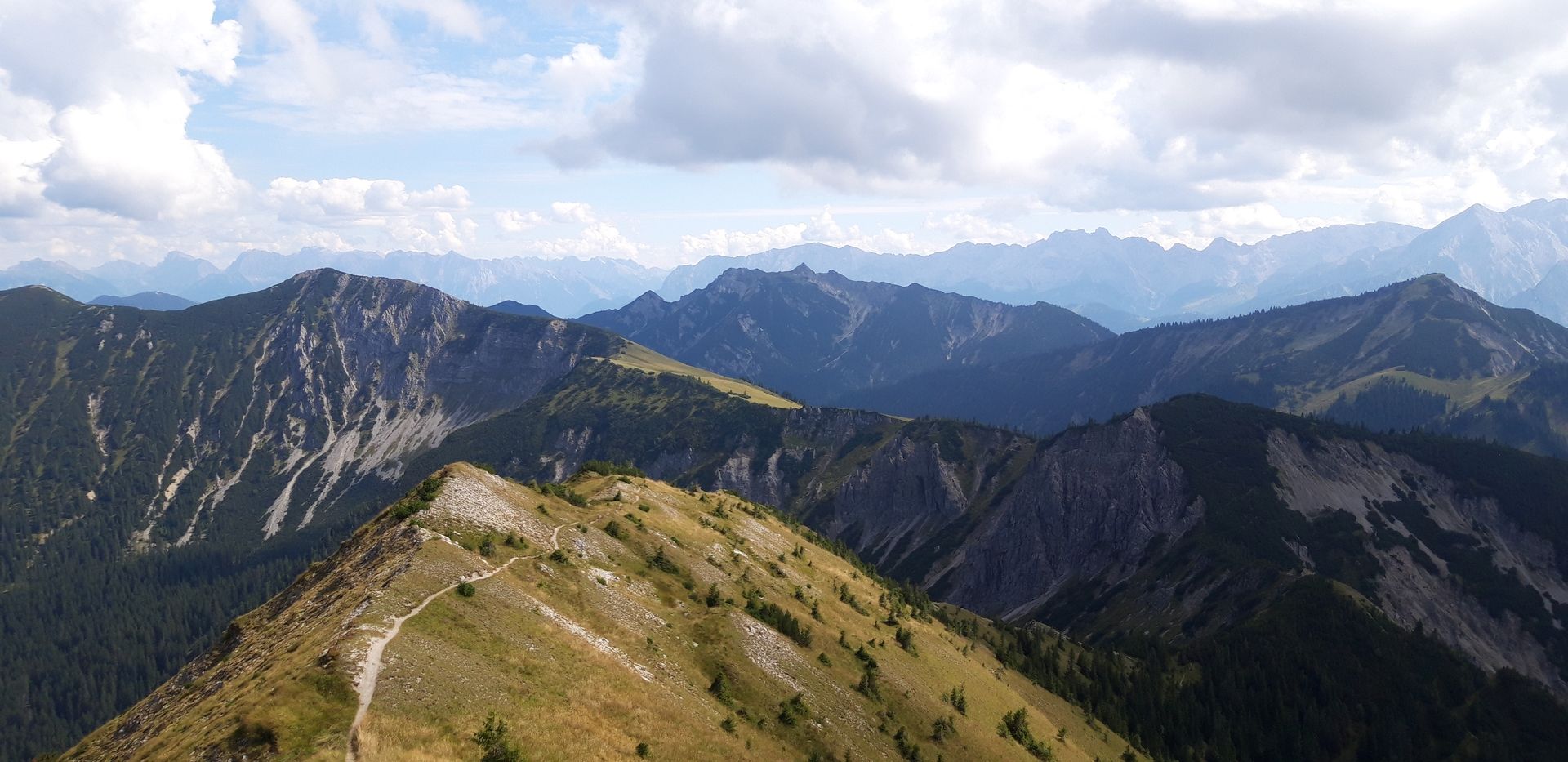 Dabei gilt es ab kurz nach dem PP zunächst die Beschilderung Richtung Kienjoch (nach links) zu ignorieren und sich auf der Forststraße rechts zu halten bis man zu einem breiten Bachbett kommt, das meist nur von einigen Rinnsalen durchflossen ist (dennoch am besten Schuhe ausziehen). Am jenseitigen Ufer erblickt man eine Forststraße, auf die man zusteuert. Wiederum wird ein Wegweiser zum Kienjoch ignoriert und es geht nach rechts, bis sich die Straße gabelt - hier links bergauf. Und dann heißt es genau aufpassen: Nach etwa 15 bis 20 Minuten zweigt in einer sachten Rechtskurve ein kleines Steiglein in dichten Jungwald ab. Bis vor wenigen Jahren war hier noch ein alter Wegweiser zum Kienjoch, aber der ist mittlerweile verschwunden. Ab hier keine Orientierungsprobleme mehr. Bis zum Kieneckspitz verläuft der Steig durch schönen, aber wenig aussichtsreichen Wald, aber dann wandelt man stundenlang auf dem Kamm mit grandiosen Ausblicken zu Wetterstein und Karwendel. Am Kienjoch kann man schon gut den Steig erkennen, der nach einem kurzen Zwischenabstieg in Serpetinen zum Windstierlkopf führt. Aufpassen muss man aber dennoch: Bevor der Hauptsteig die Flanke hinab Richtung Kuhalm leitet, geht es geradeaus weiter (keine Beschilderung/Markierung, Steig genau an der Abzweigung etwas überwachsen). Der Steig ist bis auf ein kurzes Stück nach dem Windstierl (hier einfach am Kamm halten) immer deutlich zu erkennen. Nach dem Felderkopf gabelt sich sich der Weg abermals und sinnvollerweise nimmt man die Route über den Zunderkopf, da sonst einige Höhenmeter mehr zu absolvieren sind. Beim Brünstelkopf (der Rückweg ist ab hier beschildert) links hinab ins Hasenjoch und dort wiederum links zur Kuhalm (Steig durch Kuhtritte in ziemlich schlechtem Zustand). Rechts hinuter zum Kuhalpbach, der bis auf ein kleines Stück leider aus meiner Sicht ganz grauslig durch Verbauungen verschandelt ist. Möcht gar nicht wissen, was das gekostet hat, wo doch der neue Steig von der Taubensteinbahn zum Rotwandhaus schon 67.000 Euro gekostet hat...