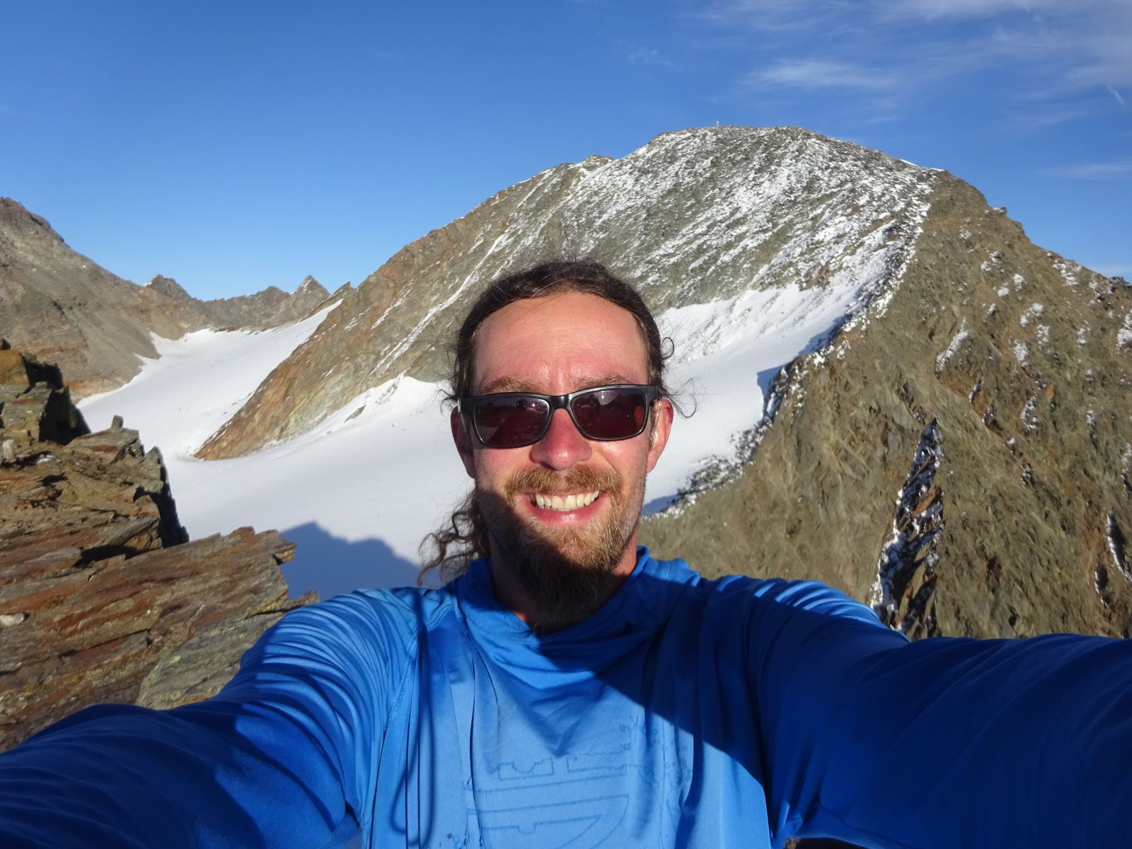 Warenkarseitenspitze: Die Besteigung dieses herrlichen Berges mit äußerst unattraktivem Namen habe ich leider auf etwa 3150 Metern aufgrund der ungünstigen/gefährlichen Verhältnisse abbrechen müssen. Die Route auf den Gipfel ist mittlerweile übrigens mit roten Punkten markiert: Kurz bevor man, vom Seekarsee kommend, das Plateau erreicht, auf dem die Hochstubaihütte steht, zweigt nach rechts ein Steiglein ab (am Abzweig kein Schild sondern ein markanter Blecheimer). Nun geht es über Blockgelände weiter ... oder eben nicht, wie bei mir gestern: Es lag noch recht viel Schnee und es war immer ein "Abenteuer", zu testen, ob man da gehen kann oder ob der Schnee ein Loch verdeckt, in dem man sich dann den Hax bricht. Schließlich gelangte ich zu einer schneebedeckten, glatten, abschüssigen Platte, die auch nicht umgangen werden kann, und ließ es dann sein. Schade, denn der Anstieg zum Gipfel schaut grundsätzlich echt lohnend aus.