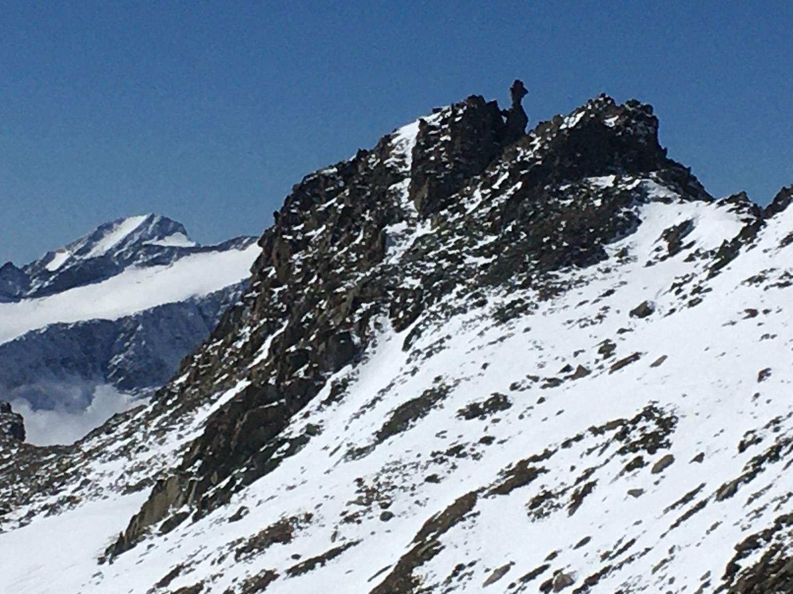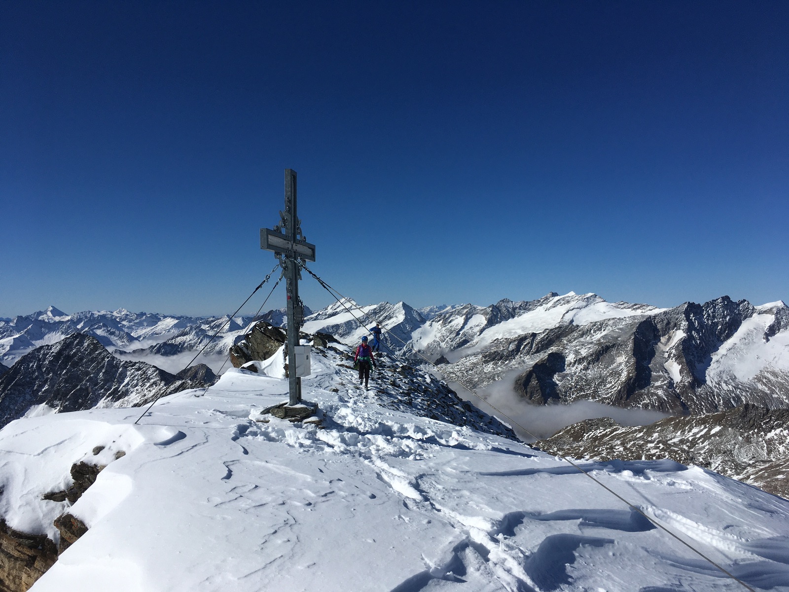 Nach der Hütte hieß es bis zum Wallhorntörl (teilweise auch "Venedigerblick" genannt) hatschen, eine Spur unserer Vorgänger half (Danke!). Zum Gipfel geht es dann nach einer Querung hinauf zu den Resten des Garaneberkees recht steil durch die Südflanke. Ziemlich anstrengend, jedenfalls so lange noch keine gute Stapfspur war. Der Gipfel selber weist ein schönes Gipfelkreuz auf und ist ein hervorragender Aussichtspunkt auf den Venedigerstock.
