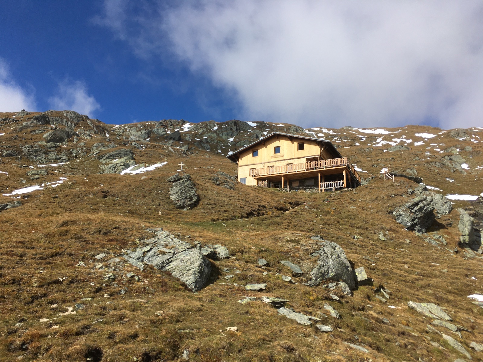 Los ging es am Parkplatz Boden-Alm oberhalb von Wallhorn im Virgental. Danach geht es erst einmal bis kurz vor die Talstation der Materialseilbahn der Eisseehütte über die Almstraße bzw. im Abstieg teilweise auch über die Steige (landschaftlich ansprechend; ein Radl hätte den Weg aber schon verkürzt). Anschließend folgt ein etwas steilerer Anstieg zur Eisseehütte. Vorsicht vor am Morgen gefrorenen Wasserläufen / Felsplatten mit Eisüberzug - mich hat es prompt geschmissen. Die Eisseehütte hatte entgegen der Homepage am Samstag Morgen zu unserer großen Freude noch geöffnet. Jetzt ist aber wohl endgültig zu.