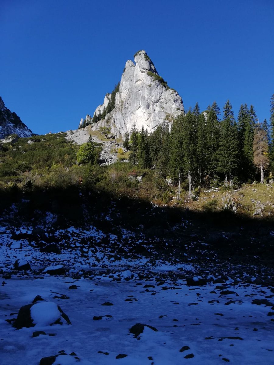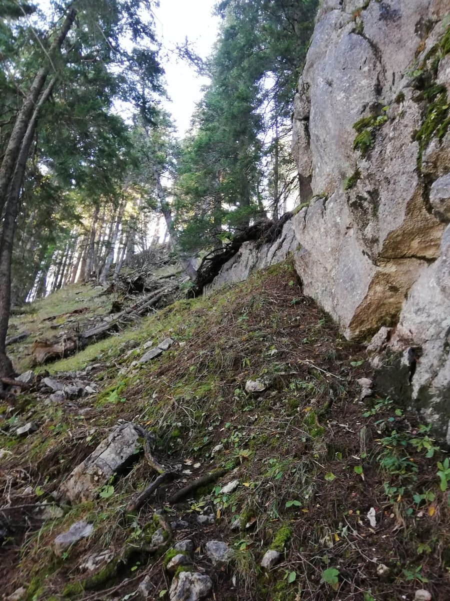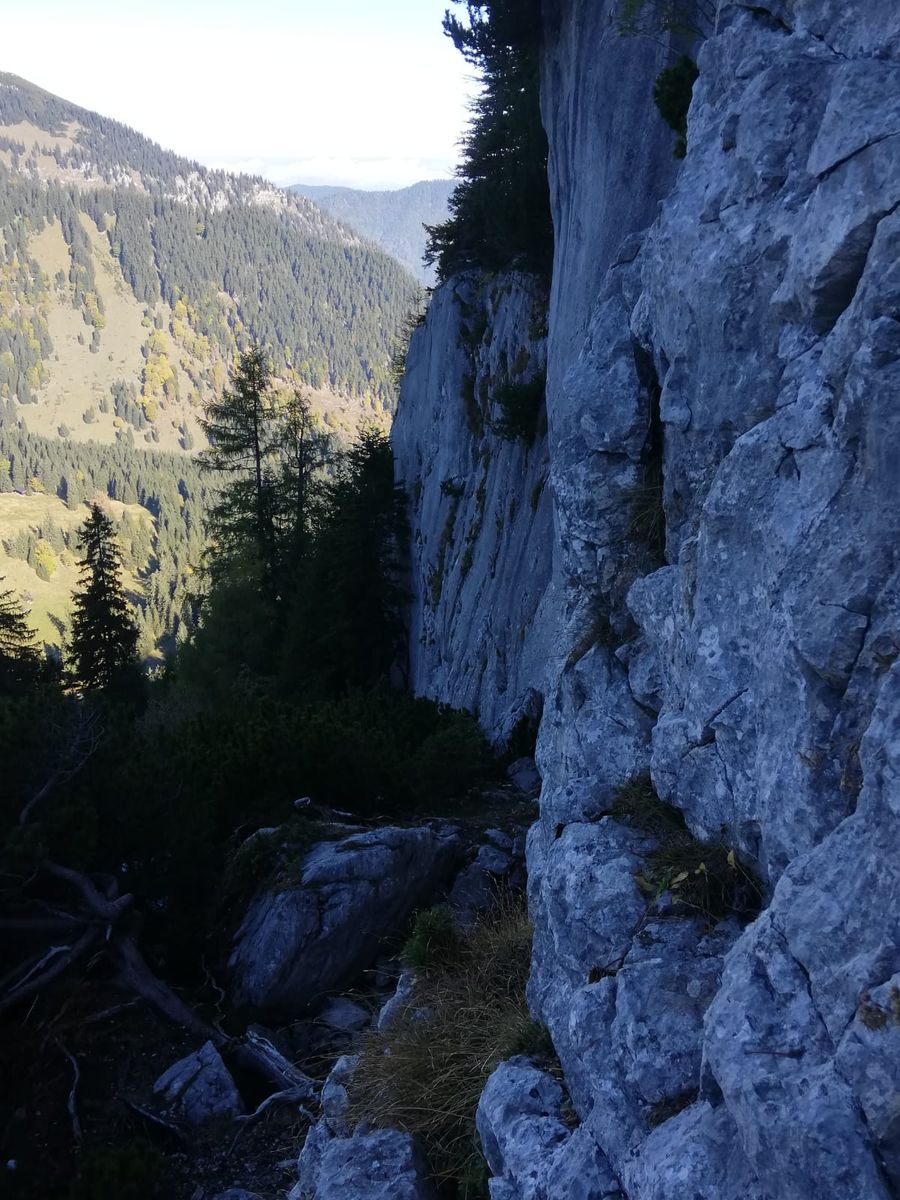 Vom Parkplatz über Siebli- und Riedereckalm zum Riederecksattel. Von dort nach rechts über den grasigen Gratrücken zu den Felsen bis zu einem Kamin, der etwa 4m hoch ist und in dem eine Reepschnur als Hilfe hängt. Durch den Kamin hoch (II) auf einen Absatz. Jetzt ist man nur noch höchstens 20m vom Gipfel entfernt, aber die ersten ca. 6m sind senkrecht und schwer (geschätzt IV). Deshalb auf einem Grasband am Fuß der Felswände (Klettergarten) ein längeres Stück bergab, bis die Felsen aufhören und man über sehr steile Gras-/Waldhänge weglos (eine Spur ist erahnbar) hoch zum Nordgrat steigen kann. Über diesen, am besten direkt am Grat (eine Stelle I) , auch wenn ein paar Latschen kommen, weglos zum Gipfel.