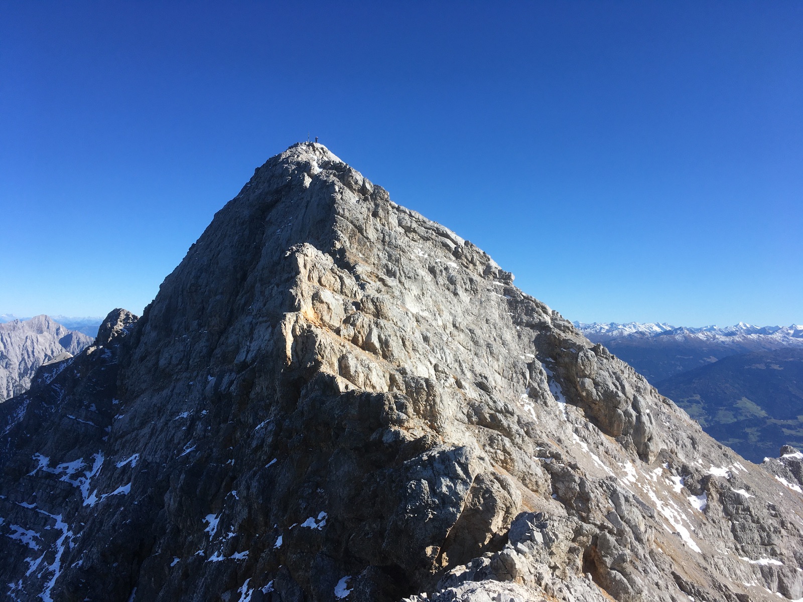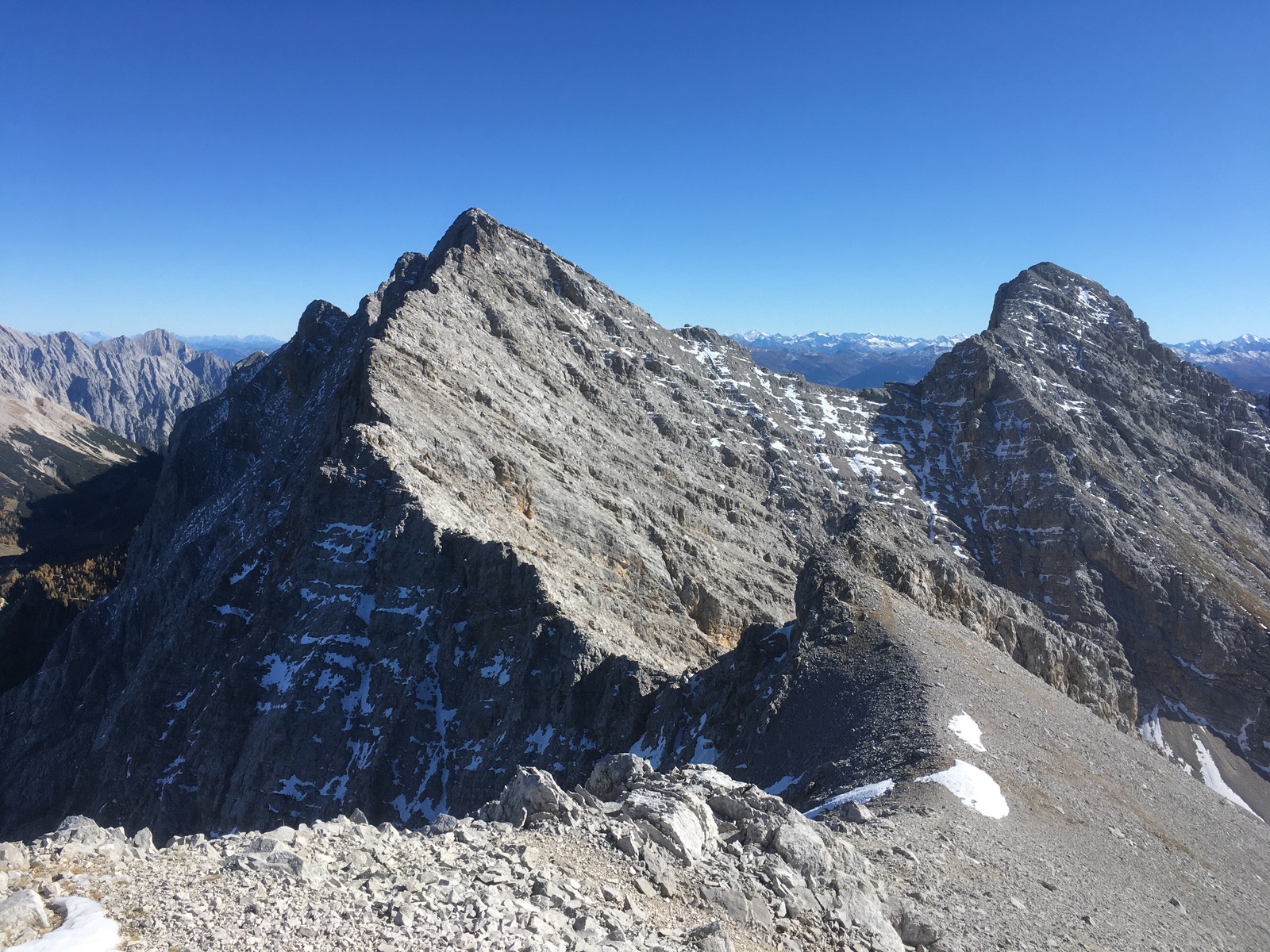 Der Normalweg von der Hinteren Bachofenspitze hat in dem Kamin Schnee / vereiste Stellen, ging aber auch noch ohne Steigeisen.