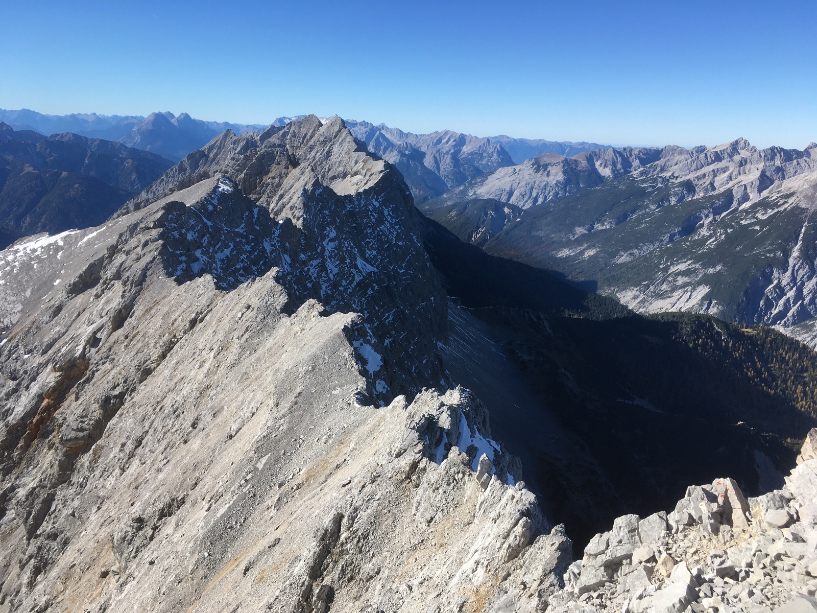Gestern ging es ins überraschend einsame Karwendel - die meisten waren wohl schon weiter nördlich "hängengeblieben"? Von Mittenwald mit dem Radl nach Scharnitz und dann das Pfeistal hinter bis zum Radldepot der (geschlossenen) Pfeishütte - es fuhren / schoben auch noch zwei weiter, aber ziemlich mühsam. Kurz vor der Pfeishütte gilt es die unmarkierte Abzweigung ins Sonntagskar zu finden. Aus diesem dann teilweise ordentlich steil, meistens aber im Gehgelände auf den Südkamm und zuletzt wieder flacher zum Gipfel. Nur an ganz wenigen schattigen Querungen Schnee, Steigeisen waren auch wegen guter Stapfen nicht erforderlich. Im Schatten (im Tal) sauber kalt / teilweise vereist, in der Sonne ordentlich warm, nur am Gipfel mit Wind nicht so griabig.
