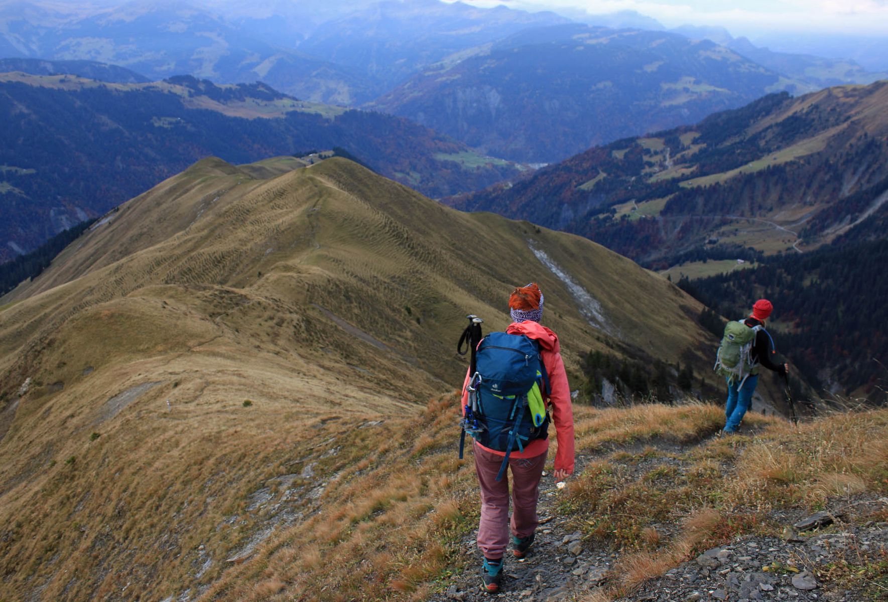 Den Abschluss der schweizerisch-österreichischen Traumrunde bildet die Überschreitung des Gamsluggen Sattel (nordseitig Schneereste, südseitig schneefrei) und ein wieder extrem aussichtsreicher und einsamer Abstieg über einen langgezogenen freien Bergrücken hinab nach Schuders, wo man mit dem Bus ins Tal fahren kann oder (wie wir) zu Fuß nach Schiers absteigt.