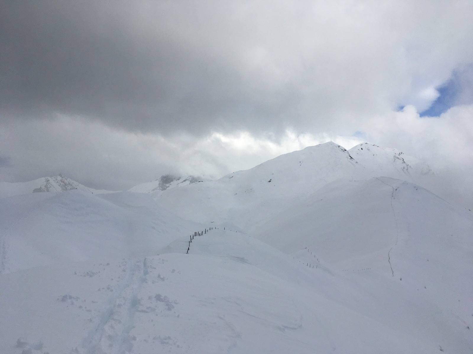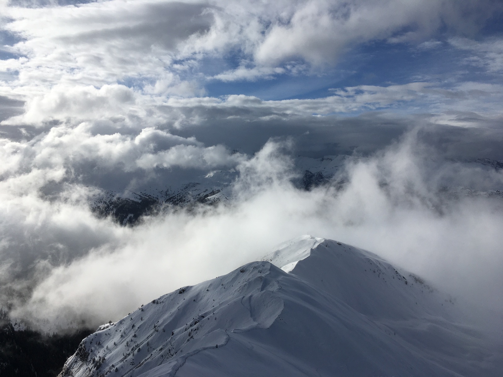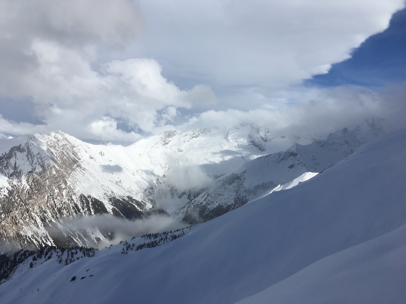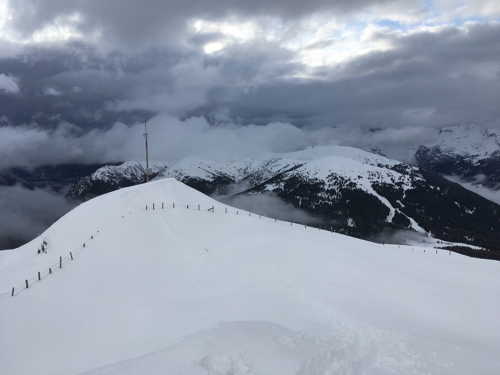 Abfahren kann man direkt vom Gipfel. Ich hatte die uralten Steinski genommen, wäre aber nicht nötig gewesen. Mangels komplett gesetzten Fundaments spürt man die Bodenunebenheiten natürlich schon noch, dennoch besser als gedacht. Nach der Zwischenabfahrt in das Tälchen auf ca. 2.080 m gab es dann noch mühsame Spurarbeit zum deutlich seltener bestiegenen Padauner Berg. Am Nachmittag dann durch die Tageserwärmung der Schnee unterhalb von ca. 1.800-1.900 m schon schwerer geworden. Dafür war die Fahrt ins Tal von Padaun dann stressfrei.