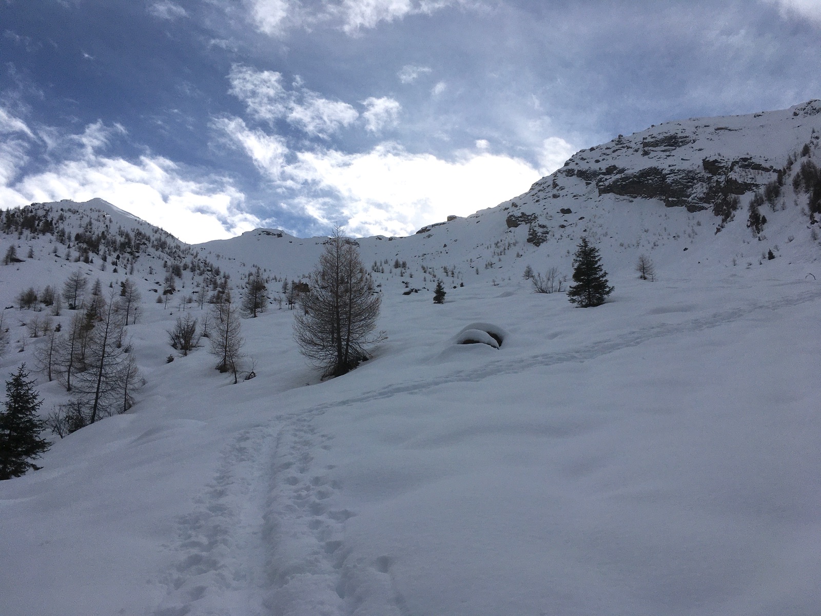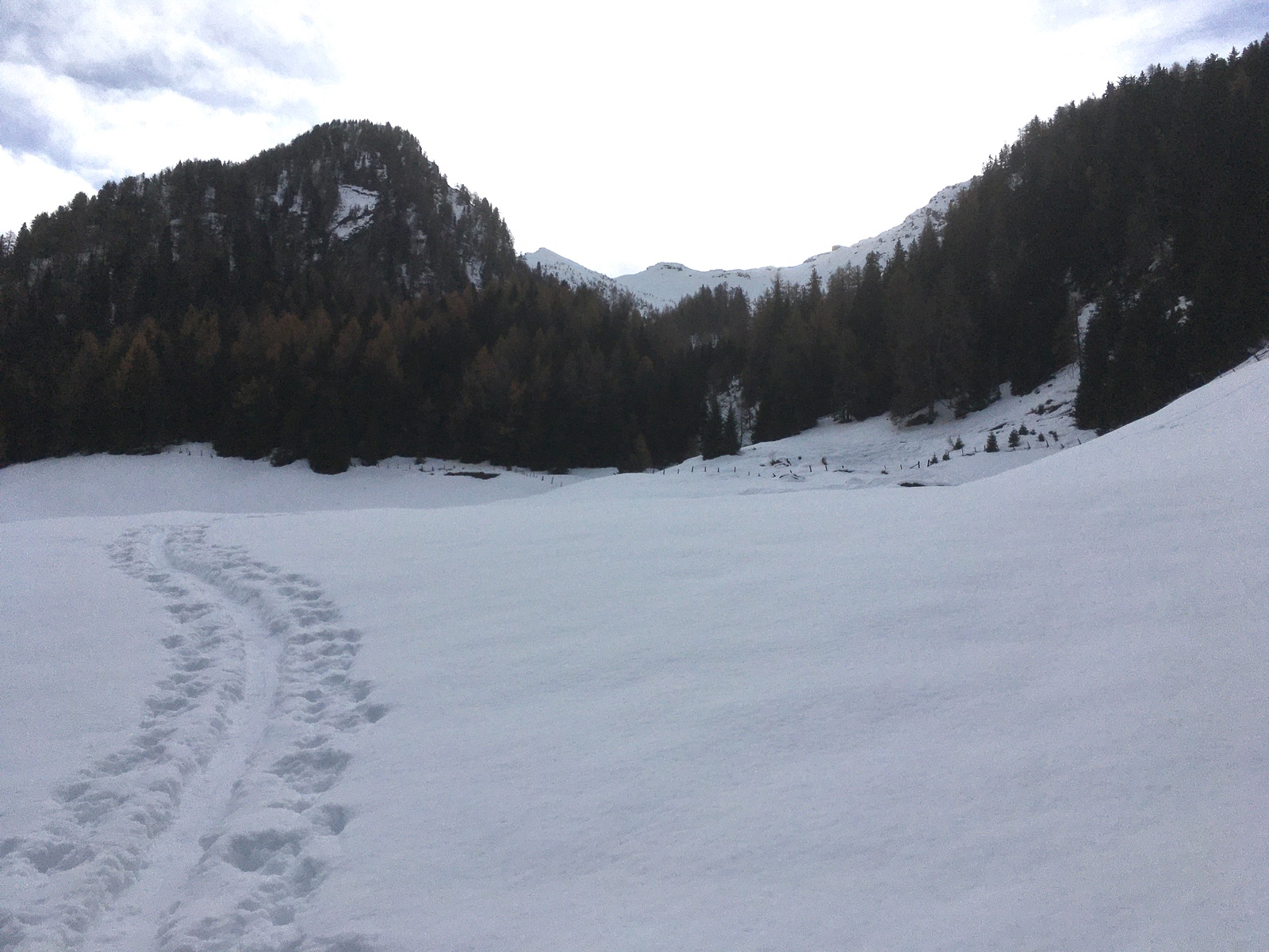Die Abfahrt war auf den ersten 150 Hm schön pulvrig, dann im Mittelteil etwas schwerer Schnee aber passabel zu fahren. Die Steilstelle und den Bachgraben konnte man überraschenderweise auch fast ohne Bodenkontakt durchrutschen. Hatte mich auch getraut, die besseren Skier zu nehmen und wurde nicht bestraft.