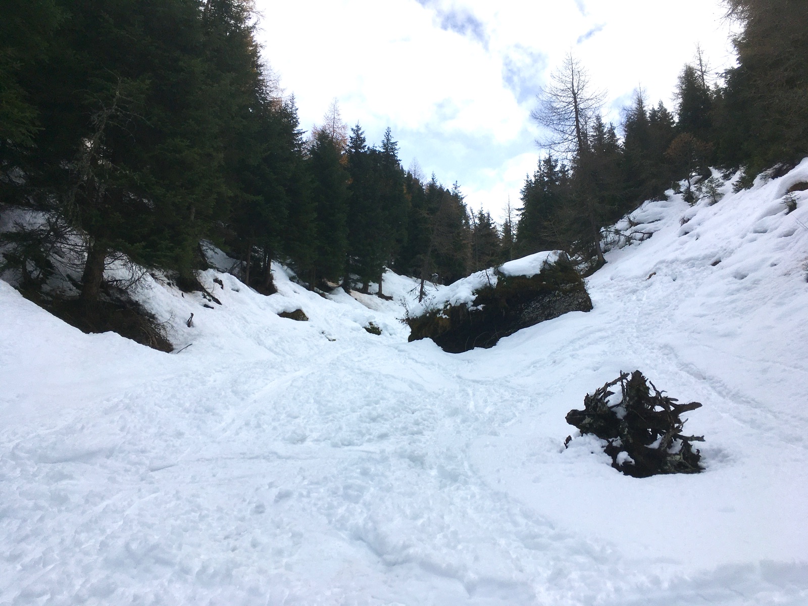 Der Bachgraben ist etwas mühsam, ging aber ohne Schäden an den Skiern: