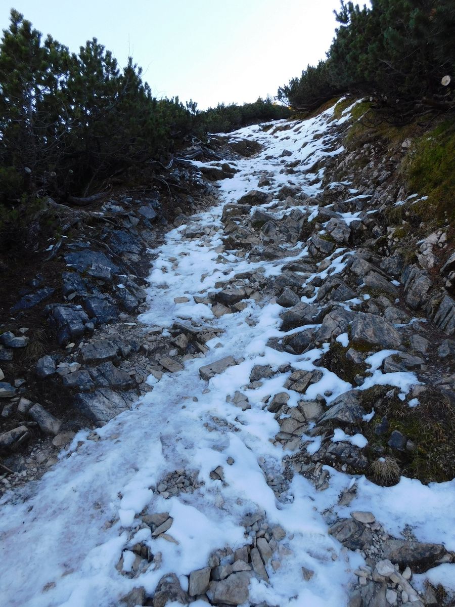Die etwas vereisten Stellen auf der Nordseite zwischen Kramerspitz und Mittergern sind im Abstieg etwas anspruchsvoller als im Aufstieg, aber mit genug Schnee-Touren-Erfahrung ging das gut zu gehen (meine Steigeisen sind im Rucksack geblieben). Wenn man nicht ganz trittsicher ist oder keine guten Sohlen hat, sollte man aber lieber Grödel/Spikes mitnehmen. Auf der Südseite war die Tour komplett schneefrei.
