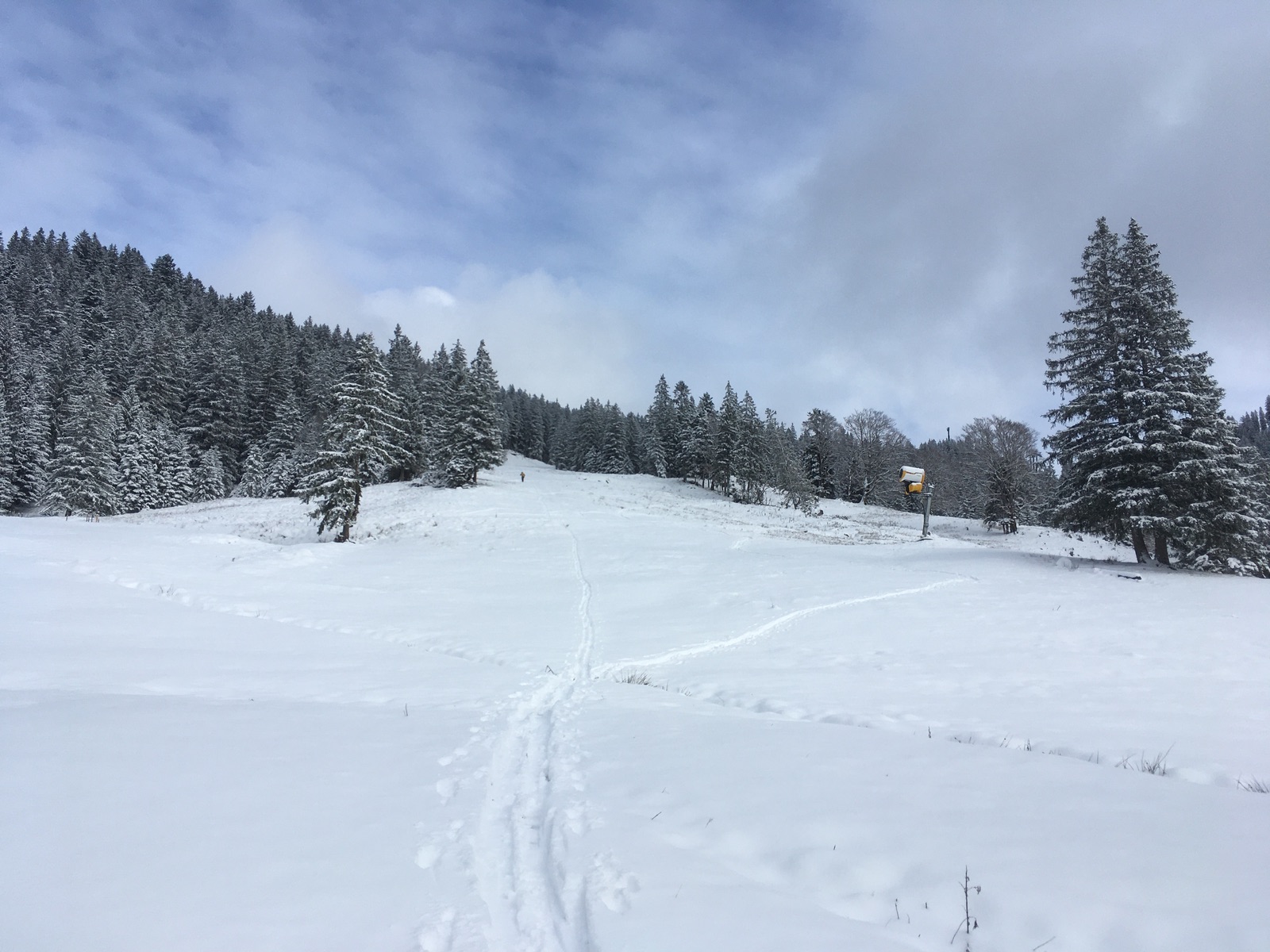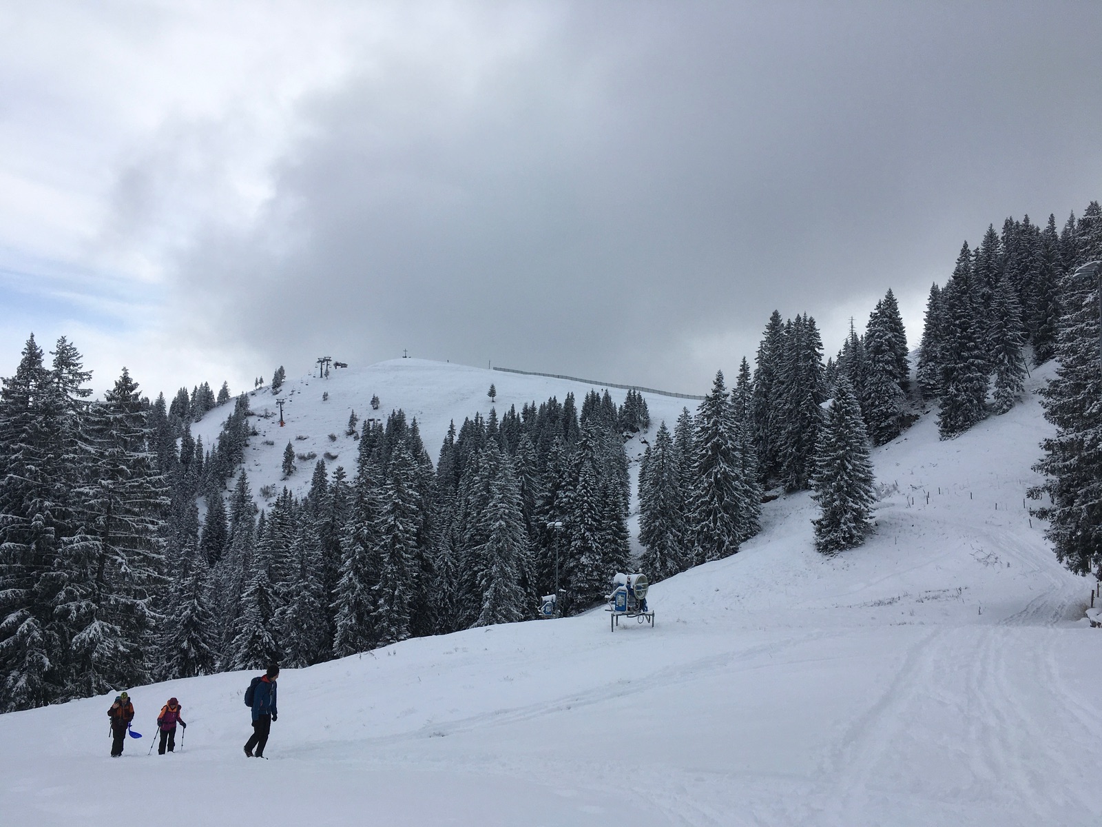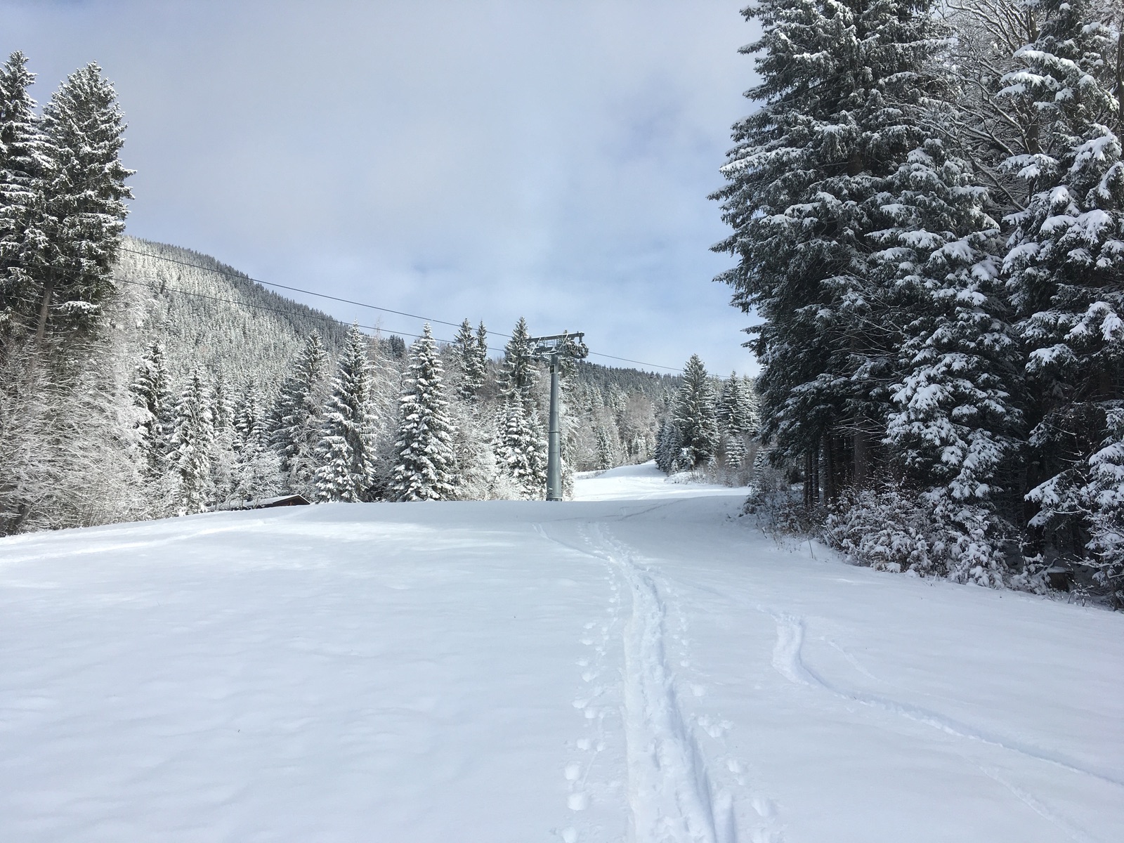 In der Hoffnung auf ausreichend Neuschnee und nicht allzugange Anfahrt ging es heute in die Sutten (Mautstraße 3 Euro, heute ohne Schneeketten machbar). Gegen Mittag waren sogar Auflockerungen dabei.