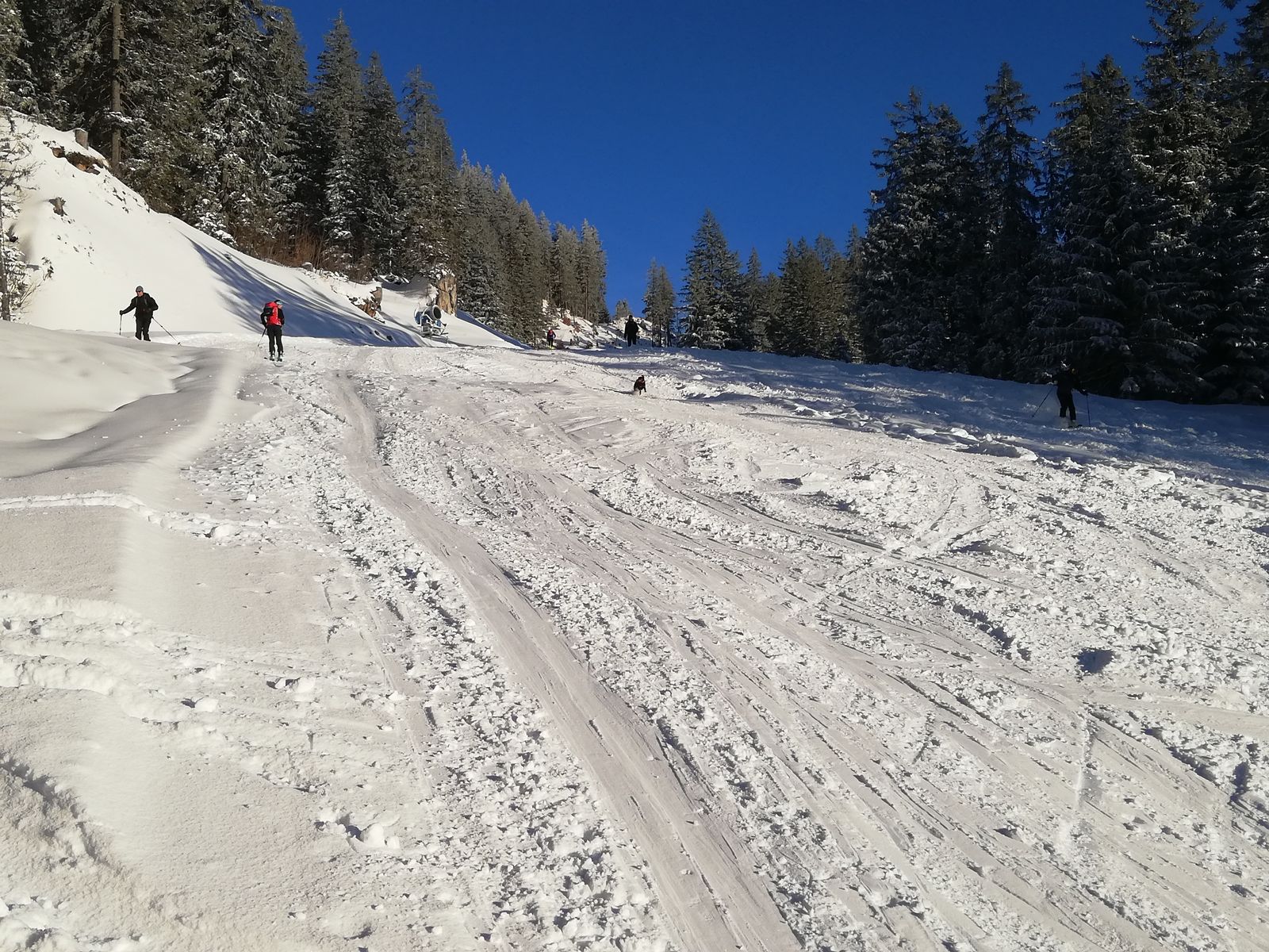 Am Nachmittag wurde es heute noch sonnig. Die Piste ist gewalzt und gut zu befahren. Auch neben der Piste genug Schnee, um weitgehend ungefährdet runter zu fahren. Überwiegend Pulver, aber dazwischen auch öfter mal Harsch. Die Schnekanonen liefen hier nicht, wohl aber auf der Ostseite des Stümpflings.