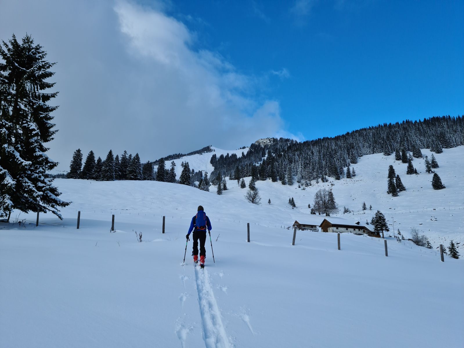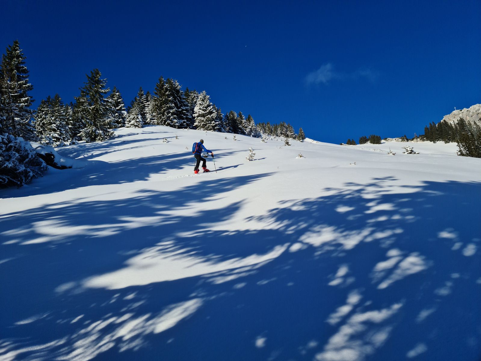 Gefahreneinschätzung: Der Neuschnee ist überwiegend ohne Windeinfluss gefallen, im Windschattenbereich des Rückens gab es aber einige Triebschnee-Inseln, denen man Beachtung schenken sollte.
