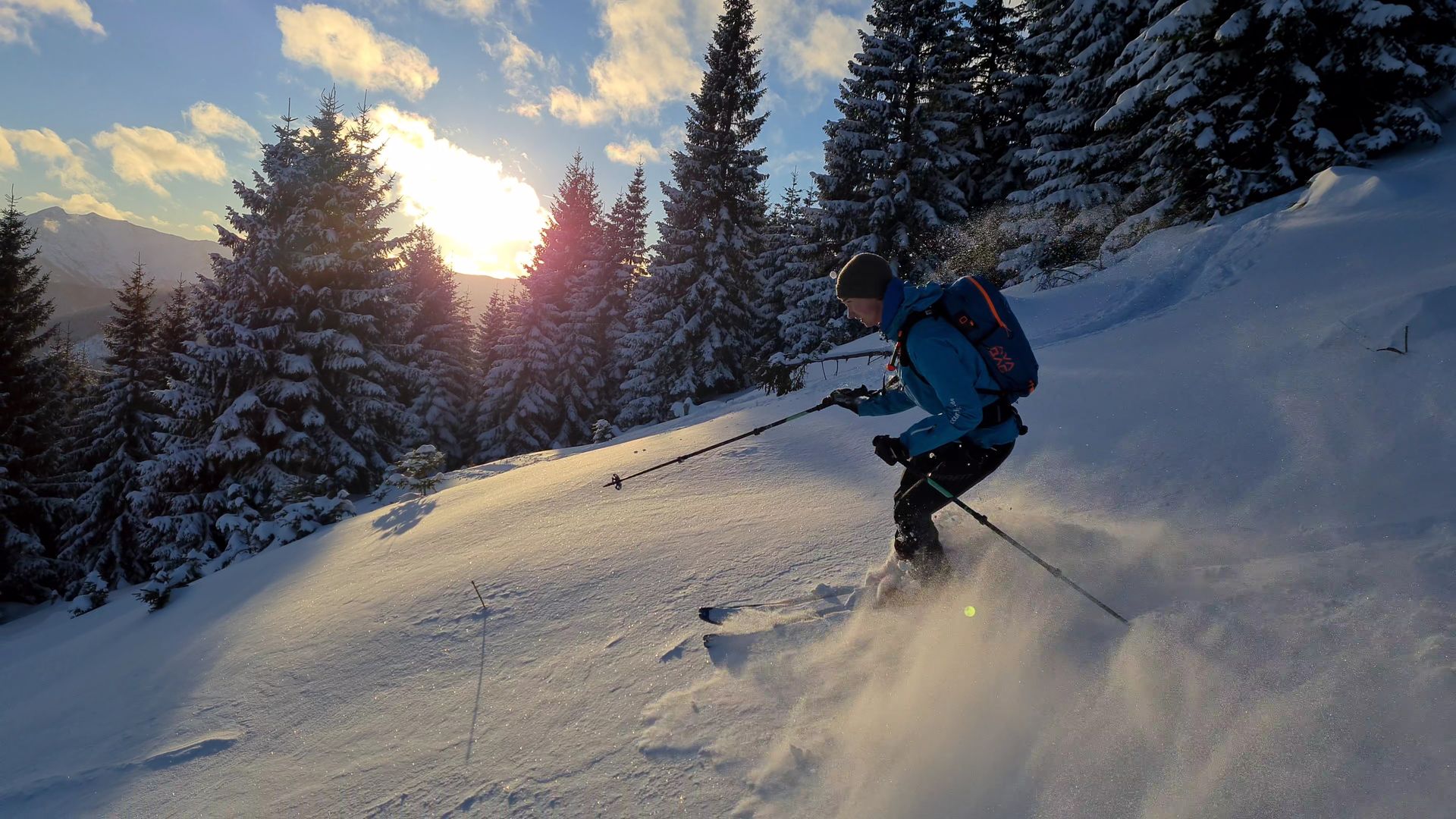 Bedingungen: Beim Start gegen Mittag hat es schon immer mehr aufgelockert, später dann Sonne pur und kalt. Unten lagen ca.10 bis 15 cm sehr schön pulvriger Neuschnee, in der Höhe auf gut 20 cm anwachsend. Das alles auf einem fast überall tragenden Harschdeckel. Zu unserer großen Überraschung waren wir zunächst völlig alleine unterwegs. Wir durften von unten bis oben spuren und auch die First Line ziehen. Mit etwas Umsicht keine Feindberührung, wir hatten in der Abfahrt überwiegend Top-Bedingungen!