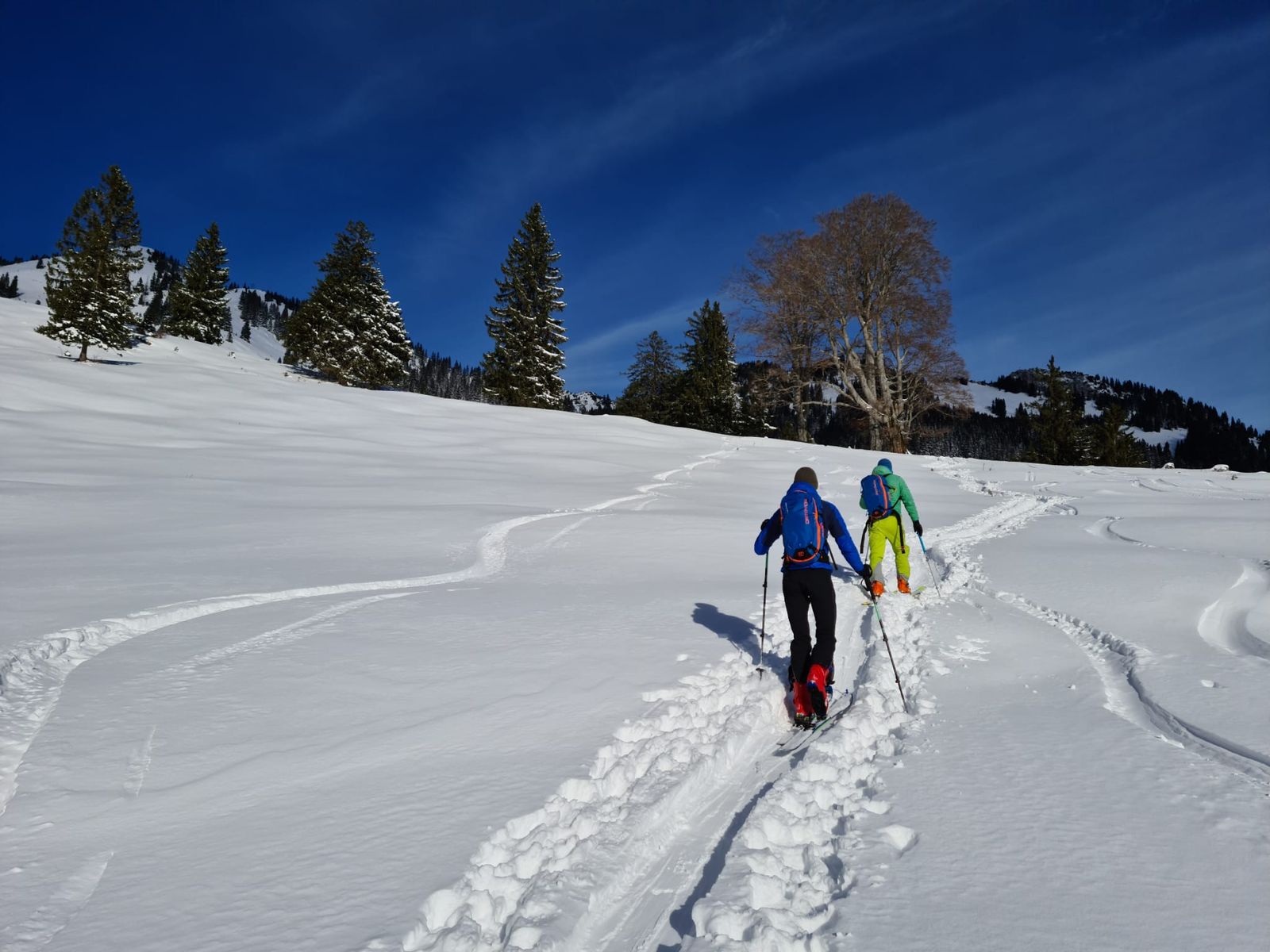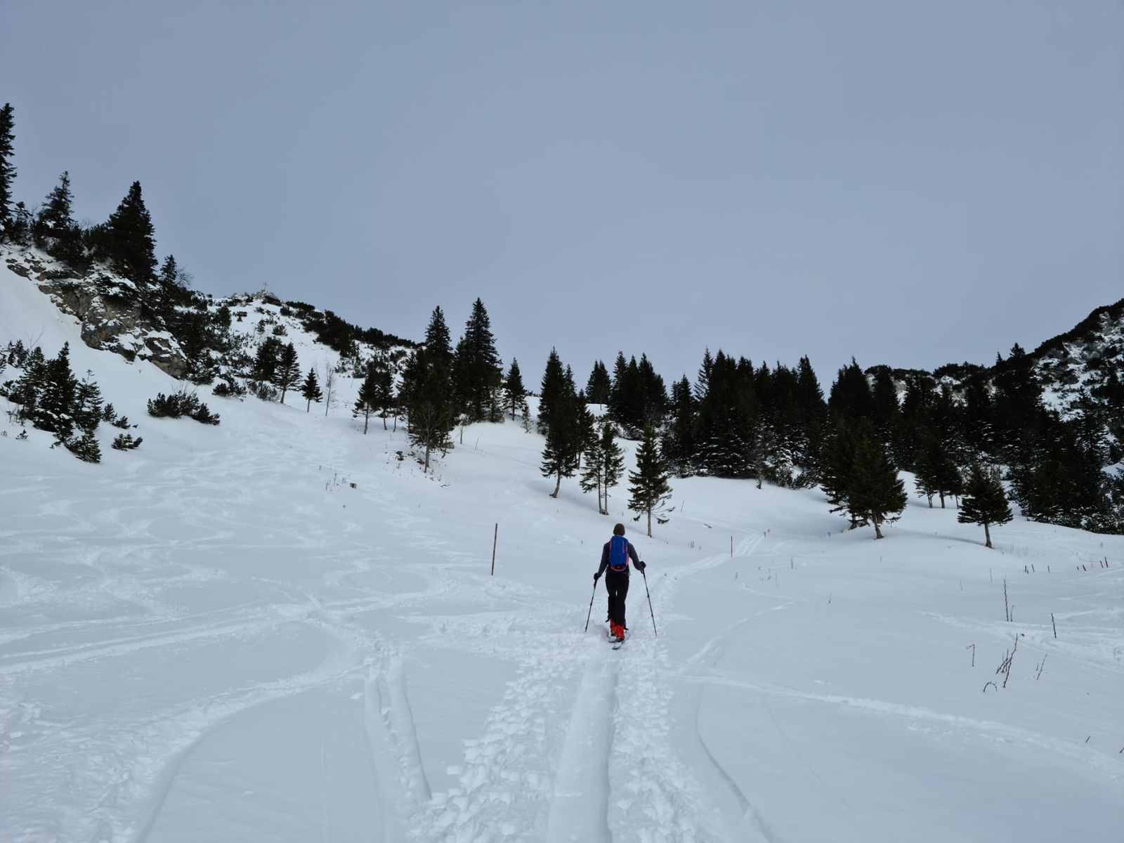 Tourenverhältnisse: Nicht ganz so toll wie vor 2 Tagen am benachbarten Wildalpjoch. Trotz des neuerlichen Schneefalls muss man hier doch mit der einen oder anderen Feindberührung rechnen. Dazwischen aber immer wieder sehr gut - insbesondere in den Flachpassagen und im unteren Bereich. Schnee unverändert pulvrig (stellenweise ganz leicht windgepresst) auf harschiger Unterlage. Wind stark, daher neue Verfrachtungen, die uns von Varianten abgehalten haben.