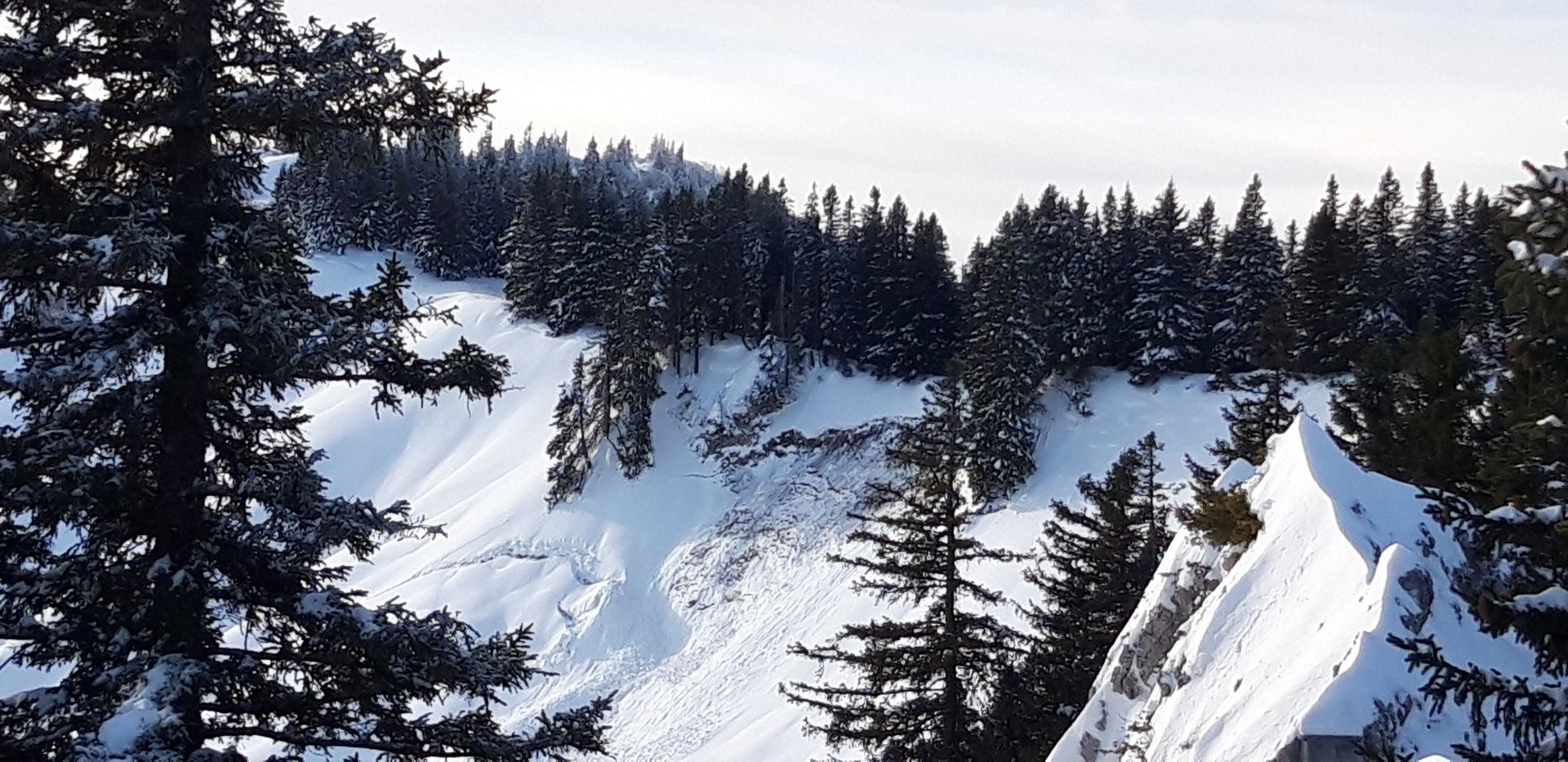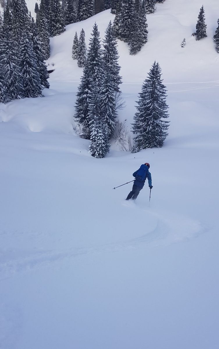Zur Lawinenlage: Alle unsere Abfahrten (nord- und westexponiert) waren aus meiner Sicht total sicher: fluffiger, völlig ungebundener Pulver, der ohne Windeinfluss gefallen ist. Anders schaut es bei den Osthängen aus, in denen viel Triebschnee lagert und sich Gleitschneemäuler sowie spontane Lawinenabgänge zeigen. Klausen Ost ist zum Beispiel schon ziemlich ramponiert (siehe Bild). Das mit den Osthängen kann man, glaub ich, zurzeit verallgemeinern - war ja gestern am Rosskopf auch schon so.