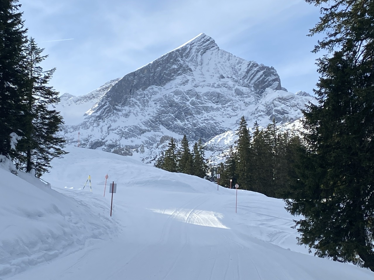 Also disponierte ich in der Früh kurzfristig um, stellte den Steinski wieder weg und fuhr mit den guten Brettern nach Garmisch. Dort beginnt am Freitag der kommerzielle Pistenbetrieb, also herrschte heute noch angenehme Ruhe. Und weil schon viel präpariert wurde, störte der Regeneinfluss kaum.