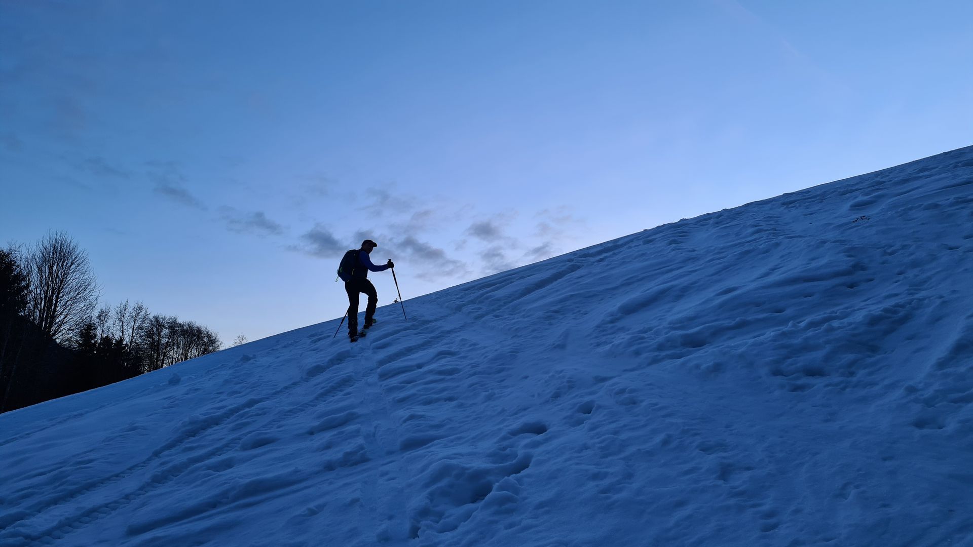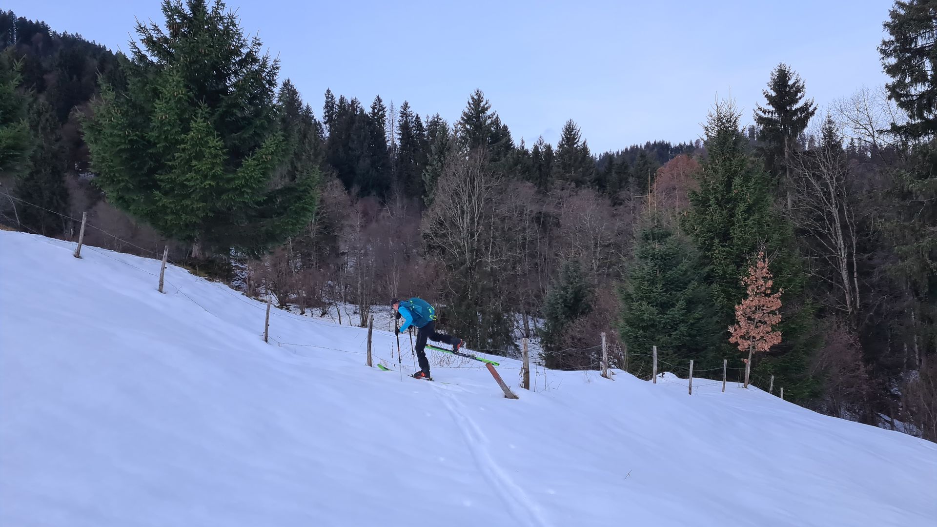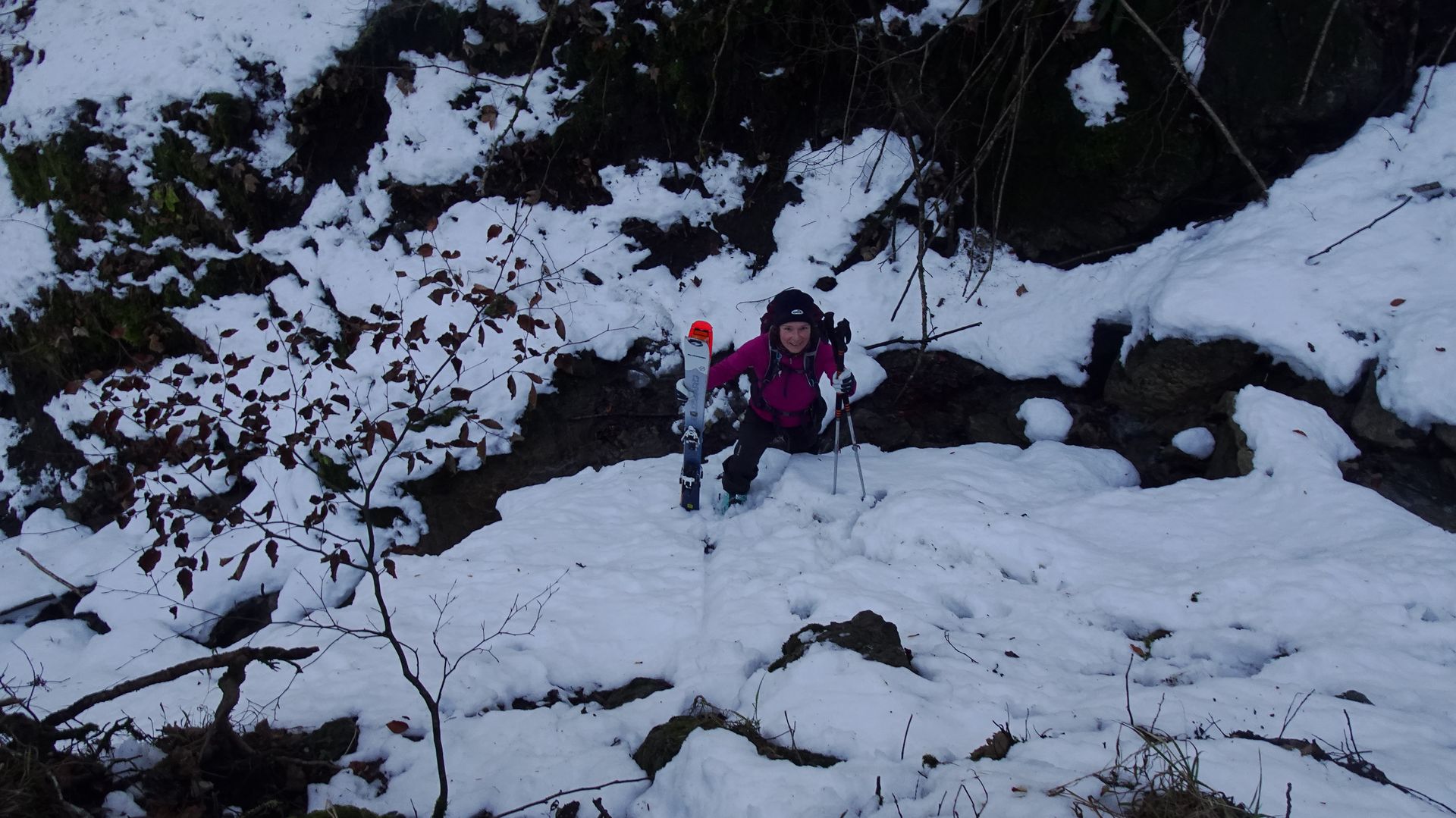 Da wir aufgrund fehlender Harscheisen keine Lust aufs Rumrutschen hatten, sind wir anfangs die flachere Kochelbergabfahrt hinaufgestiegen. Wir wollten aber unbedingt aus nostalgischen Gründen auch an der Tonihütte vorbeikommen, also ging es im Gebiet unter Fuchslern nach rechts raus auf einen vermeintlichen auf der Karte eingezeichneten Wanderweg, der natürlich im Schnee nicht zu erkennen war. Es ging durch den Wald, mit den Ski in der Hand in ein Bachbett hinein und wieder hinaus, um dann doch nach einer kleinen schneefreien Wald-Wanderung in Skistiefeln am Hang unter der Hausbergbahn rauszukommen. Ski wieder angeschnallt, ein paar Meter runterfahren und schon waren wir wieder auf der gewünschten Route zur Tonihütte. ![]()