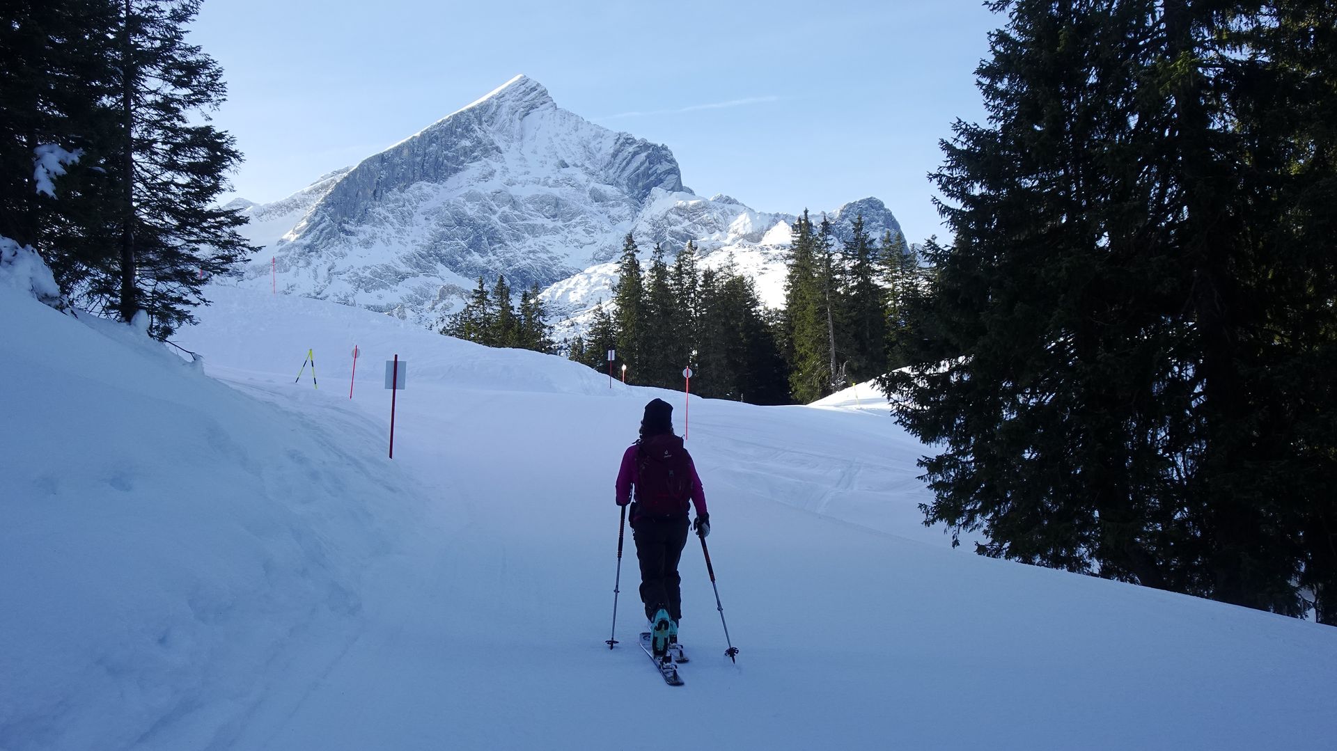 Heute haben die letzte Gelegenheit vor der morgigen Öffnung des Garmisch-Classic-Skigebiets genutzt und sind früh morgens fast allein Richtung Kreuzjoch aufgestiegen.