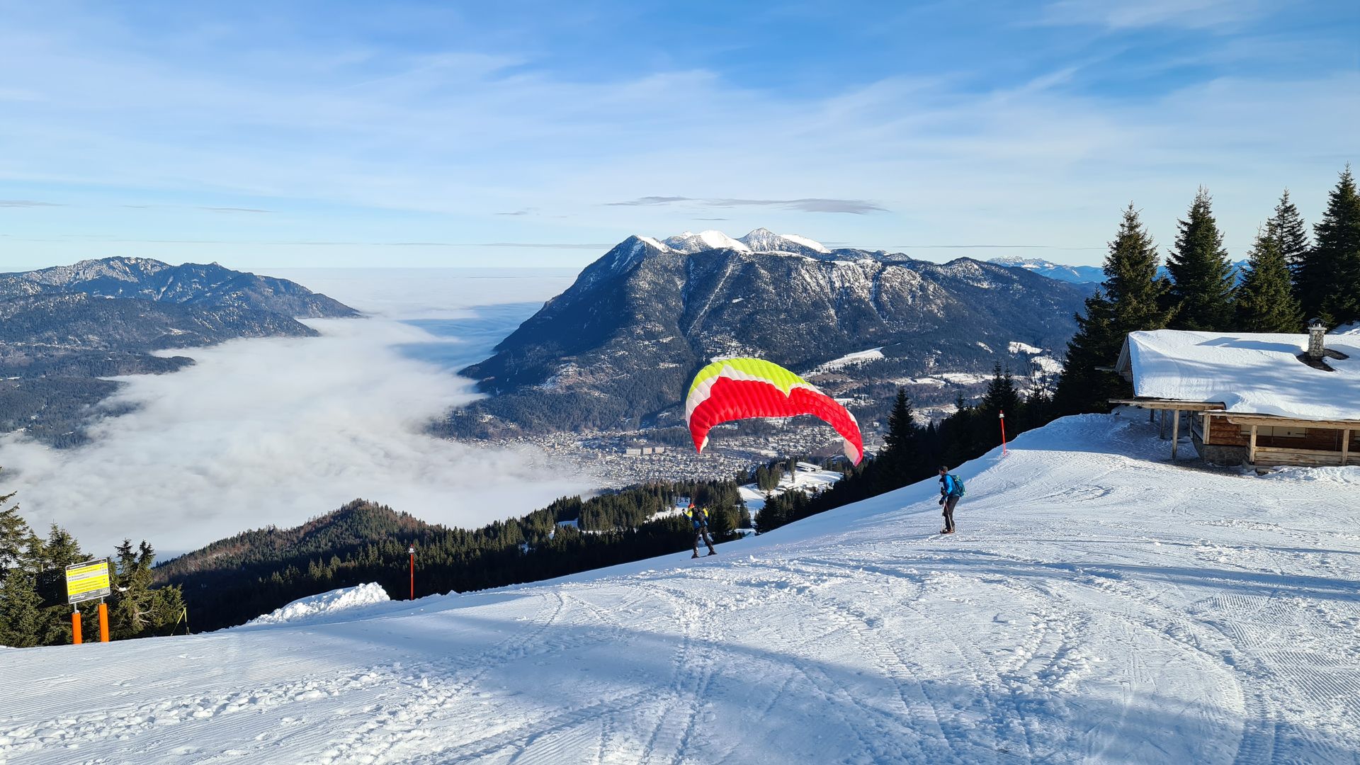 Über das Kreuzeckhaus ging es hinauf bis zum Kreuzjoch, dort erstmal die geniale Aussicht auf die Alpspitze mit Sonne pur und Blick auf den über Garmisch hineinziehenden Nebel genießen. Hinunter erst ein Stück die Kandahar, dann rechts ab und bis zum Drehmöser auf super (Pisten)Schneeunterlage! Über die Kochelbergabfahrt trotz sehr ruppigem Untergrund eine schöne Abfahrt mit intensiver Muskelmassage.