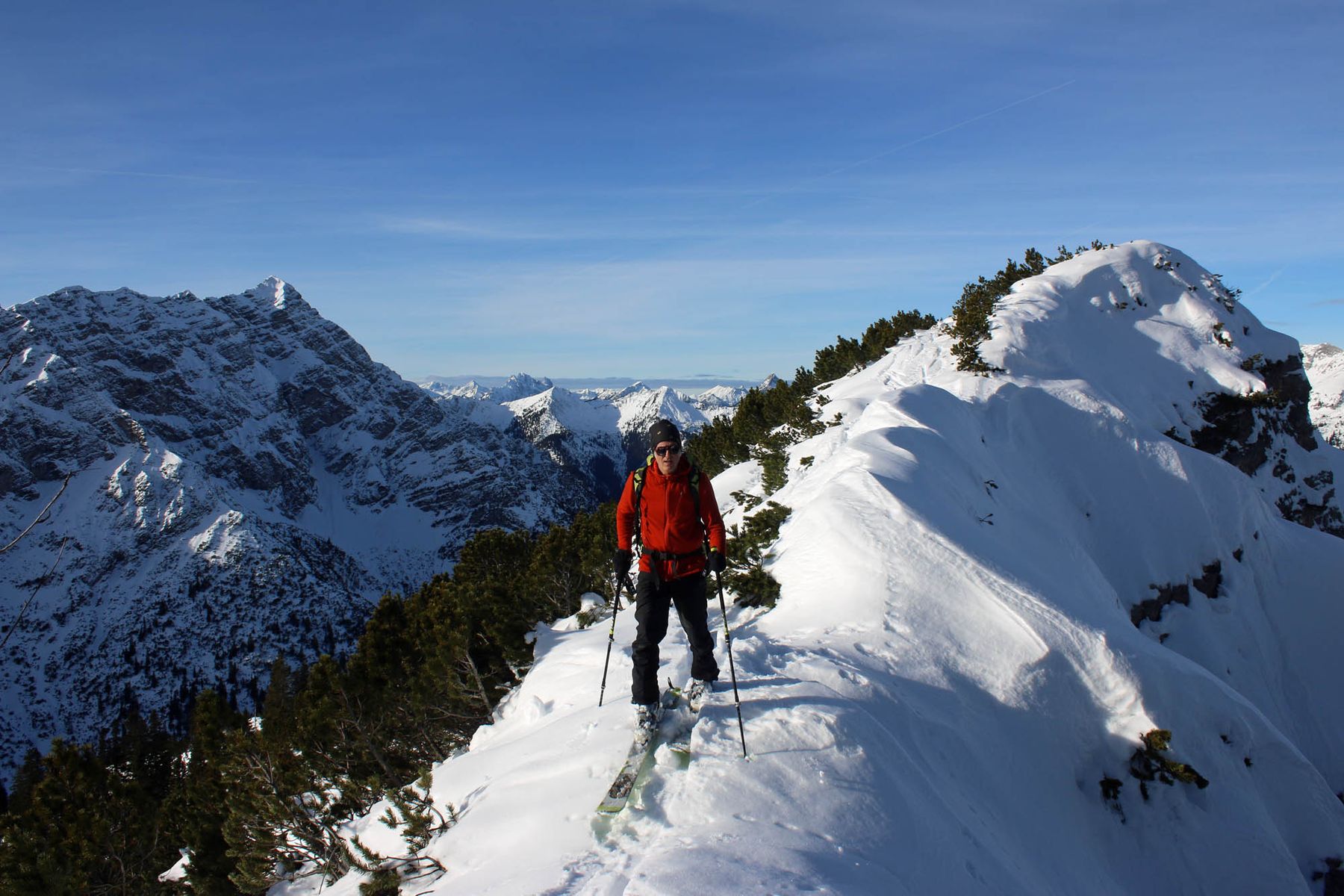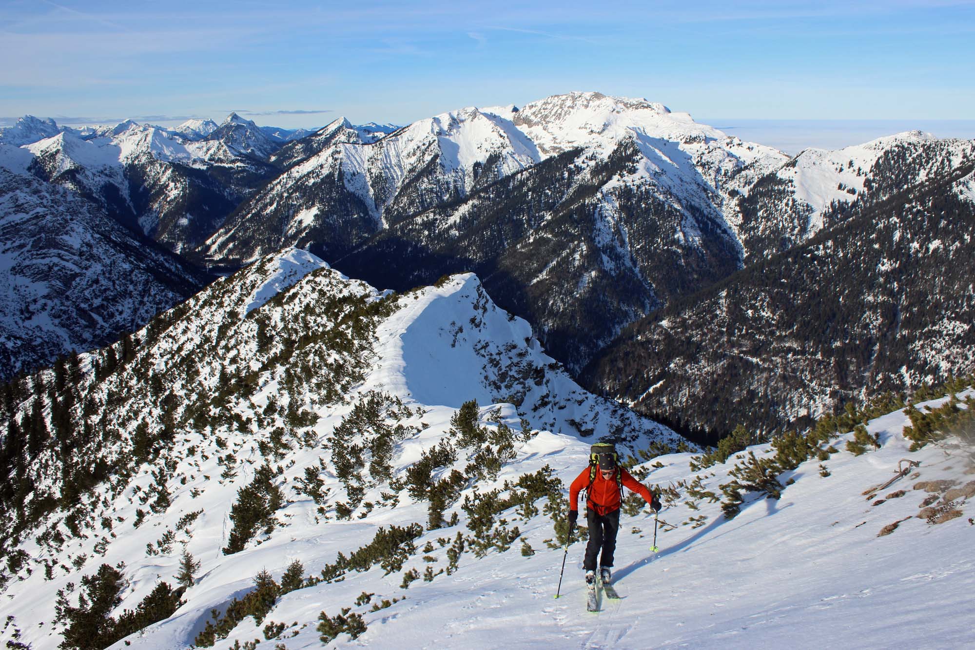 Der Powder vom Wochenende ist Vergangenheit. Heute brauchte man eine echt gute Skitechnik, um durch den nassen Tiefschnee stilvoll und sicher abzufahren. Denn der Schnee ist auch noch mit einer dünnen Harschkruste verziert. Vom Start ab und im riesigen Kar liegt genug Schnee. In den Latschenbereichen muss man aber mit Umsicht seine Spur legen. Wenn sich man am langen Kamm ganz oben hält, geht das sehr gut. Der anschließende Rücken war stark abgeblasen. Der Gipfelanstieg ist jetzt gespurt