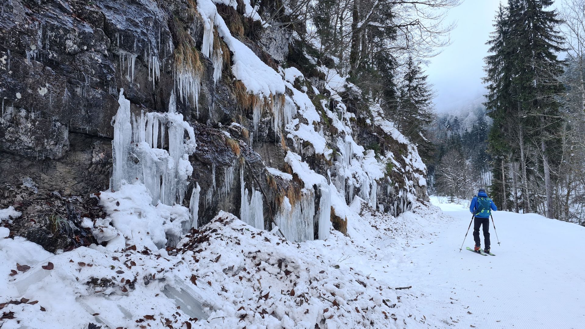 Wir haben – unter anderem wegen dem Abgasgeruch – den Abzweig auf 1022 m über die Brücke nach rechts über die Forststraße genommen. Sehr einsam, sehr schön, aber auch sehr flach und sehr lang. Im Nachhinein würde ich das Stückchen doch lieber über die Piste aufsteigen als diesen ellenlangen Schlenker zu nehmen. Eine sehr gute Spur war vorhanden. Der Schnee neben der Spur war harschig, mit einem anfangs nicht tragenden und weiter oben auch tragendem Deckel.