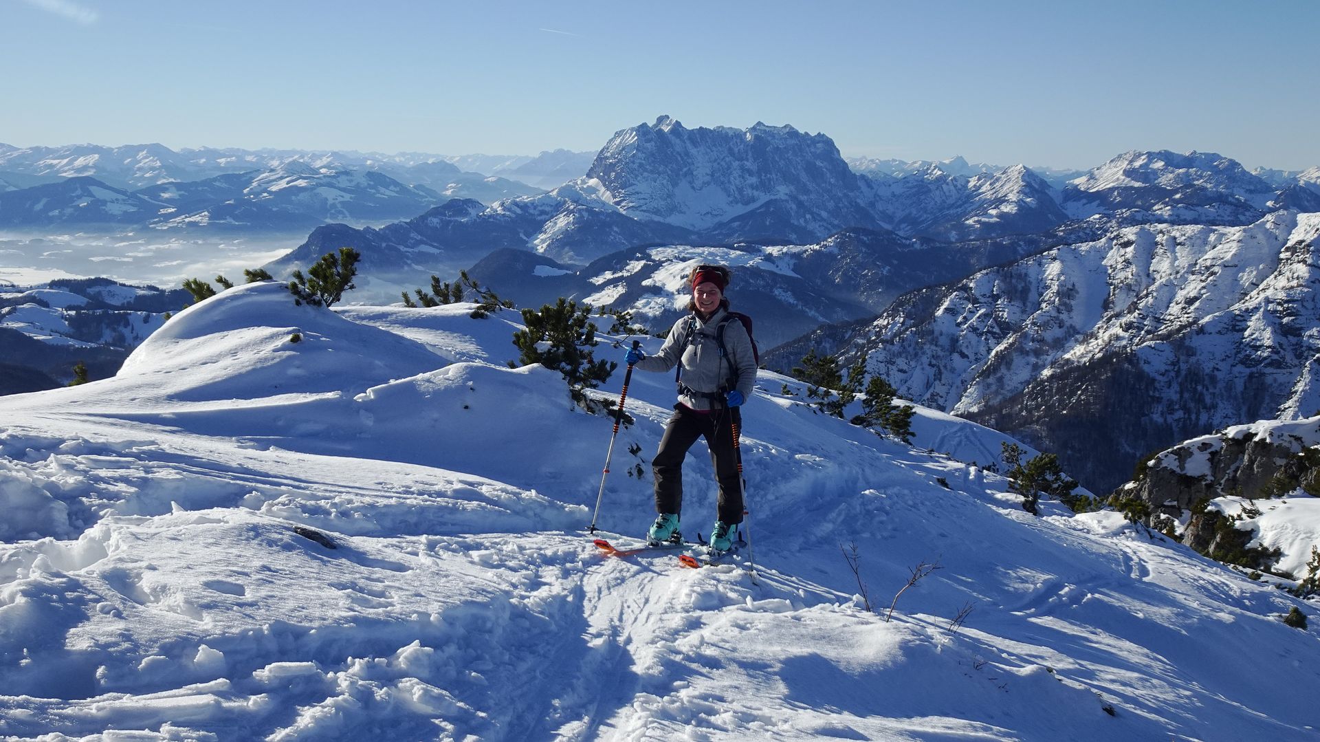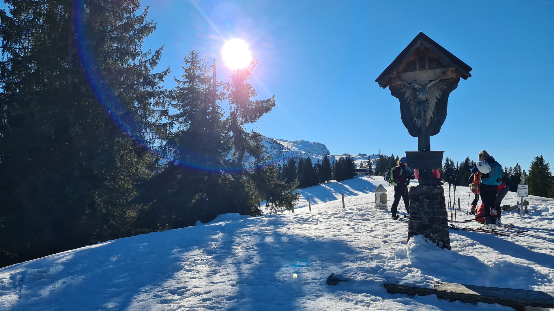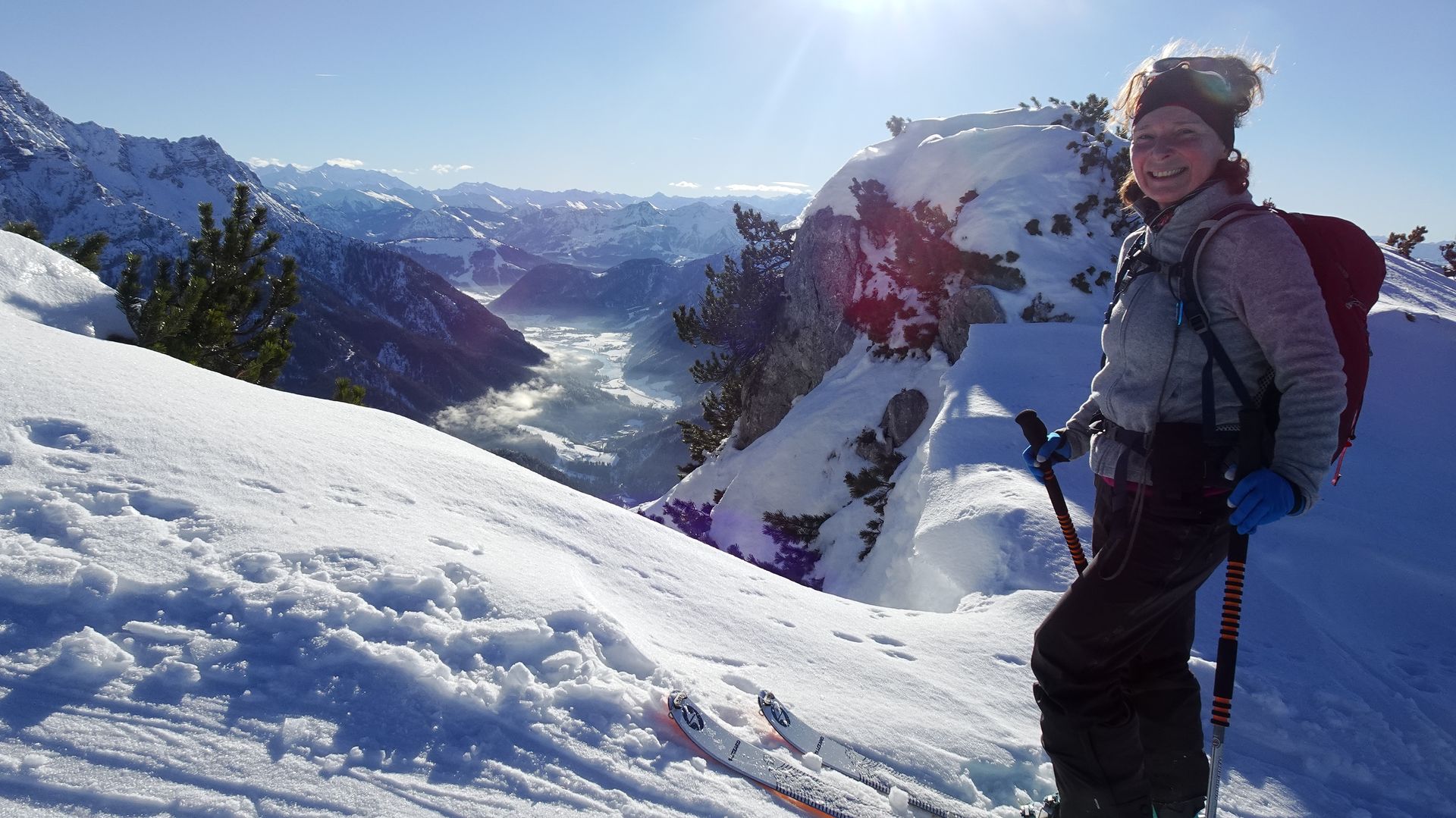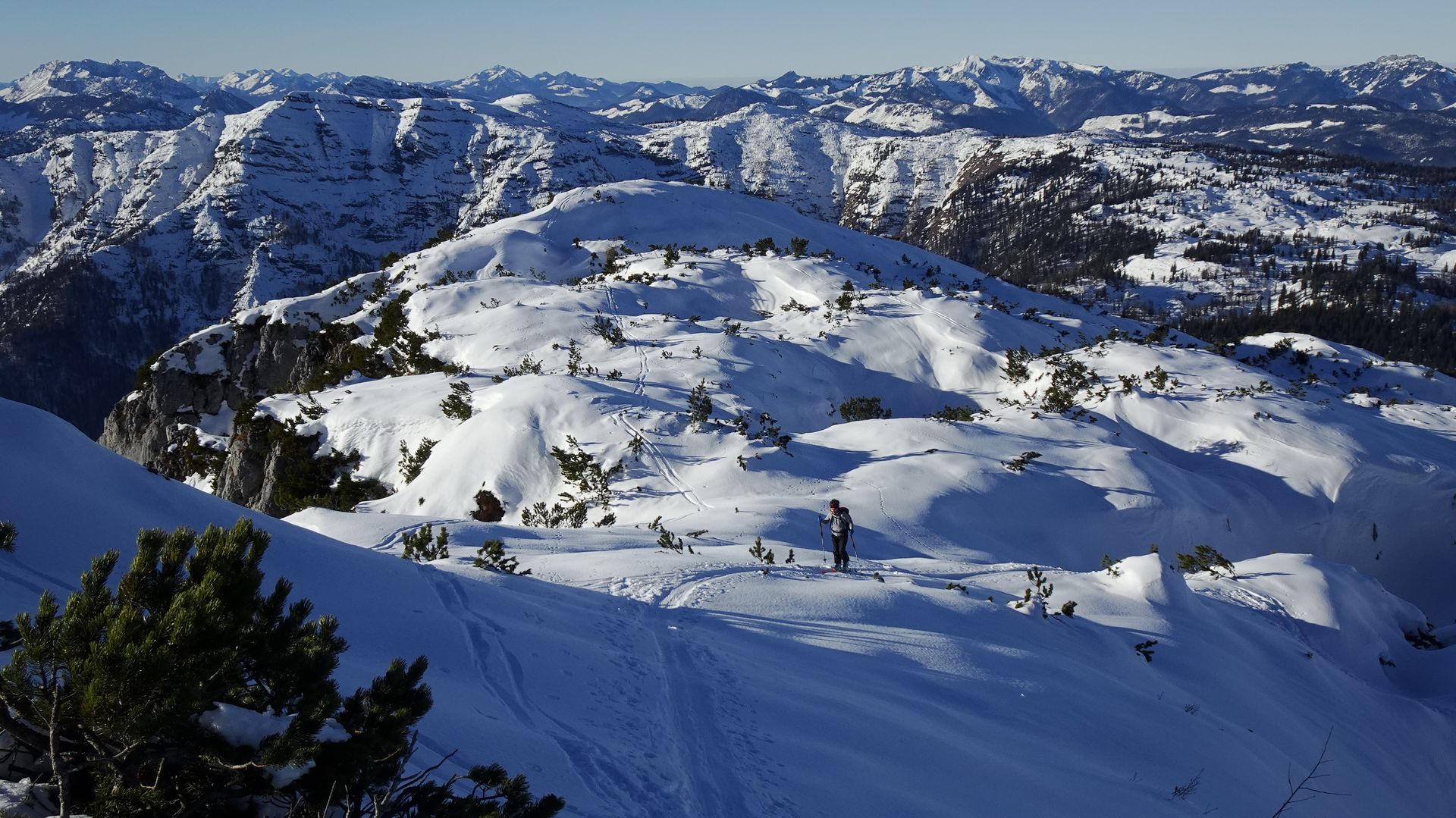 Ab dem Scheibelberg bis hinauf zur Steinplatte war dann deutlich mehr los. Der Skizirkus war aber ganz erträglich, denn die gut angelegte Spur führt zu einem großen Teil auf nicht gewalztem Schnee neben der Piste und die Lifte im Skigebiet Steinplatte sind verhältnismäßig leise. Der Aufstieg war also durchaus ein Genuss. Beigetragen hat dazu sicher der herrliche Sonnenschein und die spektakuläre Aussicht schon beim Hochgehen. Im Gelände neben der Piste konnten wir uns wieder davon überzeugen, dass die beste Wahl für heute definitiv eine Pistenabfahrt war, denn der Schnee war Harsch und Bruchharsch vom Feinsten.