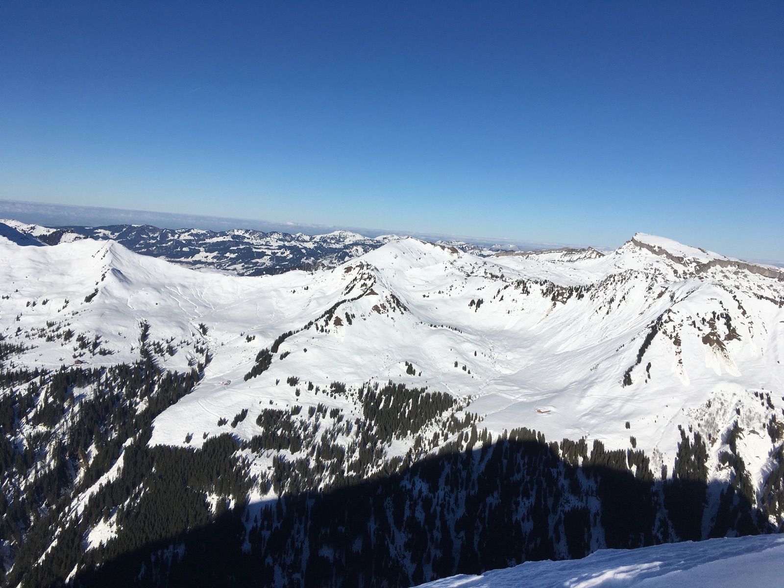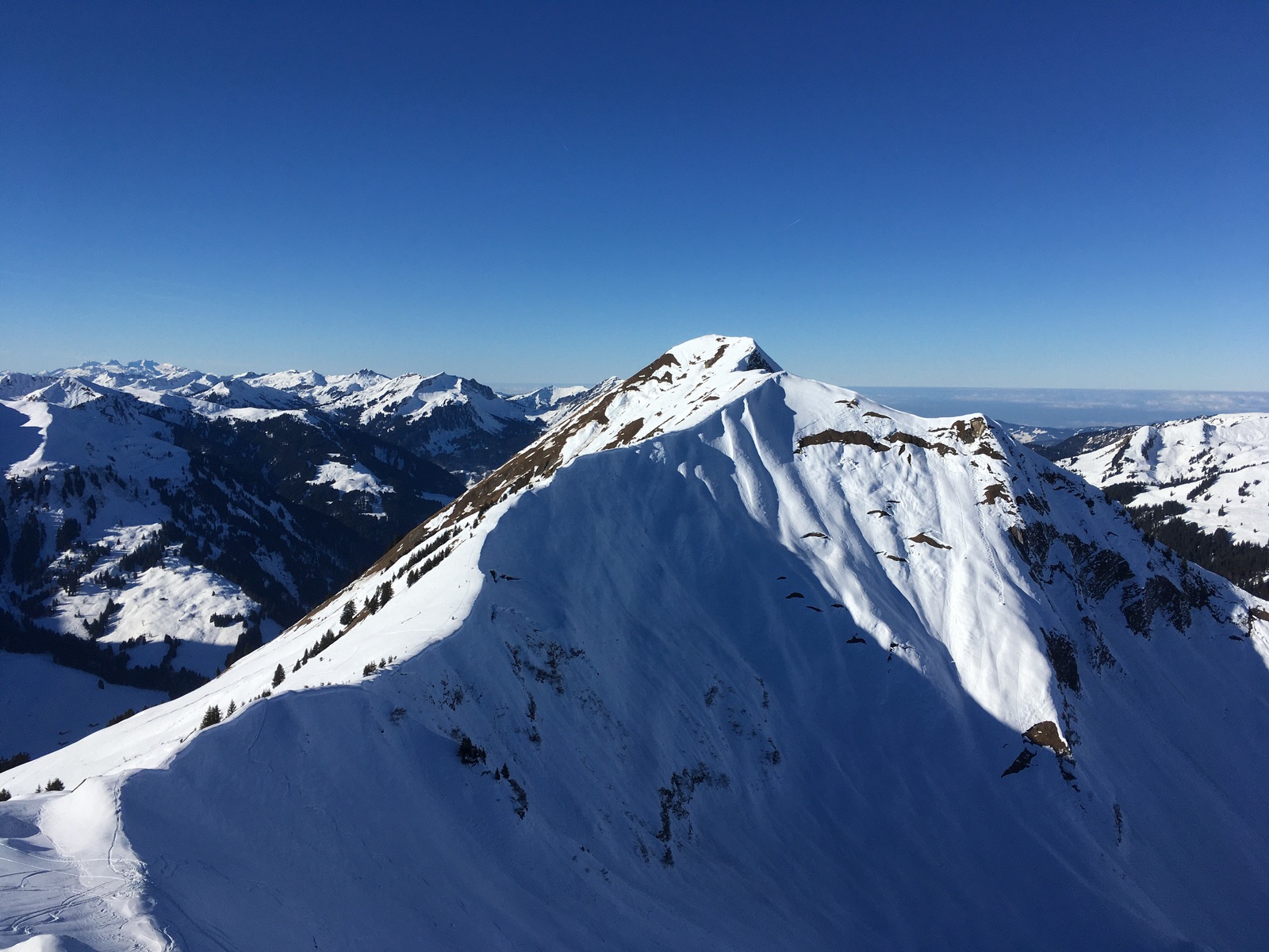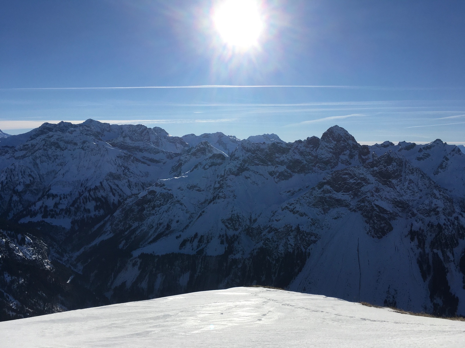 Heute gab es auf der anderen Talseite von Schoppernau zwei klassische Gipfel: Güntlespitze und Üntschenspitze. Schattiger Start über die Rodelbahn des Neuhornbachhauses, dann über die Pisi-Alm (immer noch im Schatten) mit 6x Lawinenkegel-Querung in das Häfnerjoch und dann zum heute überraschenderweise völlig verwaisten Gipfel der Güntlespitze. Der Südhang dorthin ist von Grundlawinen verunstaltet (betrifft den wesentlich häufiger begangenen Anstieg von Baad). Dann kurze Zwischenabfahrt und Aufstieg zur majestätisch über Schoppernau thronenden Üntschenspitze. Die Abfahrt von dort ist etwas mühsam, weil man nochmals gut 30 Hm hinaufhaxeln muss zur Einfahrt in das Nordkar. Dieses überraschend gut fahrbar, wenngleich kein perfekter Pulver. Unten dann wieder die Querung der Lawinenkegel. Anschließend sehr zügige Fahrt an der Pisi-Alm vorbei zur Rodelbahn und Aufstieg zum Neuhornbachhaus (endlich Sonne). Angesichts der Schneequalität sowie der fortgeschrittenen Tageszeit zog ich eine Einkehr dort der Besteigung des Falzerkopfs vor. Zurück bin ich dann über das Skigebiet Diedamskopf - dafür mit kurzen Zwischenabfahrten an der Falzalpe vorbei und dann die obere Spur nehmen. Im Sattel vor dem Skigebiet nicht der Aufstiegsspur nach oben folgen, sondern kurze Fellabfahrt nach unten und dann noch kurz zur Piste aufsteigen, falls man nicht im Gelände abfahren will (derzeit meistens Bruchharsch).