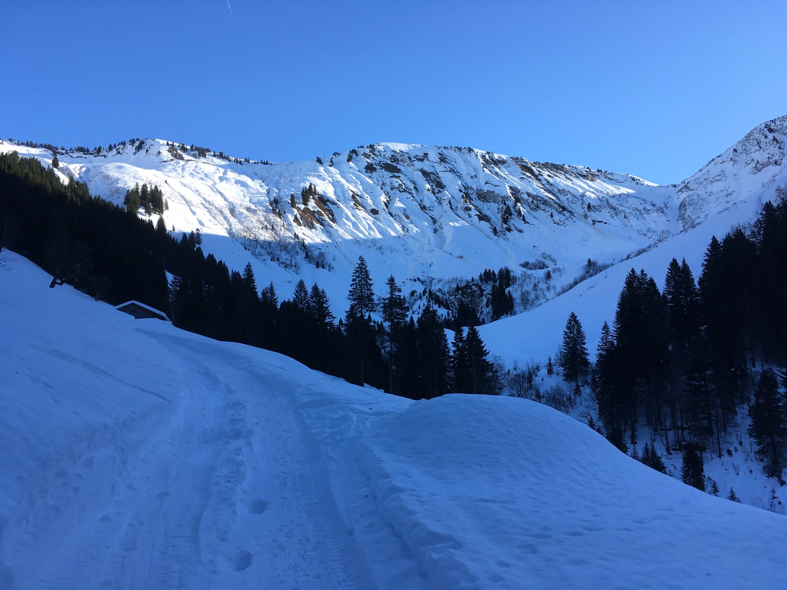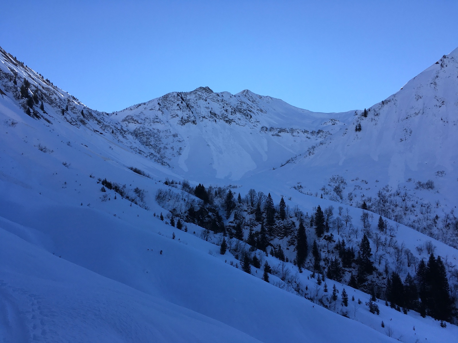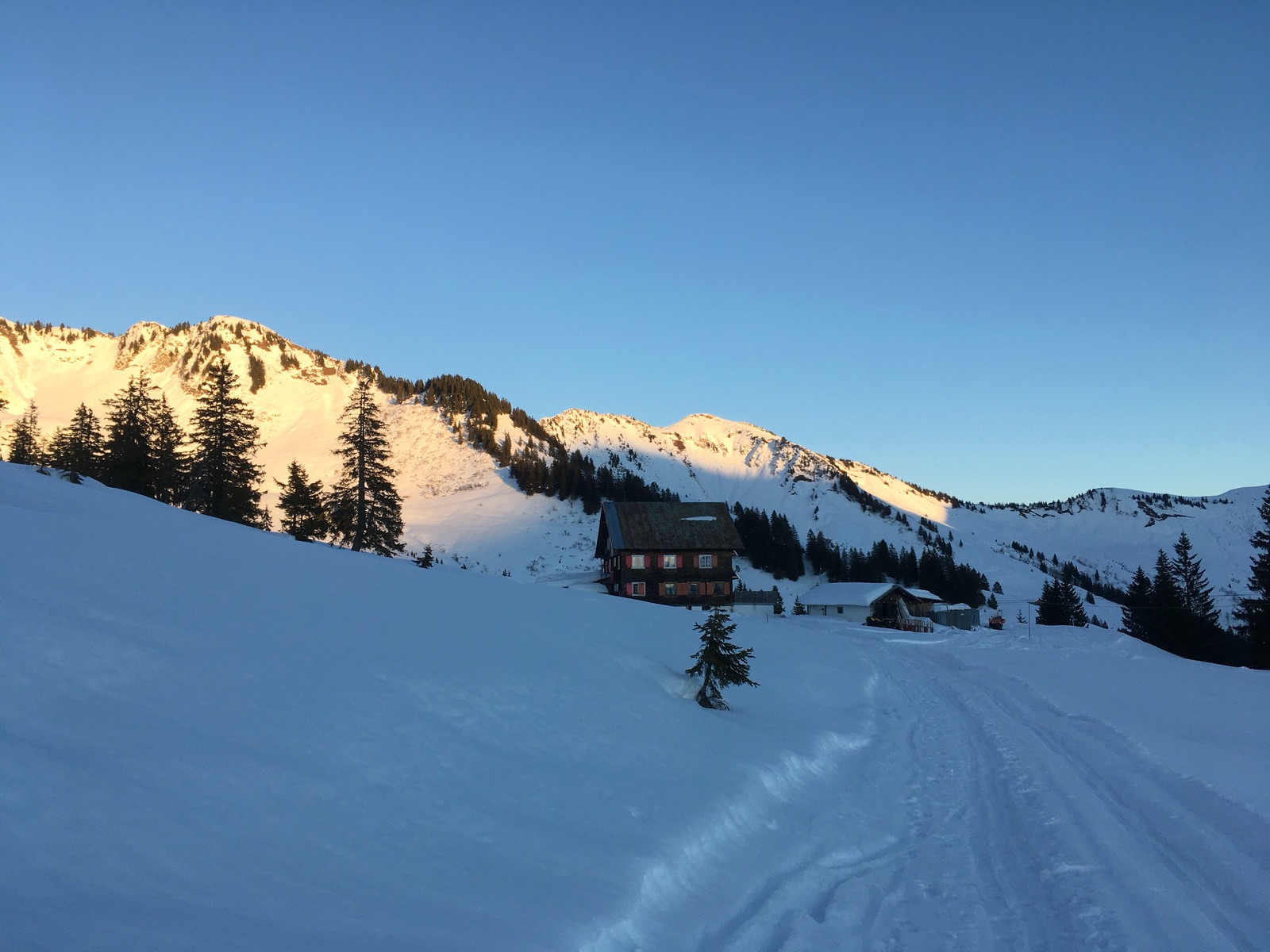 Heute gab es auf der anderen Talseite von Schoppernau zwei klassische Gipfel: Güntlespitze und Üntschenspitze. Schattiger Start über die Rodelbahn des Neuhornbachhauses, dann über die Pisi-Alm (immer noch im Schatten) mit 6x Lawinenkegel-Querung in das Häfnerjoch und dann zum heute überraschenderweise völlig verwaisten Gipfel der Güntlespitze. Der Südhang dorthin ist von Grundlawinen verunstaltet (betrifft den wesentlich häufiger begangenen Anstieg von Baad). Dann kurze Zwischenabfahrt und Aufstieg zur majestätisch über Schoppernau thronenden Üntschenspitze. Die Abfahrt von dort ist etwas mühsam, weil man nochmals gut 30 Hm hinaufhaxeln muss zur Einfahrt in das Nordkar. Dieses überraschend gut fahrbar, wenngleich kein perfekter Pulver. Unten dann wieder die Querung der Lawinenkegel. Anschließend sehr zügige Fahrt an der Pisi-Alm vorbei zur Rodelbahn und Aufstieg zum Neuhornbachhaus (endlich Sonne). Angesichts der Schneequalität sowie der fortgeschrittenen Tageszeit zog ich eine Einkehr dort der Besteigung des Falzerkopfs vor. Zurück bin ich dann über das Skigebiet Diedamskopf - dafür mit kurzen Zwischenabfahrten an der Falzalpe vorbei und dann die obere Spur nehmen. Im Sattel vor dem Skigebiet nicht der Aufstiegsspur nach oben folgen, sondern kurze Fellabfahrt nach unten und dann noch kurz zur Piste aufsteigen, falls man nicht im Gelände abfahren will (derzeit meistens Bruchharsch).