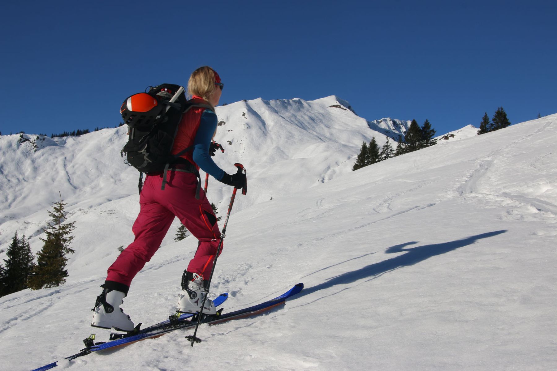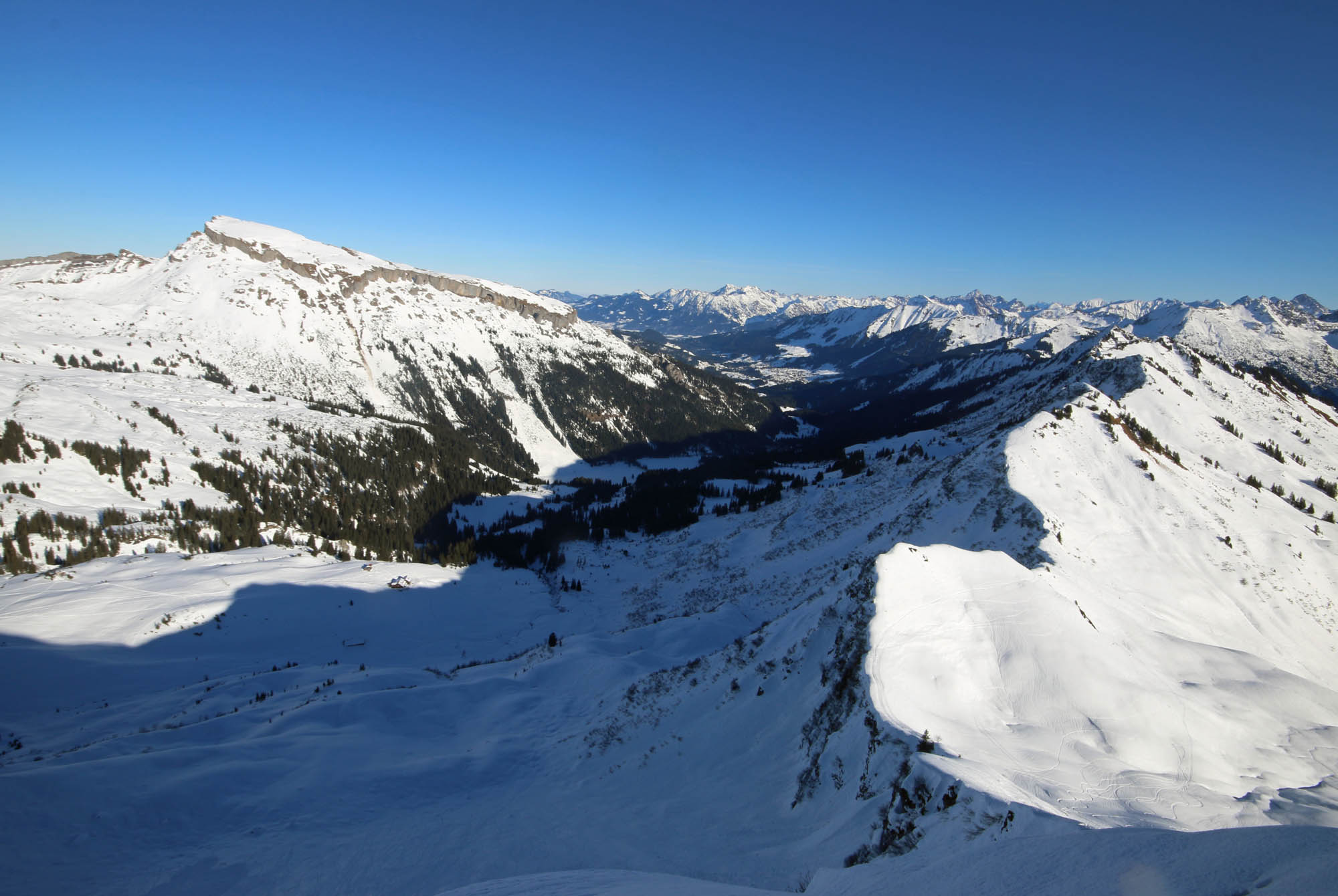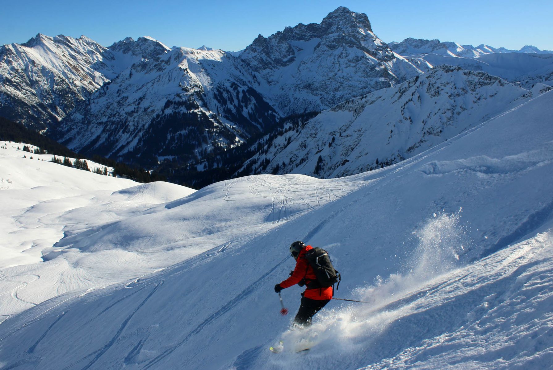 Wie von uns erhofft, hat die warme Witterung der vergangenen Tage den, für Mitte Dezember enormen Schneemengen im Kleinwalsertal nicht viel anhaben können. Selbst die südseitige Steilstufe im Wald war ohne Stein- oder Stammkontakt heute gut fahrbar. Allerdings waren – wie ebenfalls erwartet – gut geschliffenen Kanten heute auch nicht verkehrt. Zwar gab es ein, zwei kurze Passagen wo es so etwas wie auffirnte, doch im Großen und Ganzen war die Abfahrt bockhart – was freilich immer noch besser als ein fieser Bruchharsch ist. Der ostseitige Gipfelhang ermöglichte fast ein wenig Tiefschnee-Feeling im „feucht-gesetzten Pulver mit Mikro-Harschdeckel“.