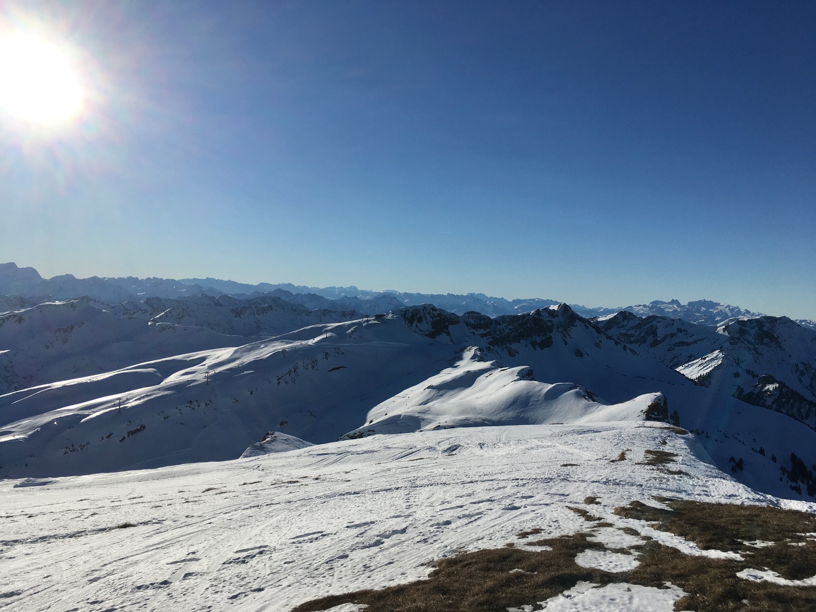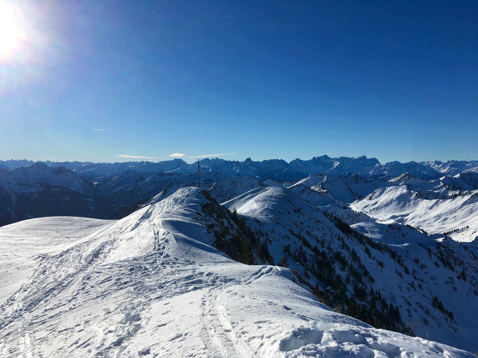 Damüls ist ja eher als Pistenski-Ziel bekannt, doch abseits und oberhalb des Skigebiets gibt es auch so manches Skitourenziel. Ein Teil davon kombinierte ich heute zu einer Reibn: Zunächst zum beeindruckend aussichtsreichen Portlahorn, dann abrutschen ins Sünser Joch (bei guter Schneebeschaffenheit könnte man auch eine schöne Zwischenabfahrt einlegen, heute lockte mich das aber nicht). Vom Joch dann querend zum Südkamm der Sünser Spitze - geht alles mit Skiern aber bei der Wächte etwas mühsam. Vom Gipfel (nach Abfellen) dann vorsichtiges Abrutschen in die Einschartung östlich (Achtung: Nach Norden geht es die Felswand hinunter, nach Süden ist es auch steil). Auf Schneeresten wird dann steil wieder zurück Richtung des Gupf oberhalb des Sünser Jochs gequert (wiederum: Bei guten Verhältnissen könnte man schön vom Gipfel abfahren und dann wieder anfellen). Nach kurzem Fußaufstieg (neudeutsch "Hike" / "Portage") geht es bis zum Gipfelaufbau des Ragazer Blanken. Auch denn habe ich gleich direkt im Stapf genommen. Das Gipfelkreuz steht nur wenig oberhalb einer Liftstation - der erste Kontakt mit dem Skigebiet heute und auch mit anderen Menschen abgesehen von einem Tourengeher auf dem Portlahorn. Ursprünglich wollte ich von dort über die Piste abfahren und dann erneut zum Hochblanken aufsteigen, aber die Aussicht darauf, wieder ohne anfellen durchzukommen, wenn man sich nach dem Steilhang hinter der Bergstation querend Richtung Gipfelkreuz wendet, ließ mich umentscheiden. Der harte Schnee bzw. abgeblasene Hang bot heute abermals gute Stapfverhältnisse. Vom Hochblanken muss man ca. 20 Hm nach Norden absteigen, Vorsicht, hier geht es auch gut herunter (ging heute ohne Steigeisen). Zuletzt noch ein paar Meter hinauf zum Hohen Licht (mit Lift-Bergstation, zweiter Skigebietskontakt am heutigen Tag). Die weiteren Gipfel wie Damülser Mittagspitze oder Elsenkopf gingen sich ob meines späten Starts leider nicht mehr aus.