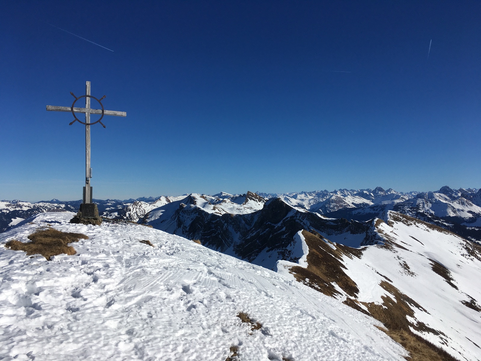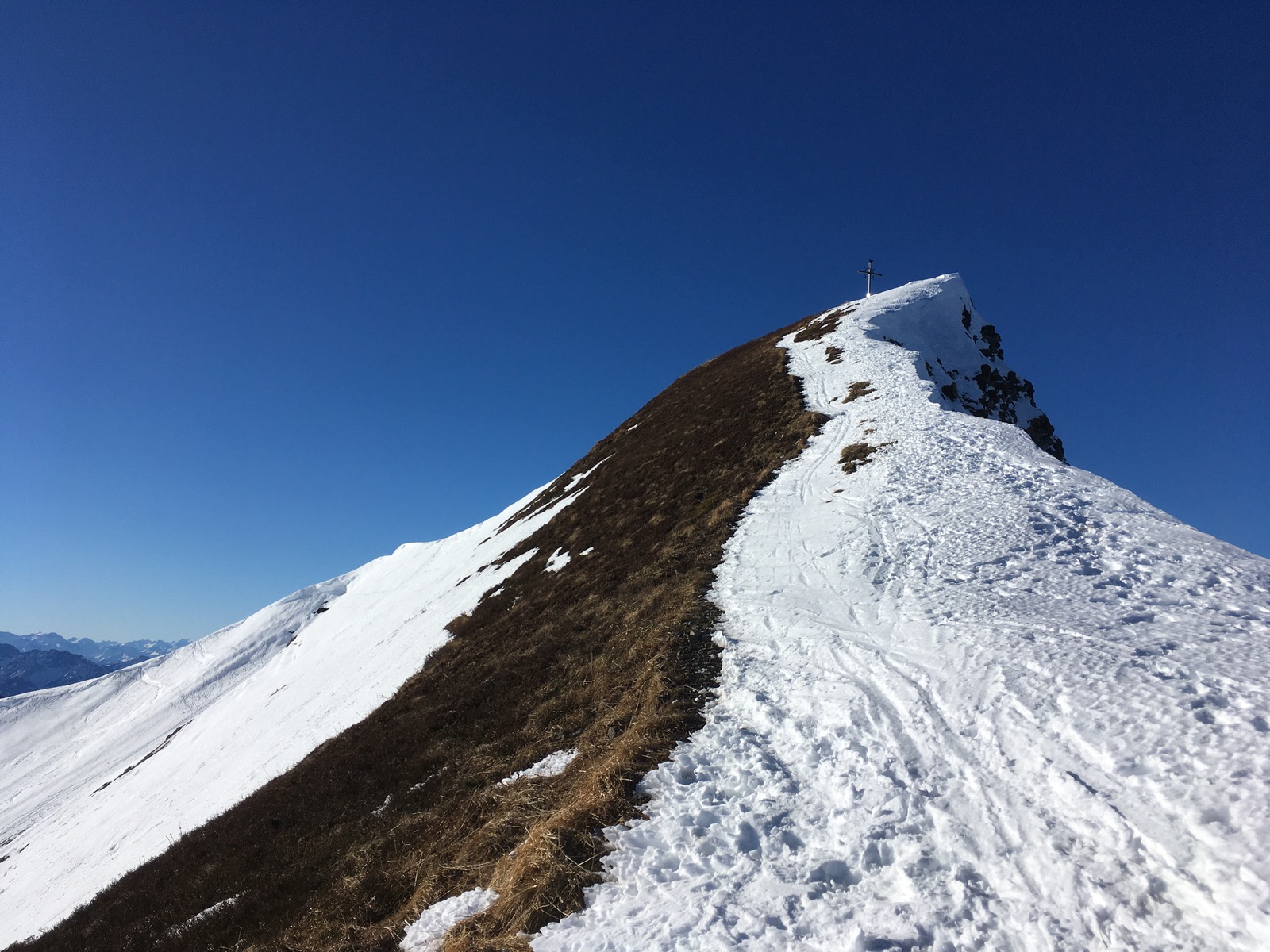 Vorsichtiges Abrutschen vom Gipfelkreuz der Sünser Spitze, es geht wirklich sauber nach unten und ein Teil der Schneefläche ist auch noch eine Wächte: