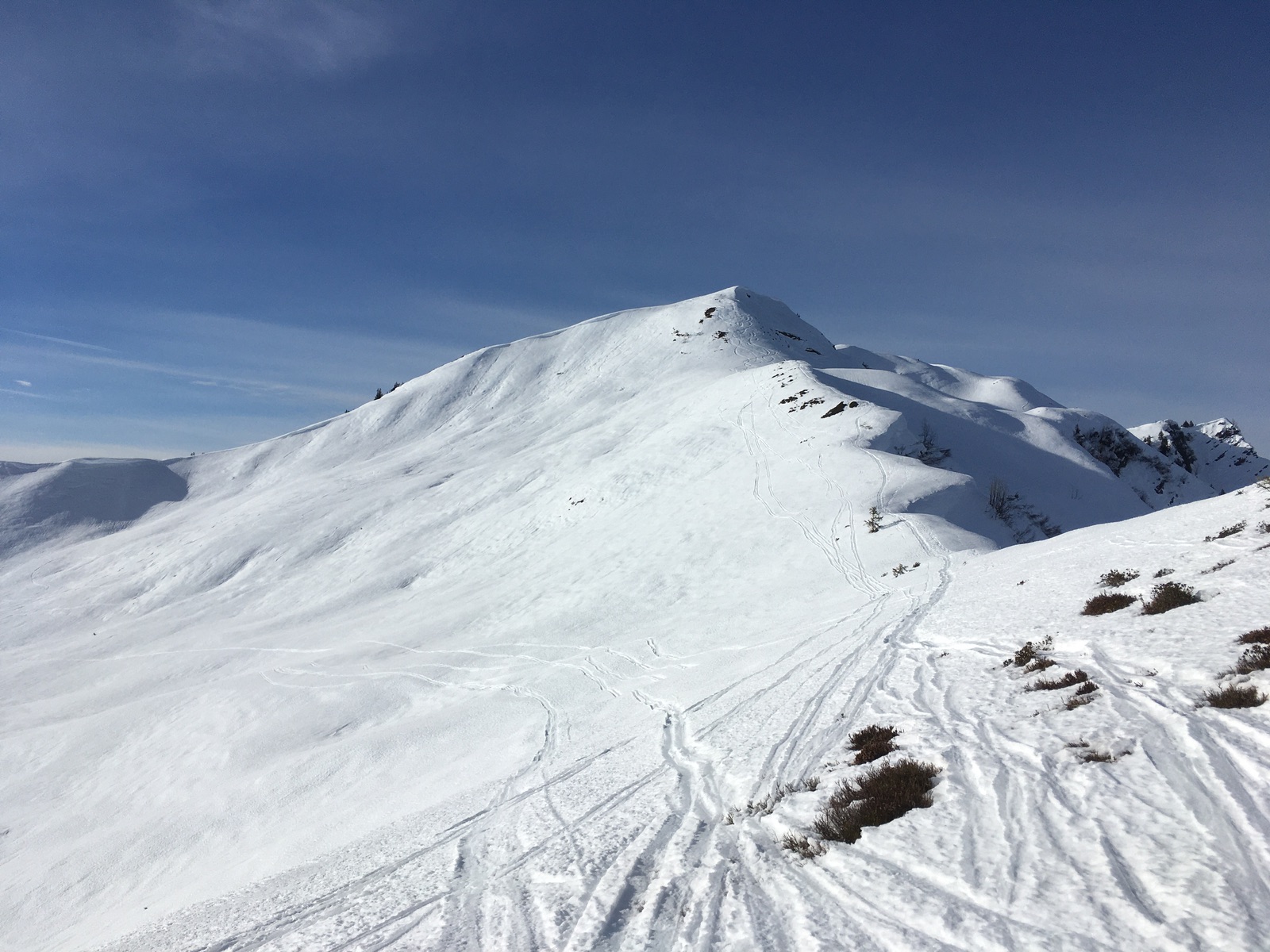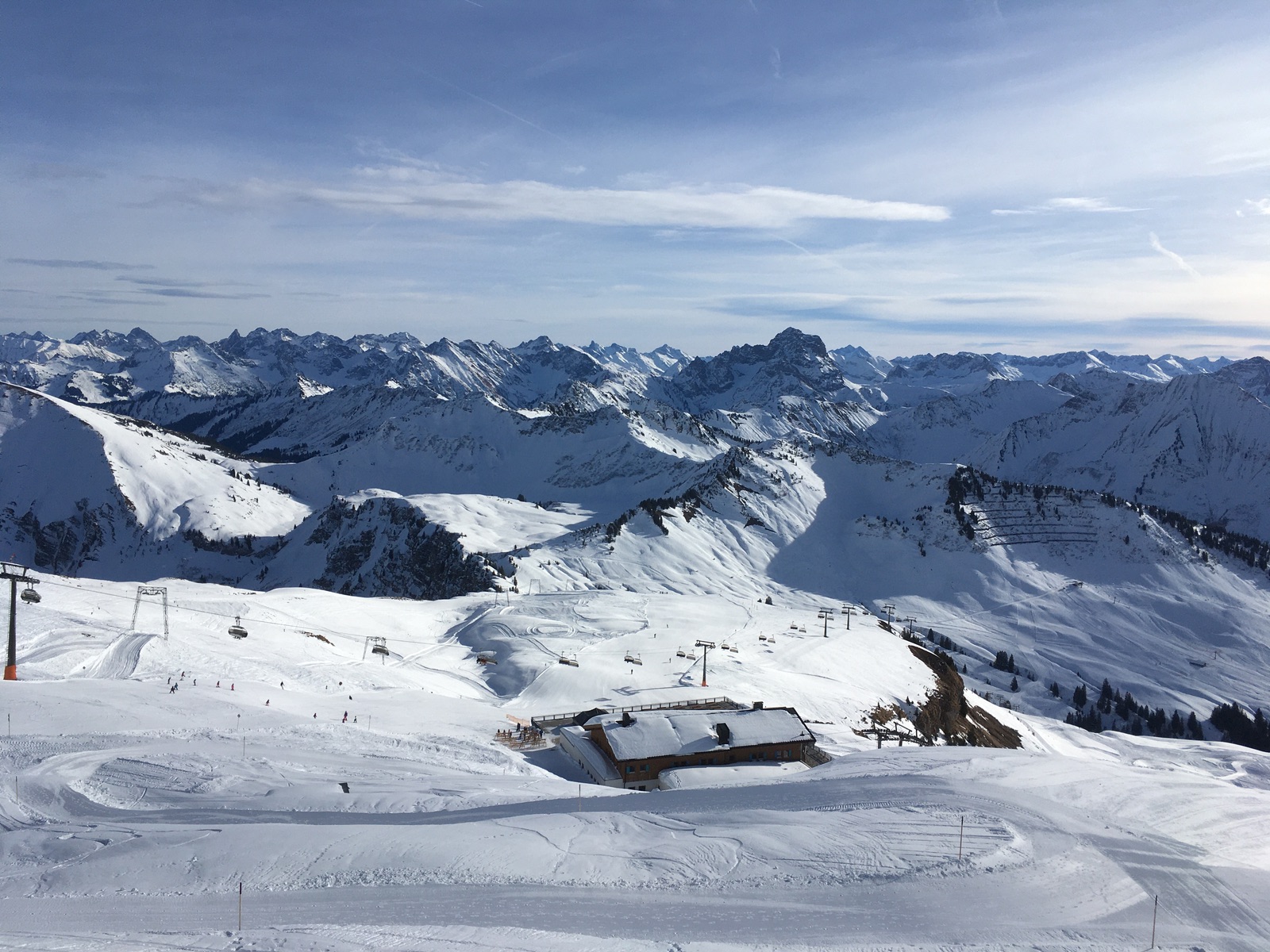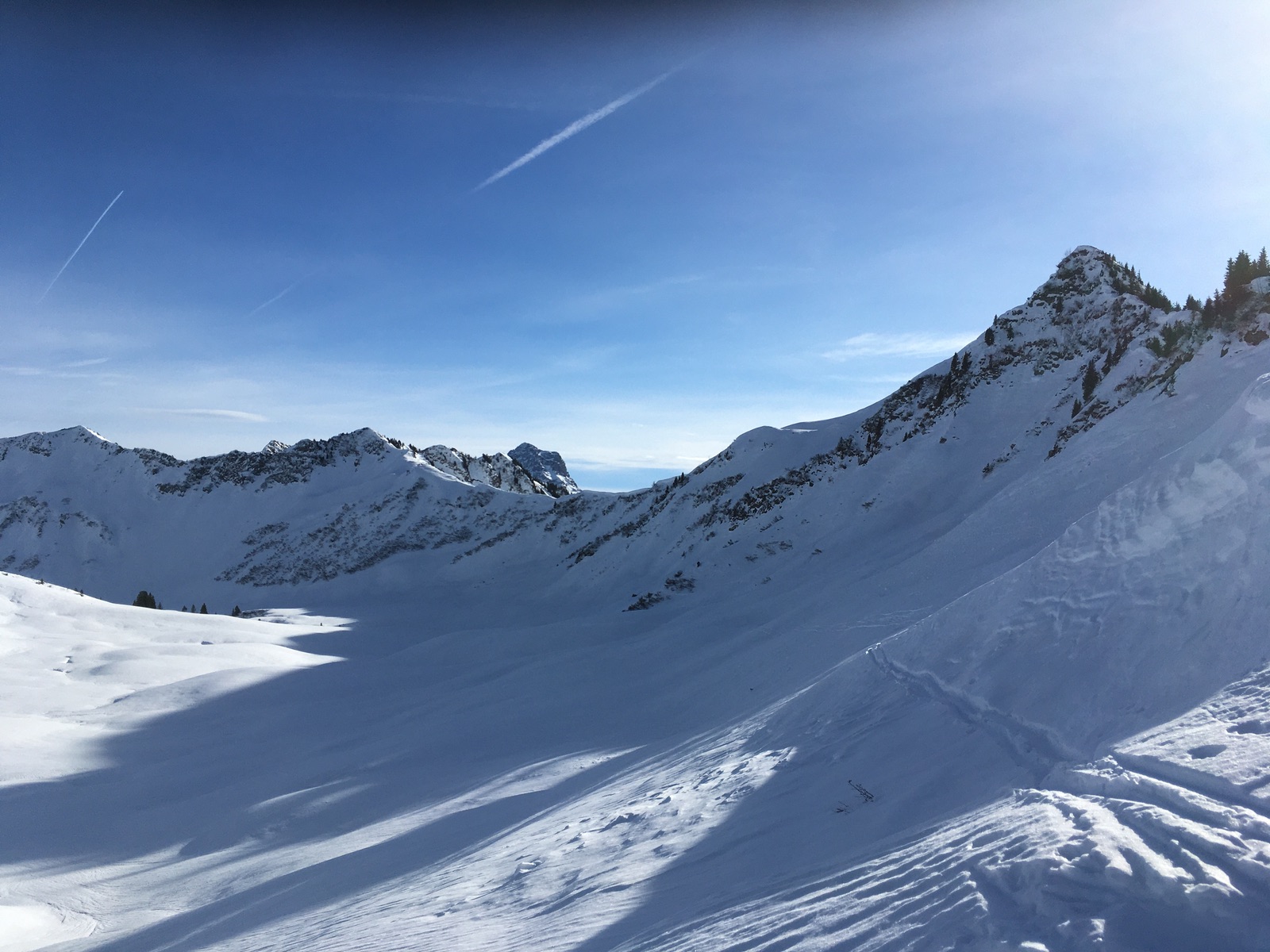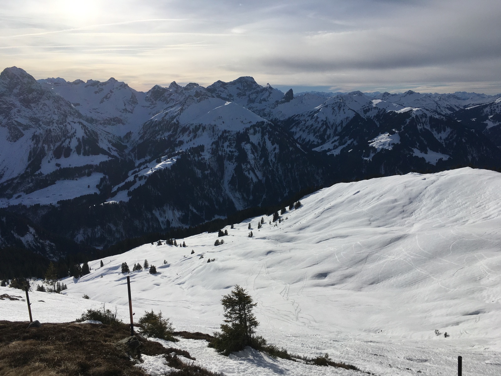 Gestern gab es zum Abschluss noch eine Tour auf die beiden Hausberge von Schoppernau auf der nördlichen Seite: Diedamskopf und Falzer Kopf. Aufstieg von der Talstation über die geschlossene Skiroute Unterdiedams - zerfurchter Acker durch eine alte Pistenraupenspur. Abfahren kann man hier wirklich nicht, auch hatte es schon an einigen Stellen wenig Schnee (bald aper bei der derzeitigen Witterung). Oben dann direkt durchs Skigebiet zum aussichtsreichen, aber windigen Gipfel des Diedamskopfs. Nach Abfahrt über die (aus Tourengehersicht) erfreulich leeren Pisten ging es noch über die Hochfläche "Hochgerach" von Norden auf den Falzer Kopf. Hier kommt man auf den Anstieg aus dem Kleinwalsertal. Abfahrt im freien Gelände im besten Fall tragender Harsch, häufiger auch bruchharschig. Die Talabfahrt aus dem Skigebiet ging aber wieder perfekt.