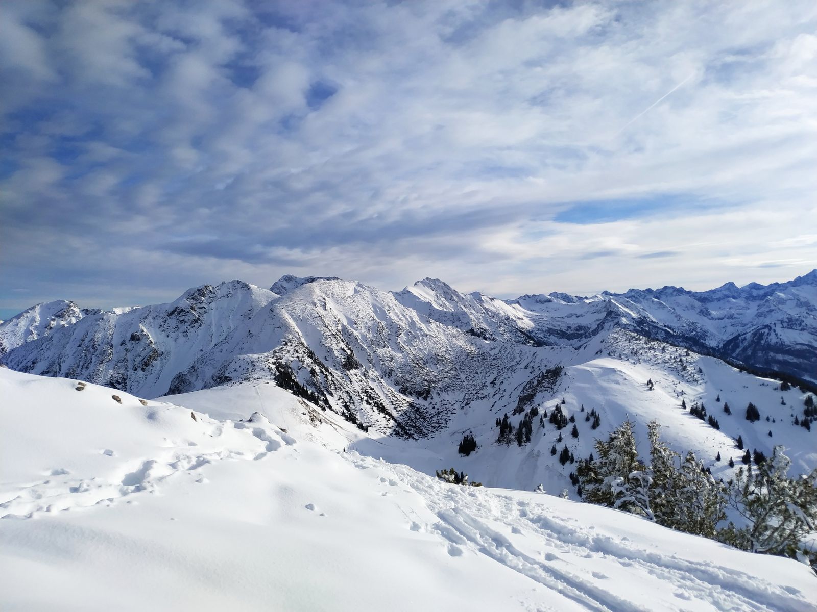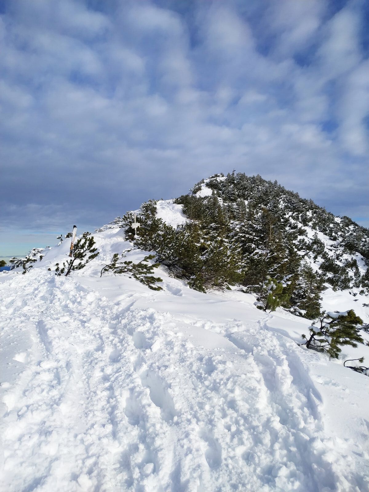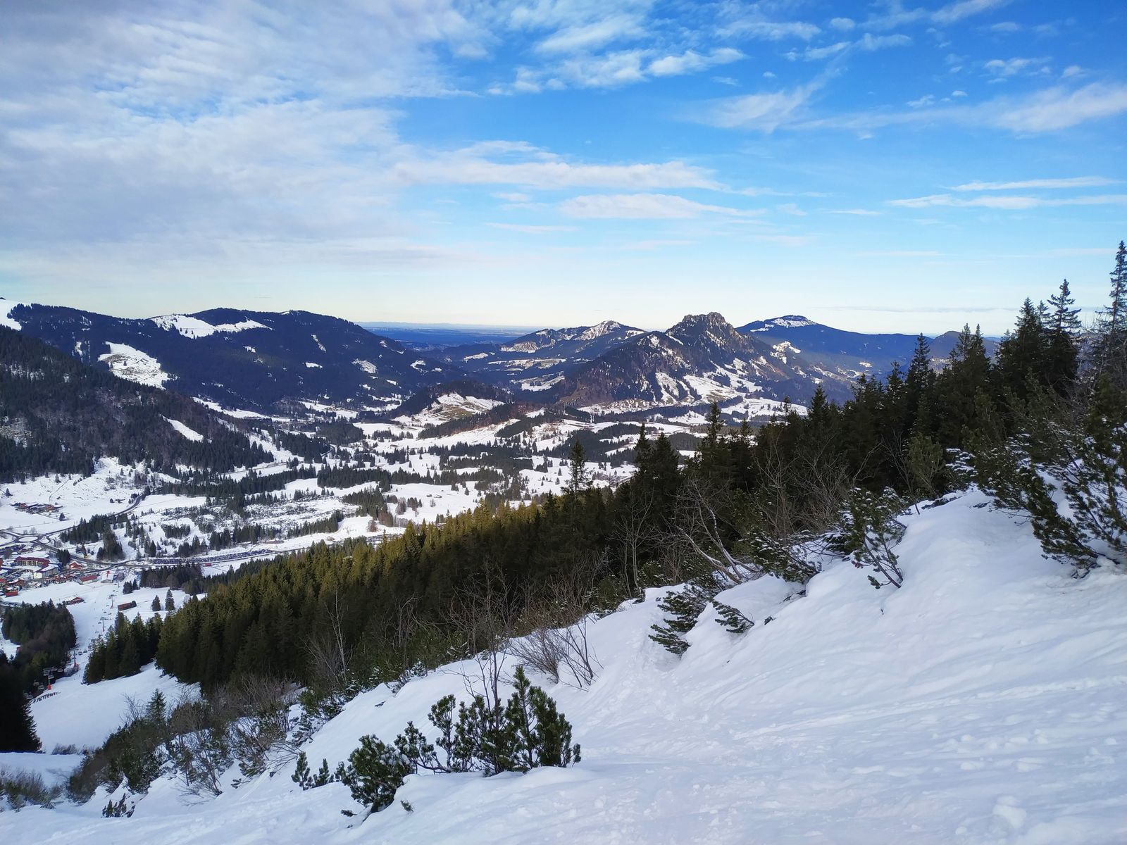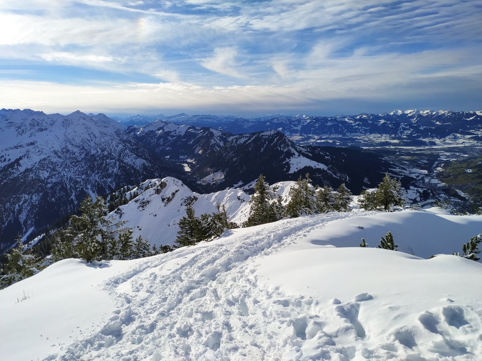 Wahnsinns Betrieb im Skigebiet. Aufstieg über Ochsenalpe deswegen fast ein Muss. Anfangs paar apere Meter auf dem Fahrweg, über Wiese evtl besser. Fahrbahn mit vielen Fussspuren und hart gefroren, nicht schön zu gehen. Ab Bergstation erster Zuckerschicht Neuschnee, im Kar oben rund 10 cm. Auch hier viele Füße in der Aufstiegsspur, aber man kommt mit Ski bis zum Grat. Von hier einfach zum Gipfel in bestem Trittschnee. Oben warm und traumhaft schöner Ausblick auf die aufziehende Front.