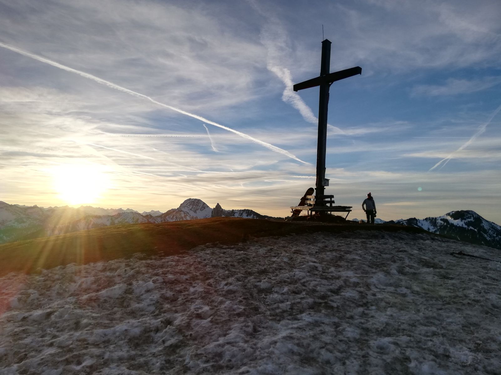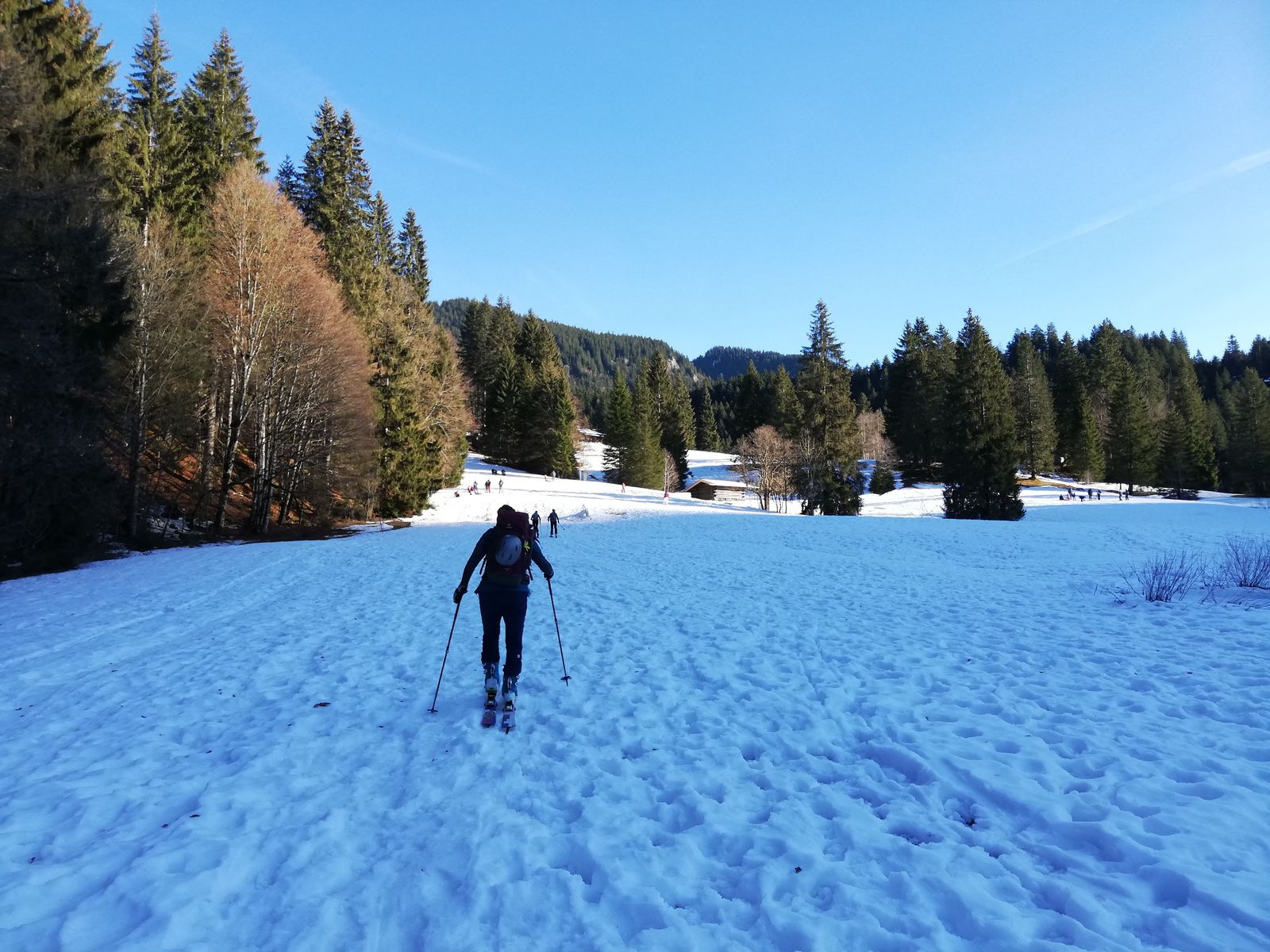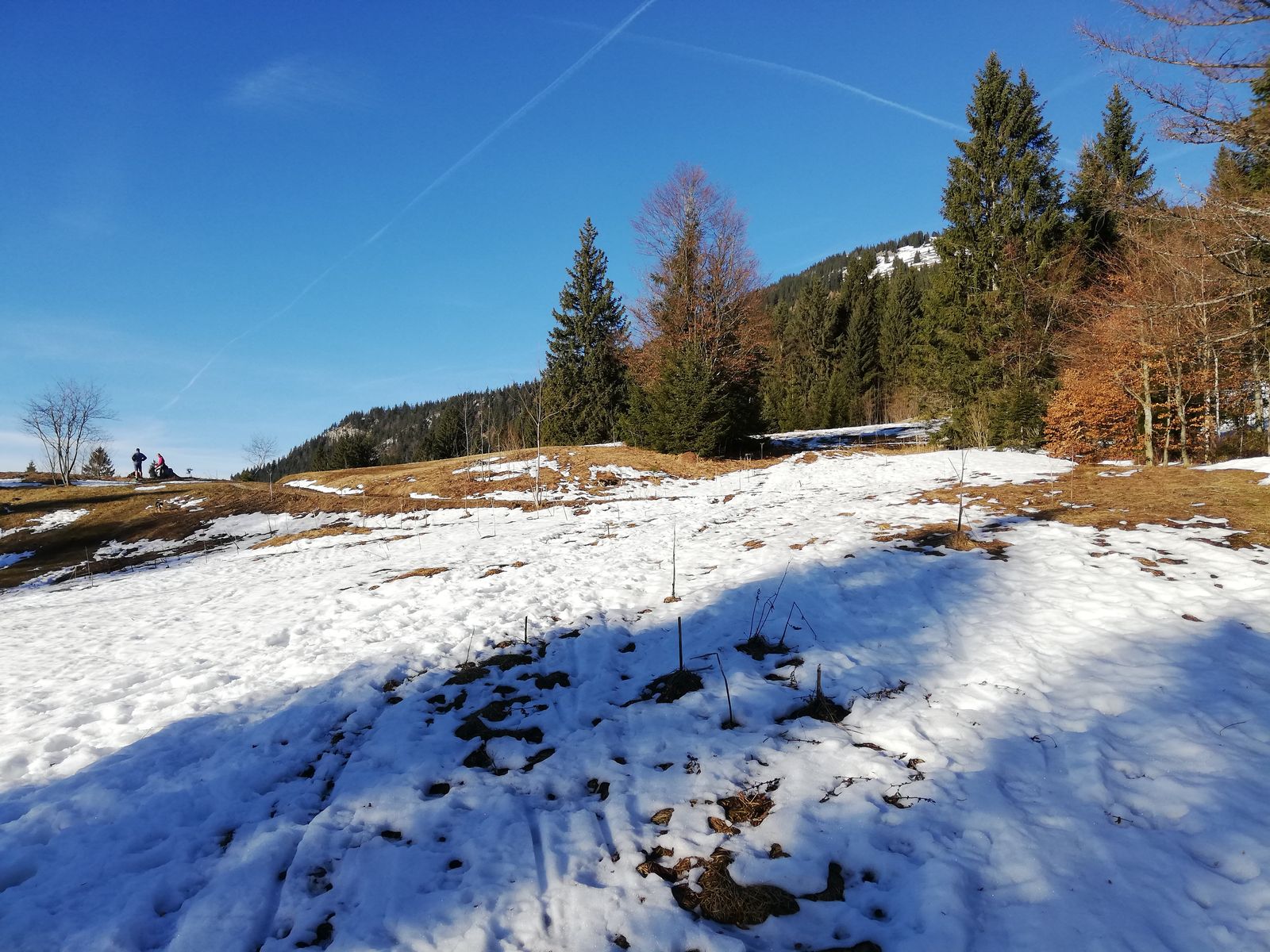 Wir sind über die Wiesen nach der Monialm hoch. Das lohnt sich nicht mehr. Im Wald eine Tragestrecke, mehrere apere Stellen, teilweise nur Schneestreifen, unterhalb der Unteren Suttenalm ebenfalls über Gras. Auf der Piste dann gut, alles sulzig.