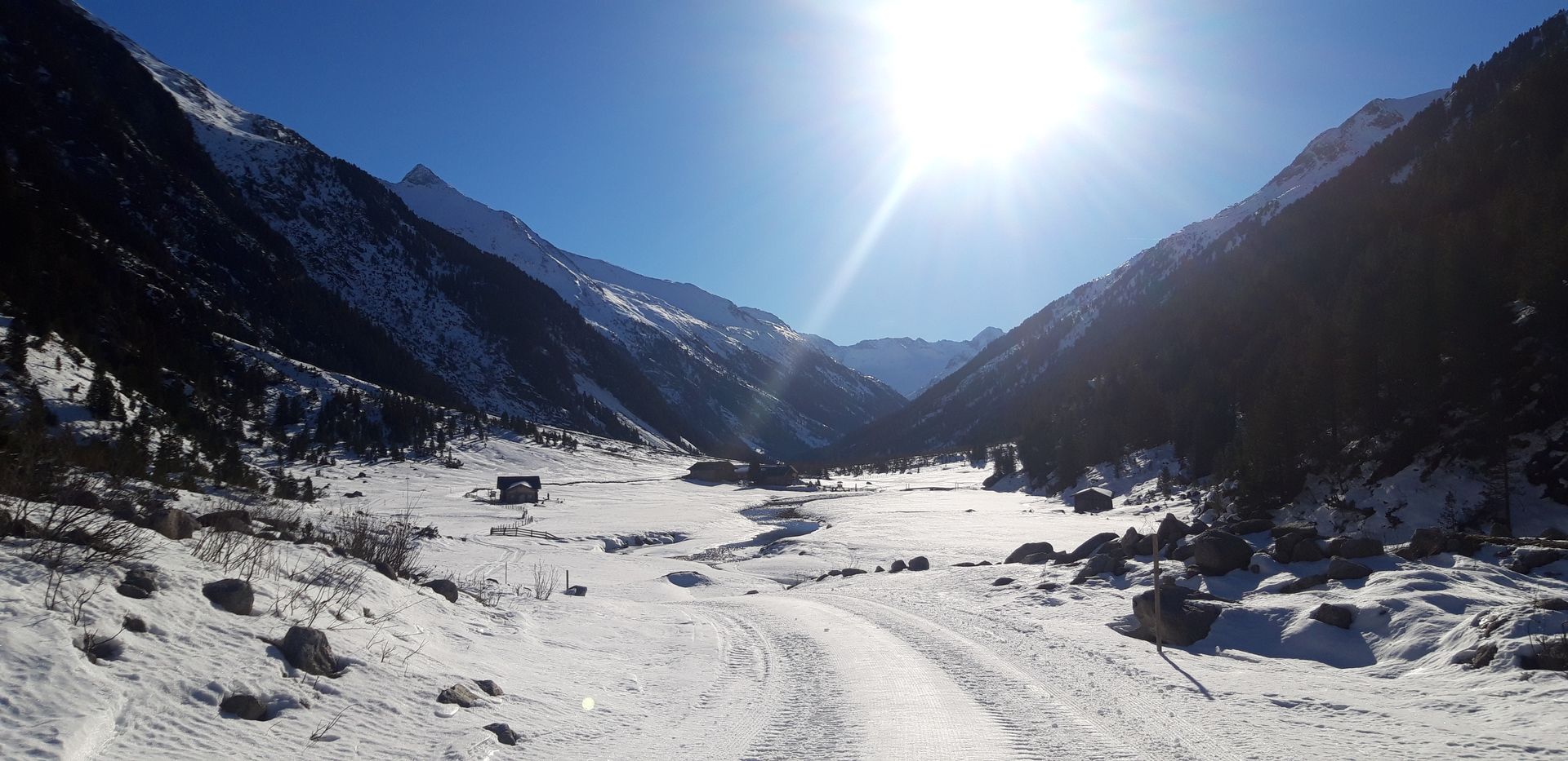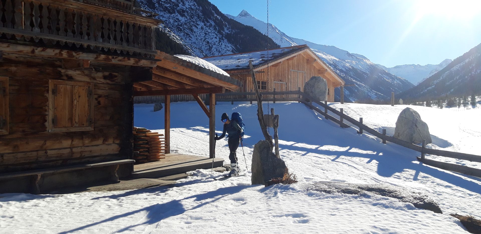 Während die ersten beiden Punkte absolut eingetroffen sind - einsamere Orte als die Warnsdorfer Hütte im Winter gibt es wohl nicht viele: Der letzte Eintrag im Hüttenbuch datiert vom 30.10... - , waren die Bedingungen äußerst mäßig. Dank einer für Forstarbeiten geräumten Straße durften wir die Ski bis zum oberen Ende der Krimmler Wasserfälle tragen (ca.300 Höhenmeter). Danach geht es stundenlang mit nur ganz wenig Höhengewinn durch das sehr lange, aber auch wunderschöne Achental, vorbei an malerischen Almen und dem Krimmler Tauernhaus bis zur Materialseilbahn der W-Hütte. Erst hier steilt es auf und man begeht schönes Skigelände. Eigentlich. Schnee ist genug da, aber durchgehend Bruchharsch von der ganz üblen Sorte. Wir sind gestern bis zur Hütte und ich bin heut morgen noch allein zum Gamsspitzl, doch je höher ich kam, desto grausliger wurde es. Den Gipfelhang hab ich mir dann gleich geschenkt und bin "abgefahren": ein sagenhaftes Gemurkse. Da war eigentlich nicht ein einziger vernünftiger Schwung dabei.