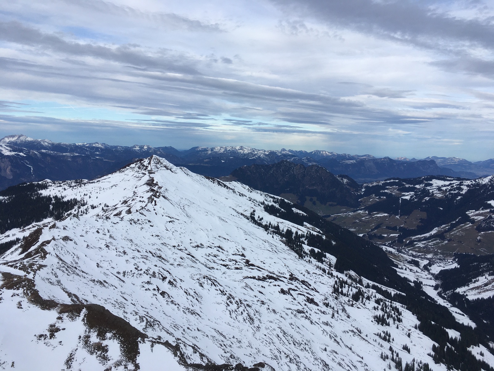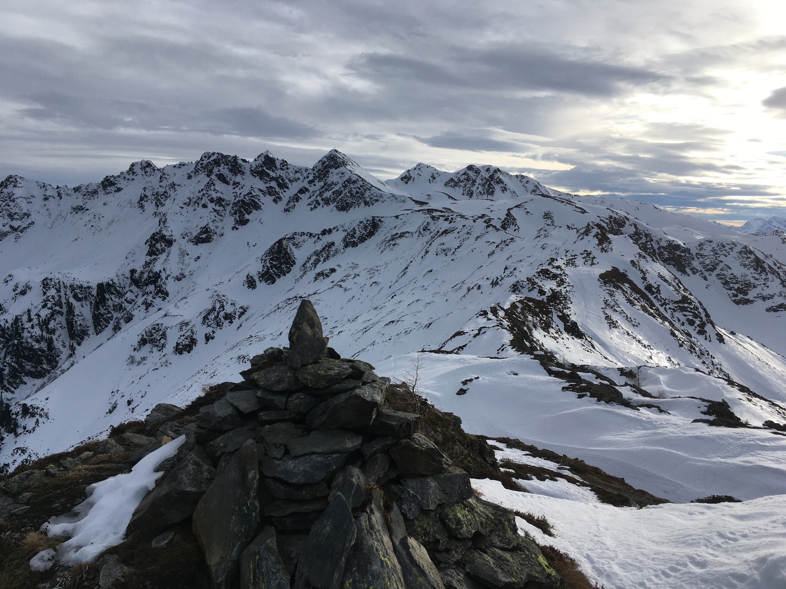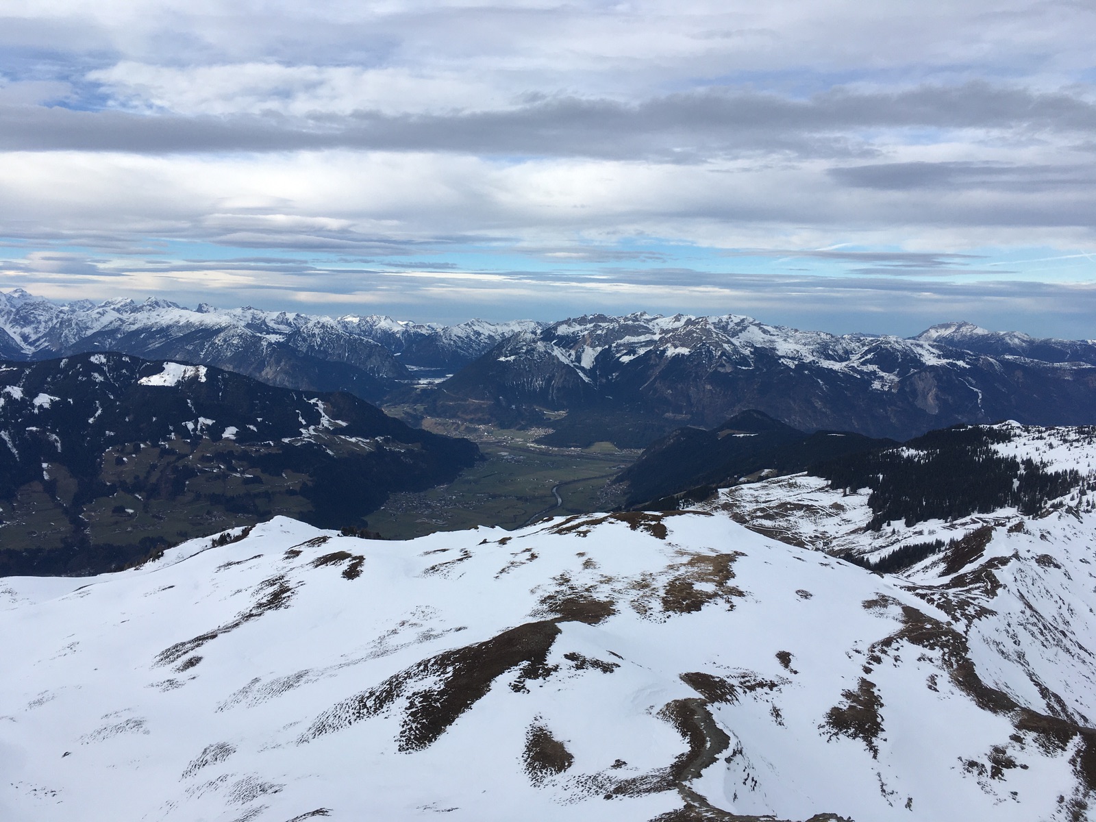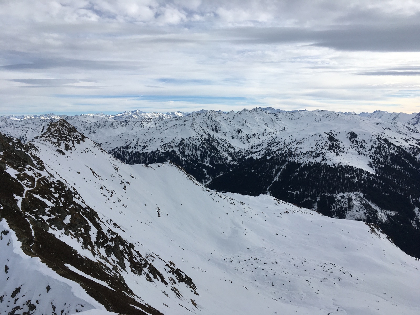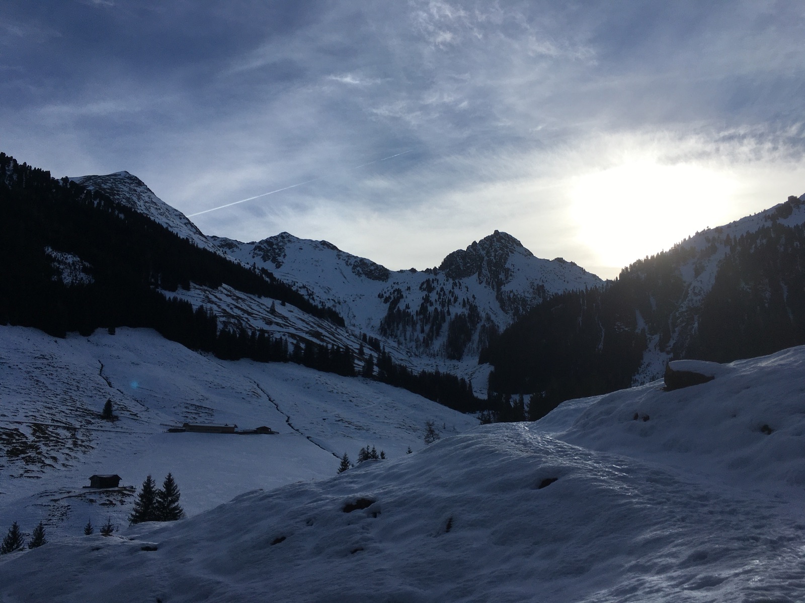 Gestern ging es auf Skitour im Greitergraben in Alpbach. Meistens wird auf dem Tourengeherparkplatz am Beginn des eigentlichen Tourengeländes gestartet (Parken wäre gestern auf dem großen Parkplatz kein Problem gewesen - die Verhältnisse sind so, dass viele Tourengeher offenbar die Ausübung ihres Sports bereits eingestellt haben mit dem entsprechend geringen Andrang; Abfahrt dann im freien Gelände oder über die Skiroute 66), ich bin aber schon in Inneralpbach im Ort gestartet. Entweder läuft man dann ca. 20 min auf der Straße hinter oder nutzt die parallel verlaufende Skiroute 66 (offiziell geschlossen, teilweise wenig Schnee). Aufstieg dann ungefähr im Bereich der in der AV-Karte eingezeichneten Tourenroute über die Greit-Alm. Für den Aufstieg sind die Verhältnisse sehr gut, für die Abfahrt wäre es etwas mühsam (kleinräumiger Wechsel aus tragendem Harsch und Bruchharsch + schneearme Stellen). Mit Skiern geht es bis wenige Meter unter das Gipfelkreuz, zuletzt steil.
