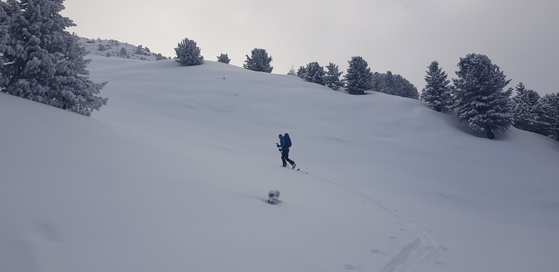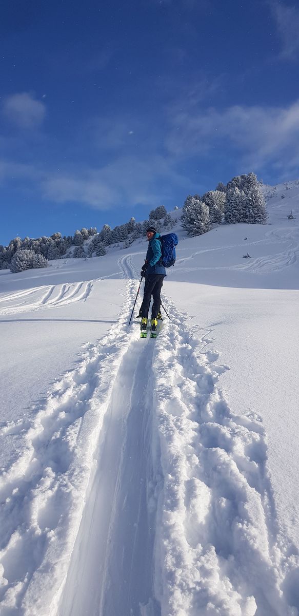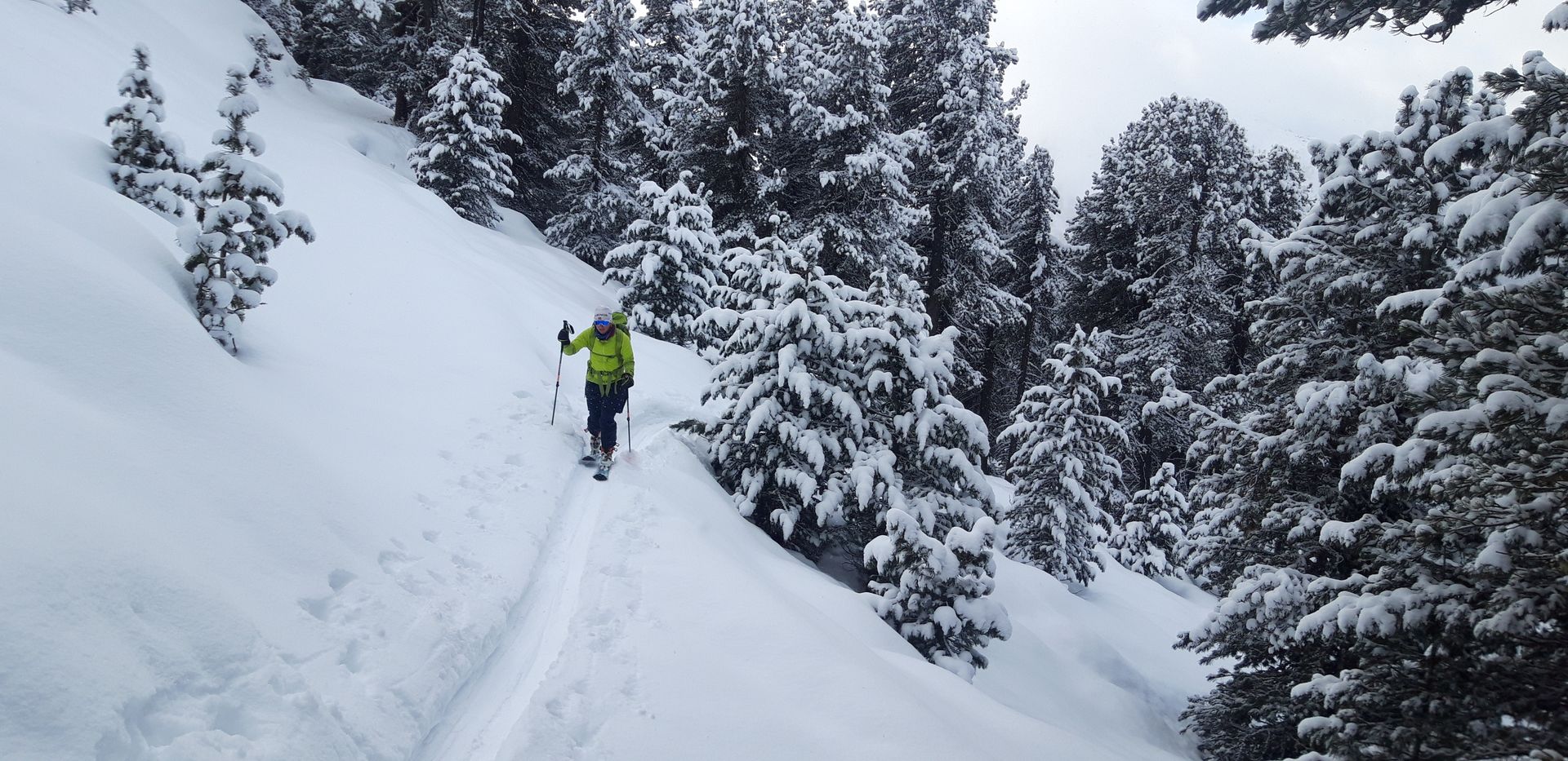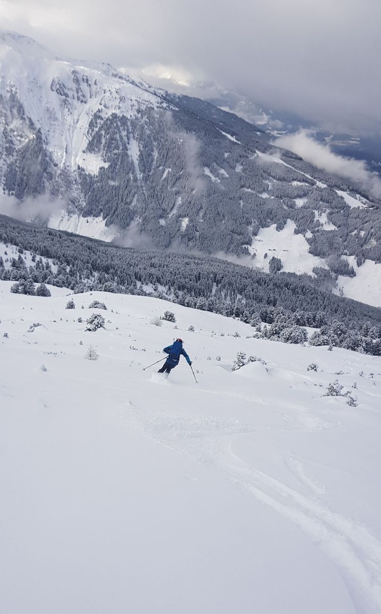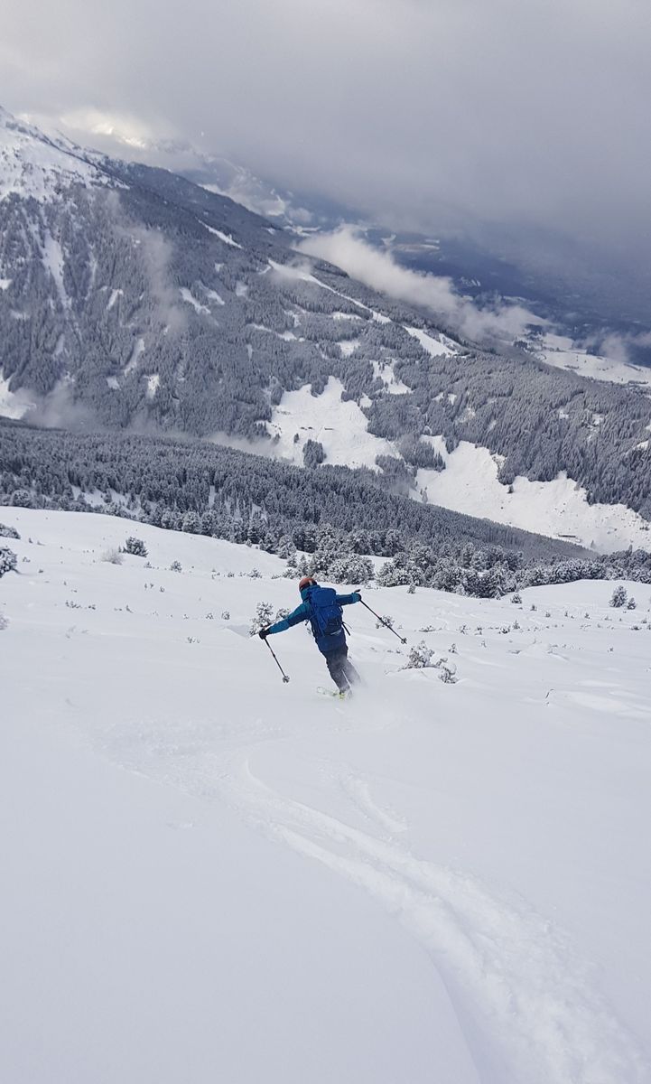 Auf der Rodelbahn bis zu den Largoz Almen (ca. 1950m) liegt genug Schnee für eine angenehme Abfahrt und oberhalb warten 20-30cm feinster ungebundener Pulver auf einer festen, nur manchmal ruppigen Unterlage. Wir sind mehrere Varianten an Largoz und Wattenspitze gefahren, die alle lohnend waren.