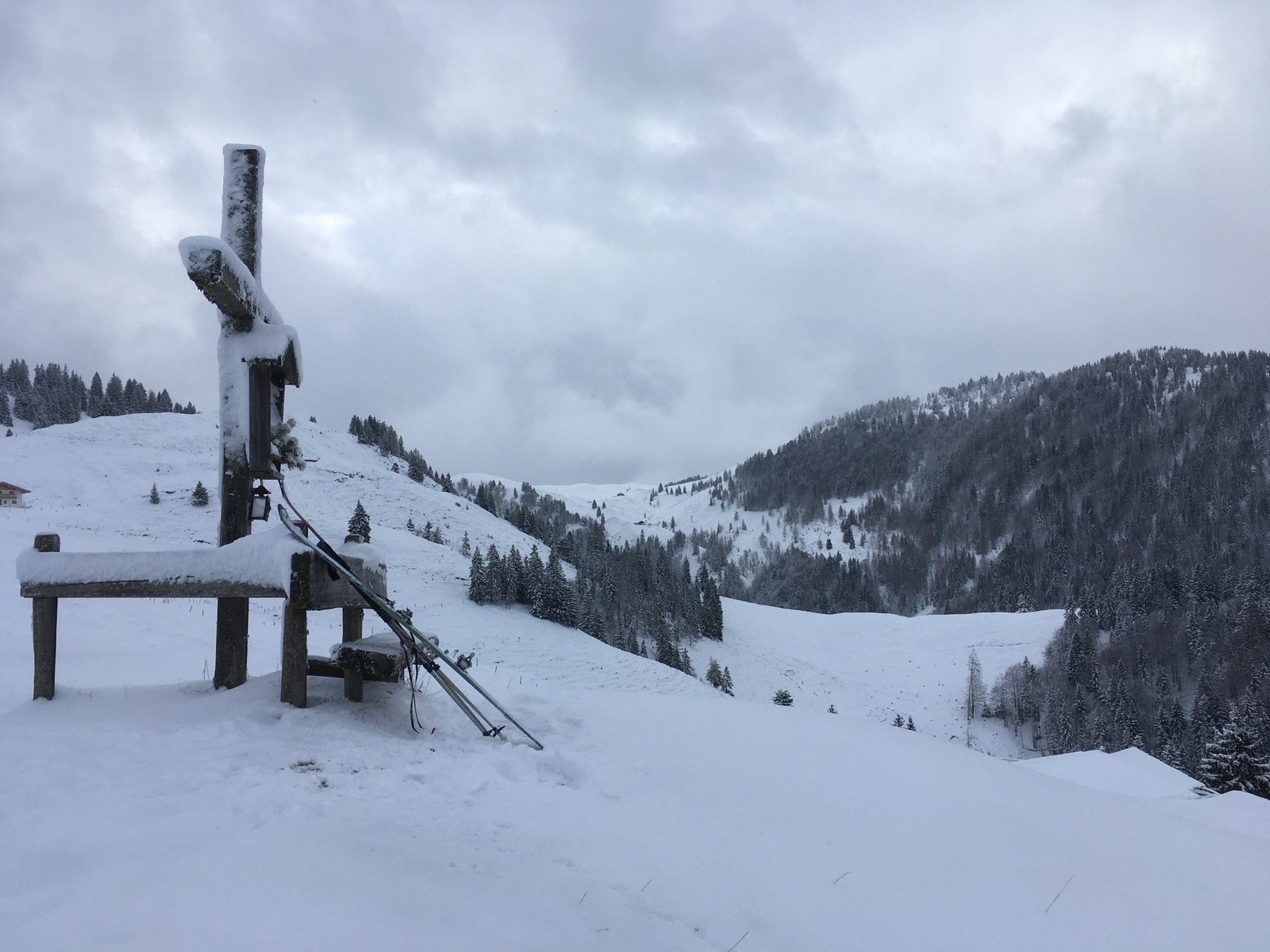 Für die Abfahrt wäre der Schnee oben schon ganz gut, die Sicht war es leider aber nicht und man spürt auch noch jede Bodenunebenheit bzw. den Altschneeharschdeckel. Nach dem Gipfelhang heißt es erst einmal länger queren / schieben / ansteigen (zurück zur Obing-Alm), wobei man noch verschiedene Almkreuze mitnehmen kann. Die Obing-Alm-Forststraße bin ich dann doch abgefahren, das eine oder andere Mal knirschte es aber. Die letzten 300 m der Forststraße im Wald dann aber doch besser zu Fuß, hier liegen nur 0-3 cm Schnee. Da die Forststraße nur sehr wenig Schnee hat, kann sich die Lage schnell ändern - Steinski wären aber in jedem Fall sinnvoll gewesen. Der dringend erforderliche ergiebige Neuschnee ist leider nicht in Sicht.
