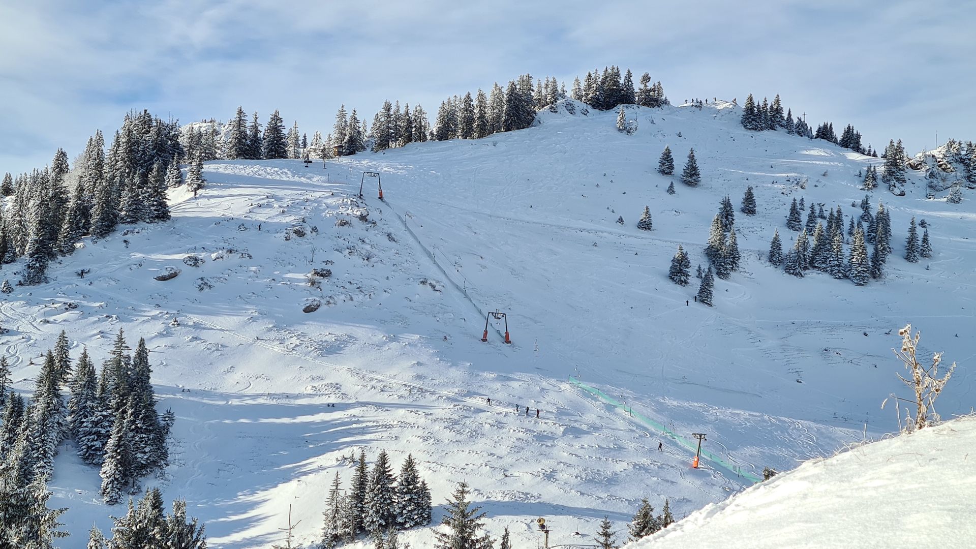 Die Skiroute war wunderbar ruhig, denn die Pisten und Lifte entlang der Skitourenroute sind derzeit geschlossen. Da hat der Schneemangel auch mal was Gutes. Die Neuschneeauflage reicht für den Aufstieg vollkommen aus und war in dem frischen Schnee richtig schön zu gehen, auch wenn das Gelände natürlich schon total verspurt ist.