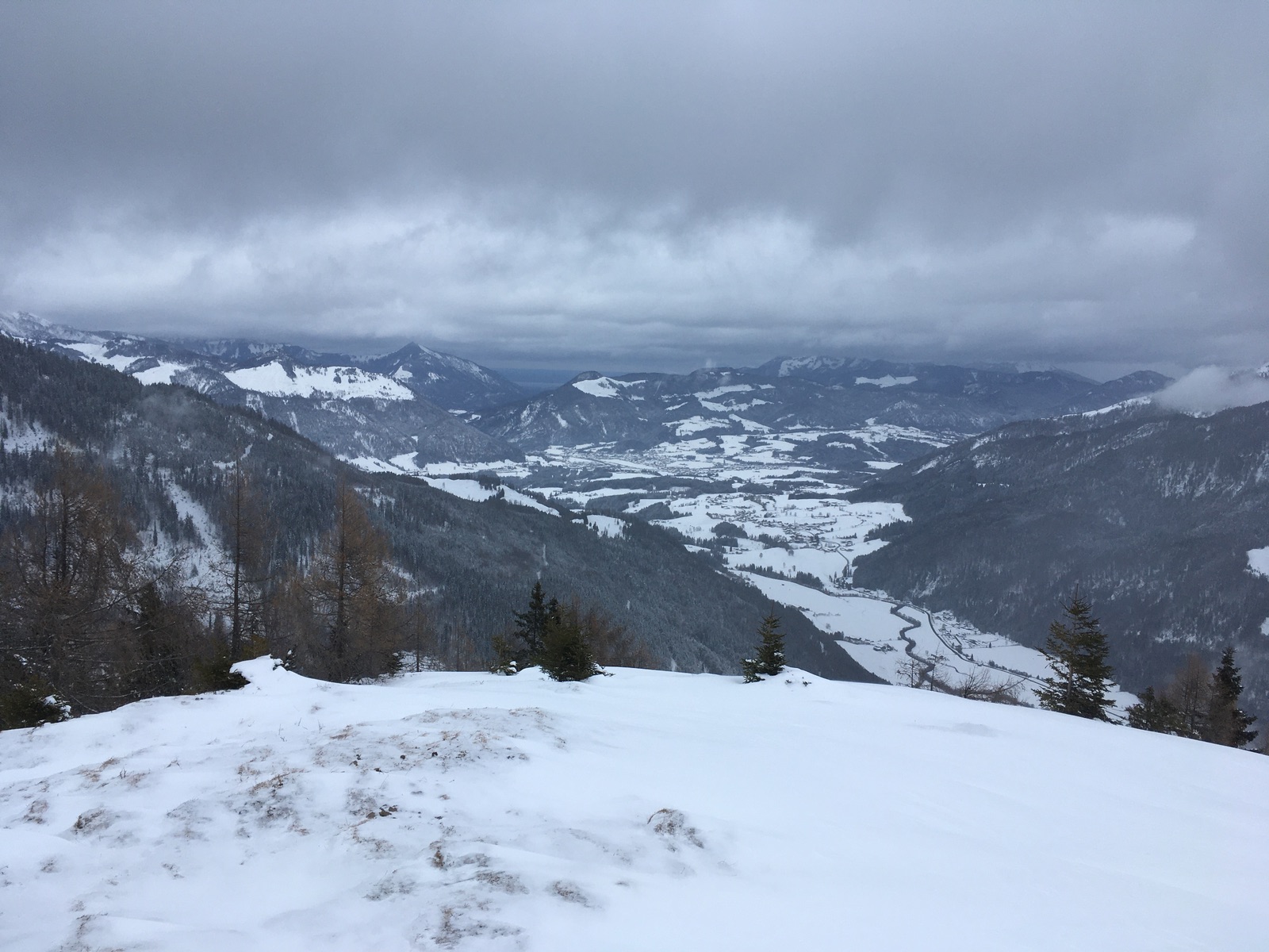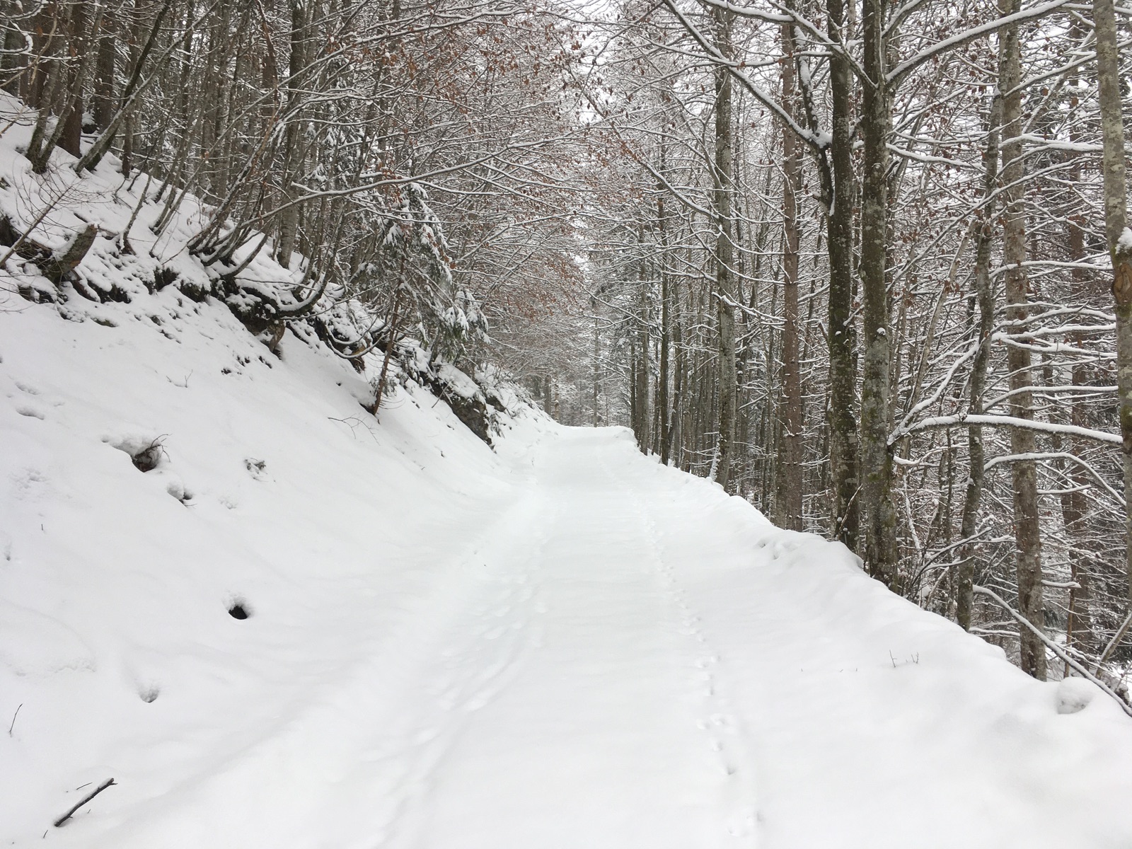 Die Forststraße zu den Scheibenbühel-Almen ganz unten - ausreichend Neuschnee, um trotz fehlender Unterlage abfahren zu können: