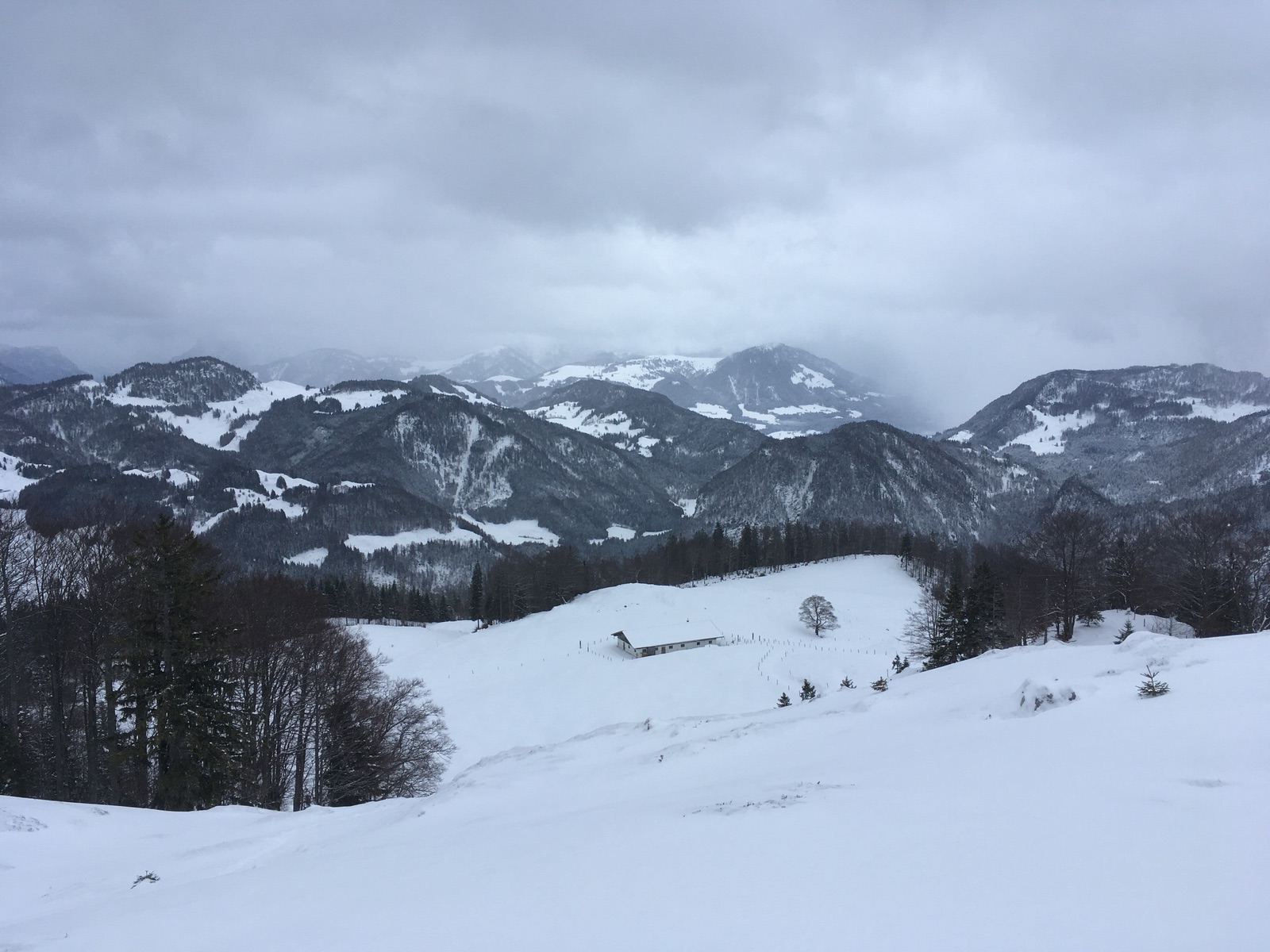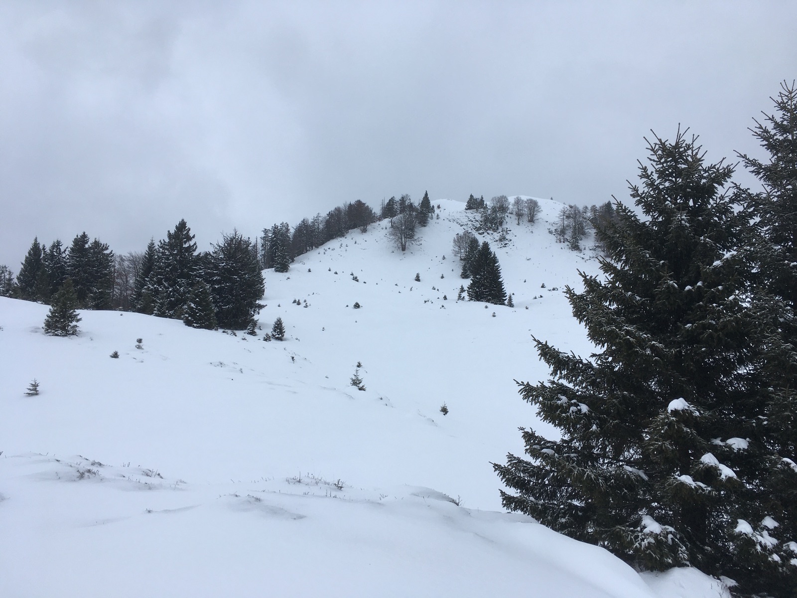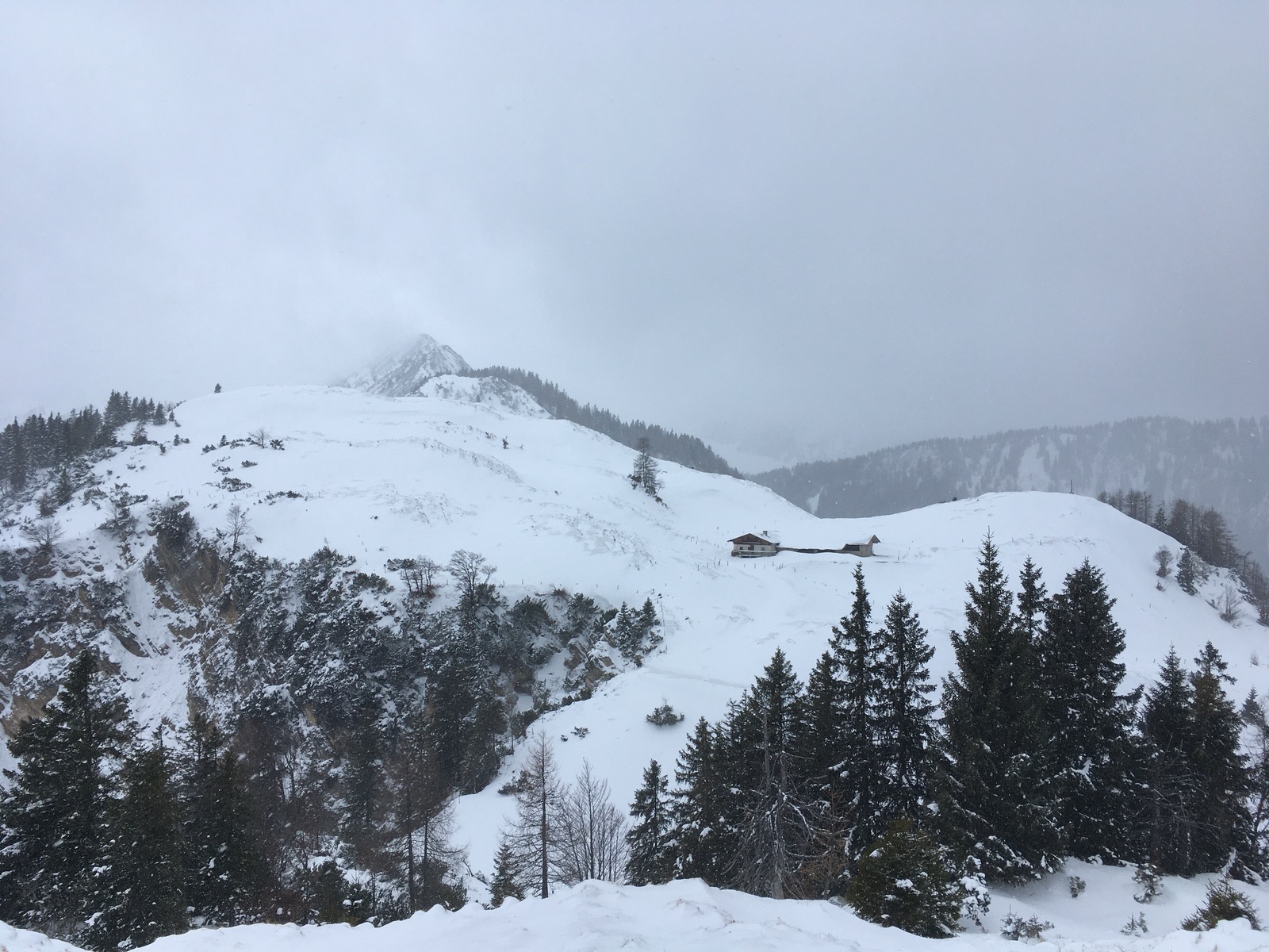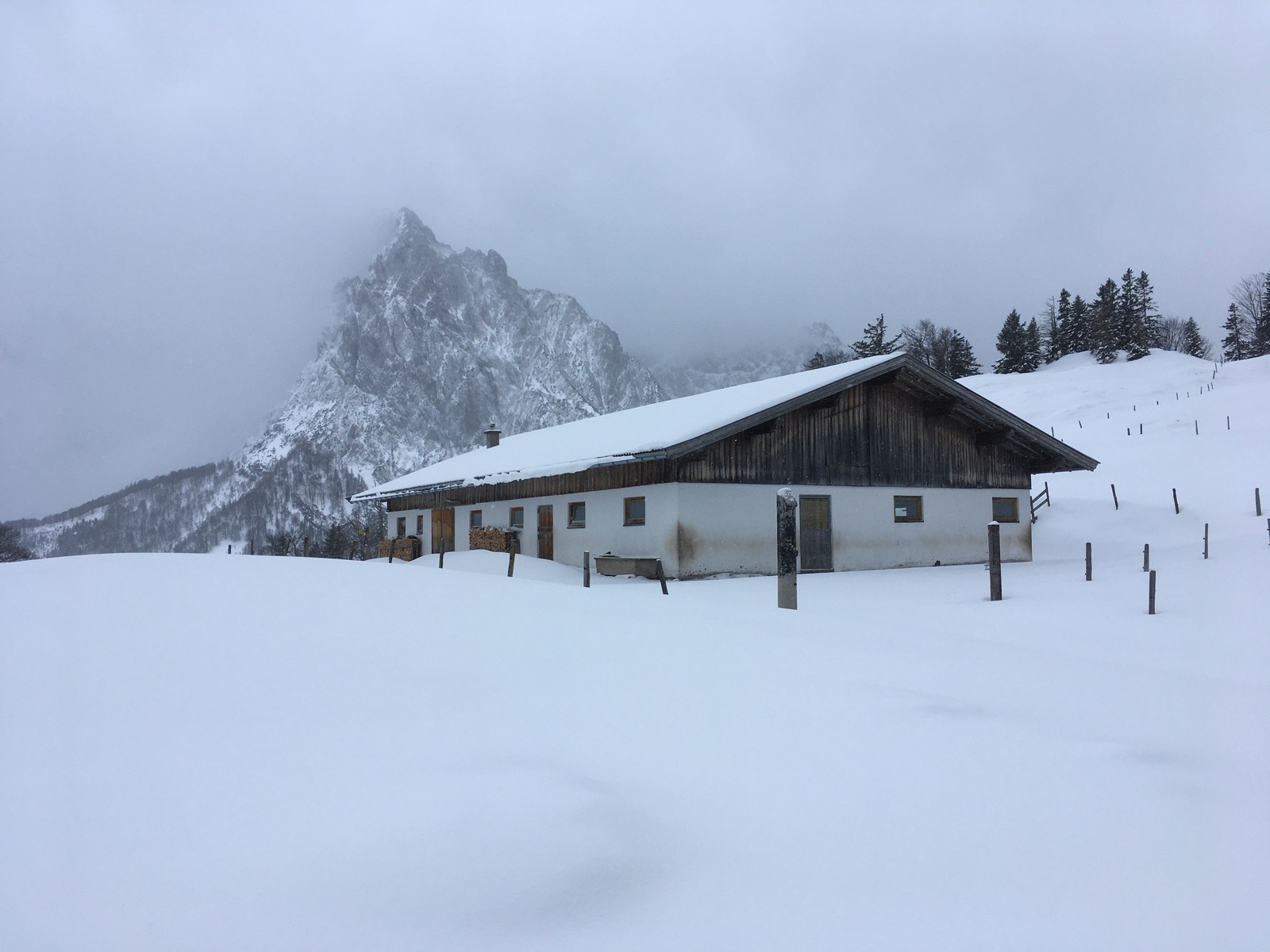 Heute wollte ich mich mal im Kaisergebirge probieren - die Hoffnung war auf ausreichend Neuschnee auf der laaaangen Forststraße aus dem Kaiserbachtal hoch Richtung Scheibenbühl-Almen. Start am Kaiserbachtal-Parkplatz, dann kurz auf der geräumten aber im Winter gesperrten Straße (geht wegen ihrer Flachheit trotz nur ca. 2 cm Schnee auf dem Asphalt) bis zum Abzweig der Forststraße. Diese musste dann vollständig gespurt werden. Bei der langen, flachen Kehre zwischen ca. 1.030 m und 1.180 m habe ich da dann doch geflucht. Der Sommerweg macht einige Abkürzer, aber bei der derzeitigen Schneelage wohl mit Skiern nicht sinnvoll. Sobald man das freie Gelände erreicht, liegt mehr Schnee. Allerdings ist durch den Neuschnee schwer zu sehen, wo es zuvor noch eine Altschneedecke gab - nur dort kann man schadensfrei in der Abfahrt durchkommen. Eigentlich hatte ich gedacht, mir würde das gelingen, aber dafür müsste man wohl noch deutlich vorsichtiger abfahren. Da war ich dann doch froh um meine "uralten kantenfreien Steinski". Nur den Versuch, die lange Kehre auf dem Wanderweg abzufahren, hätte ich mal besser gelassen: Das geht auch mit sehr alten Skiern nicht wirklich vernünftig. Lieber besser laufende Skiern nehmen und komplett die Kehren ausfahren und dann in den Flachstücken anschieben, dann gibt es auch keine so großen Schäden am Material.