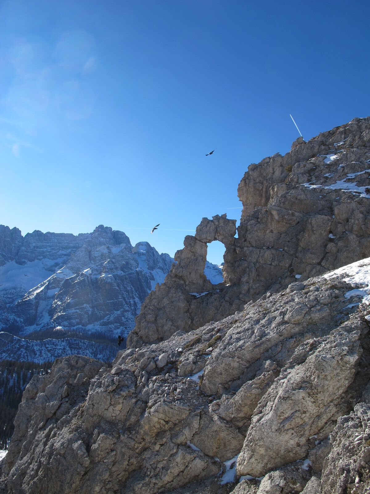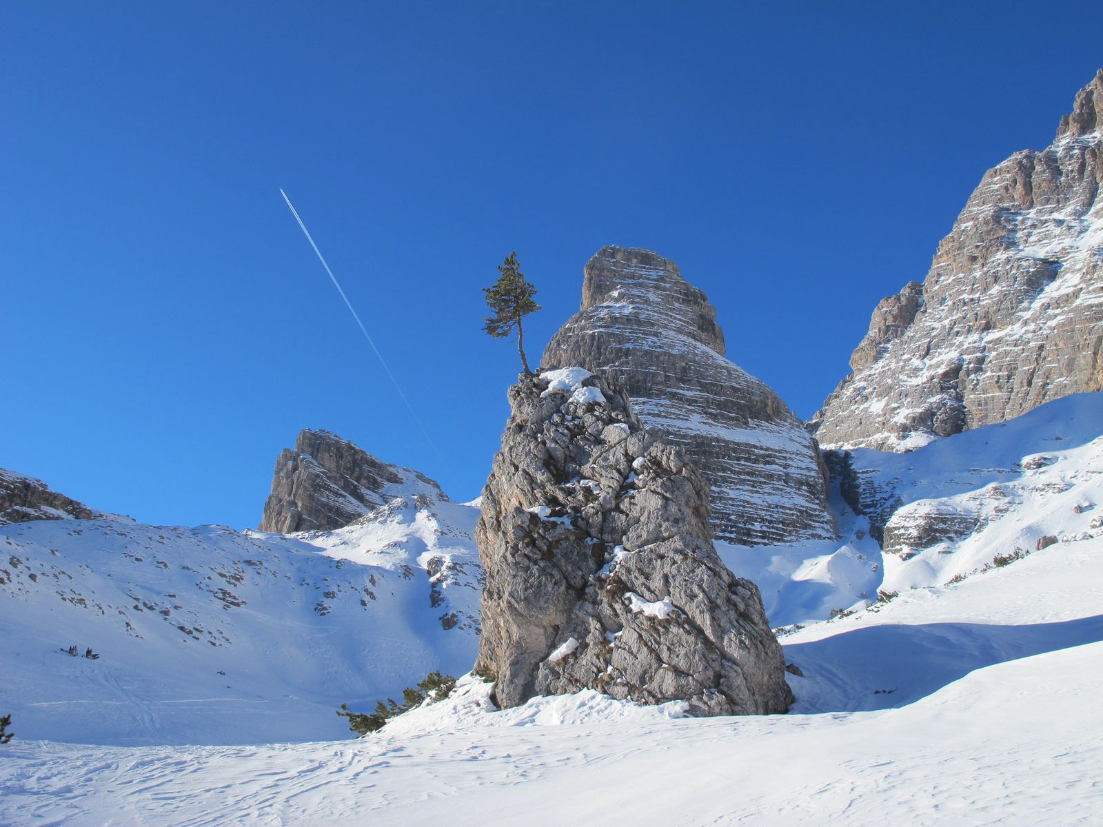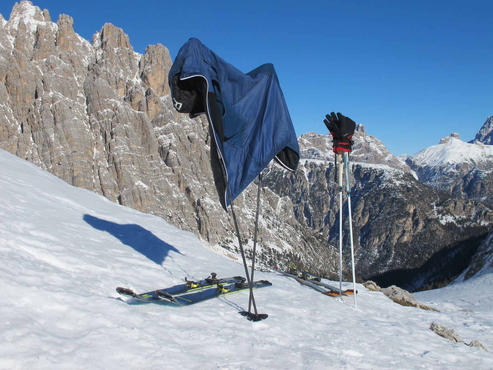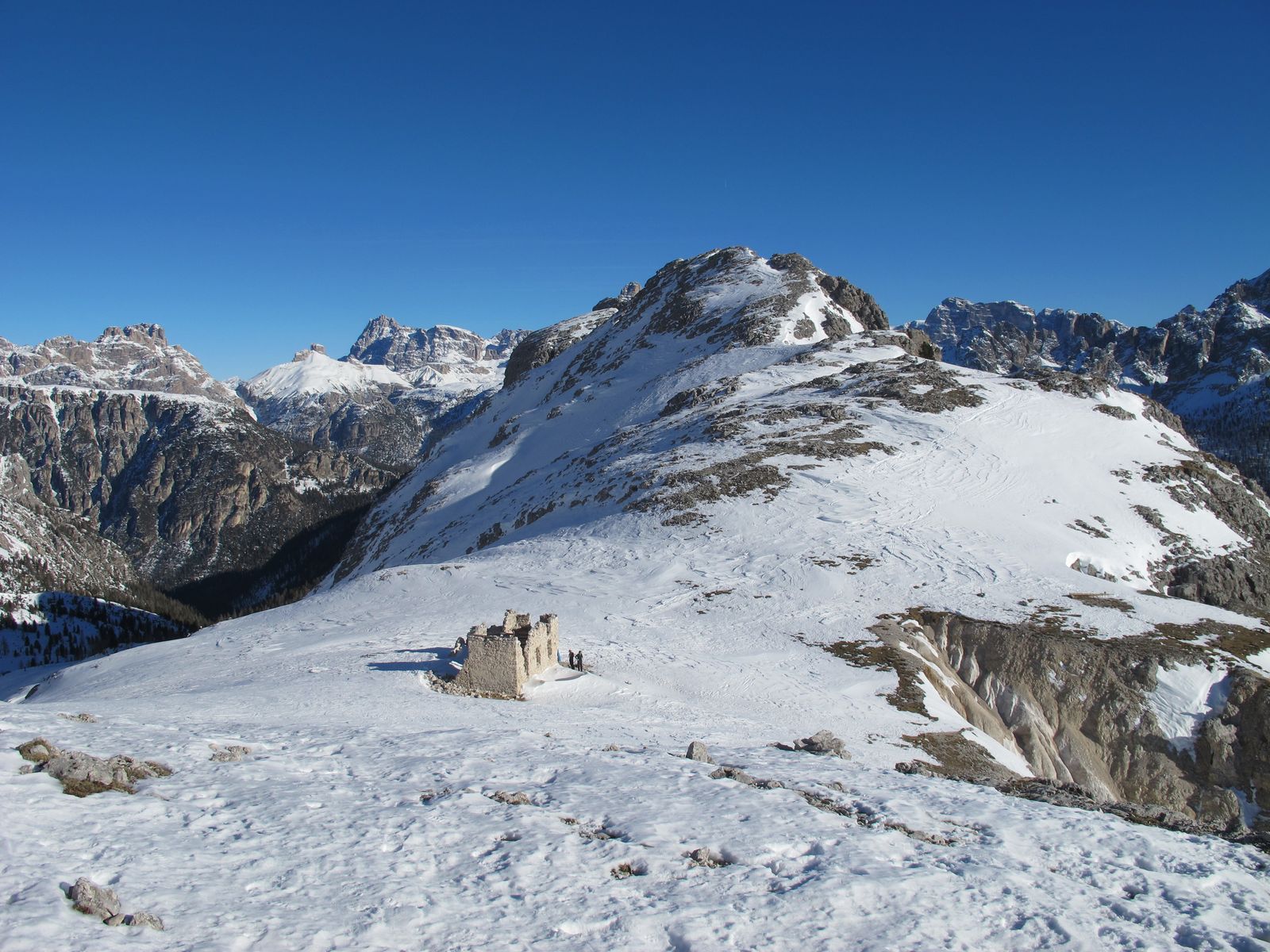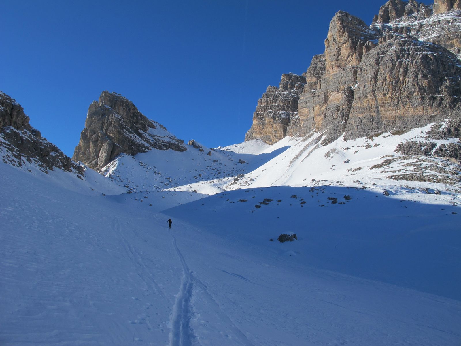 Von beeindruckenden Felswänden umrahmt, nun nach links haltend zur Ruine der Rifugio Popoena (erbaut 1937, abgebrannt 1938) in die Scharte Forc. de Popena. Dort die Aussicht genießen und dann kurz mit Fellen abrutschen und weiter in Richtung