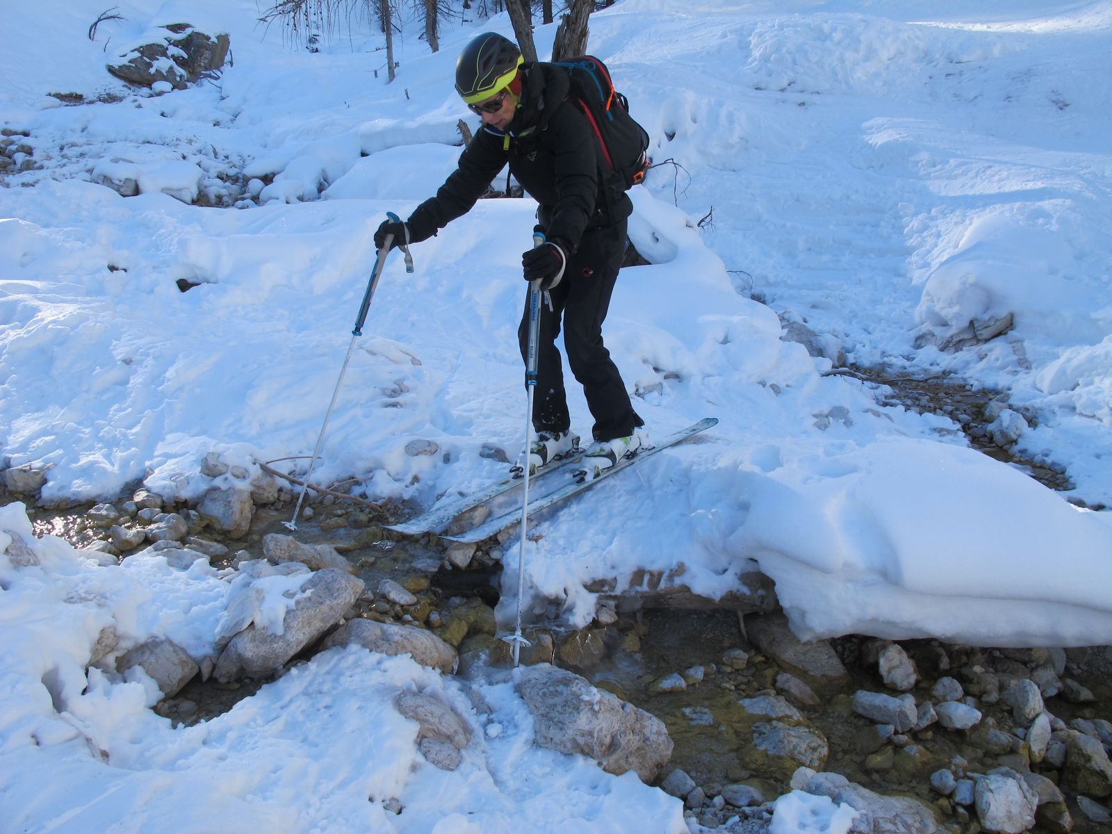 Abfahrt zuerst wie Aufstieg, dann eher rechtshaltend und nach einer bewaldeten Steilstufe weiter im Bachbett zum Ausgangangspunkt zurück.