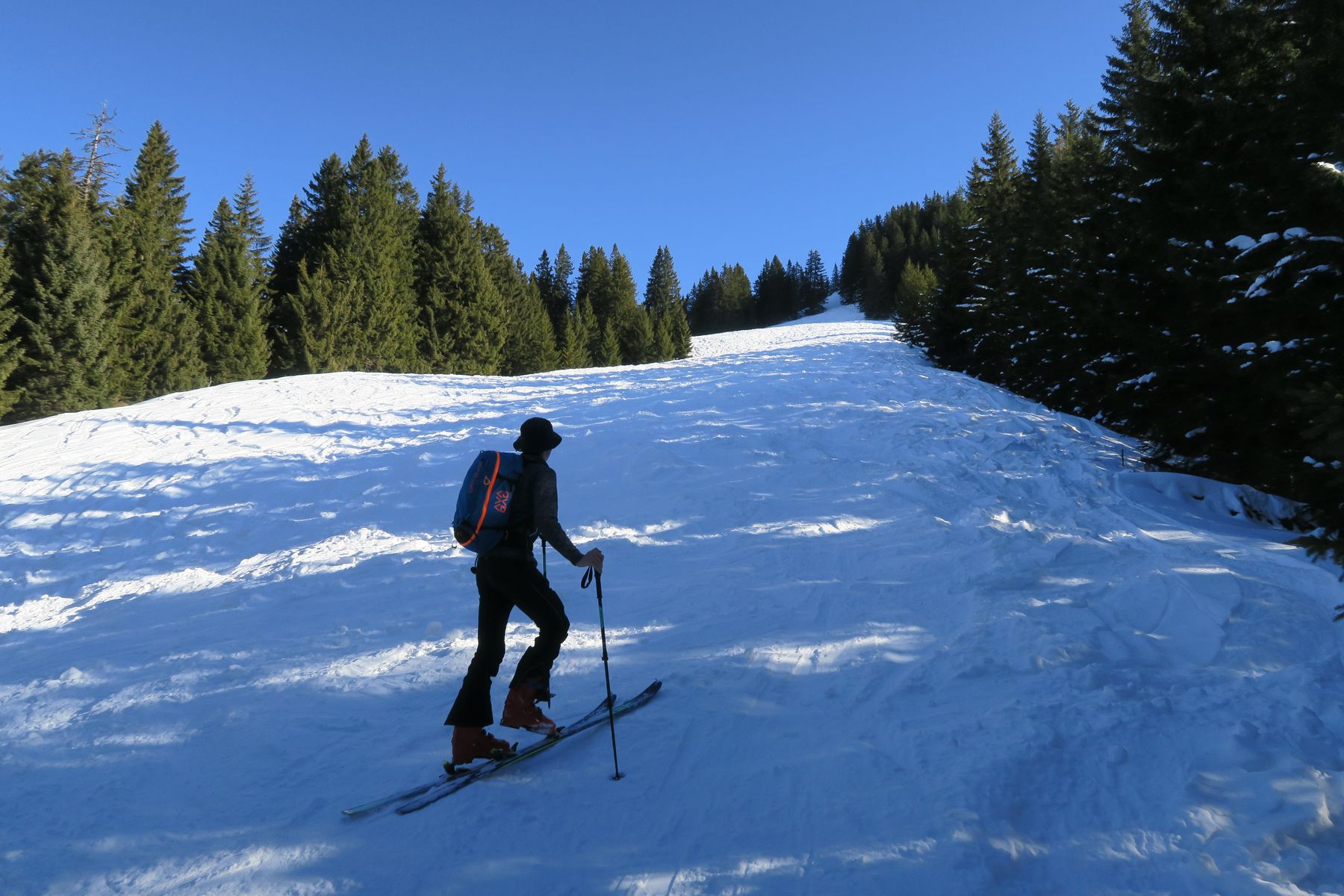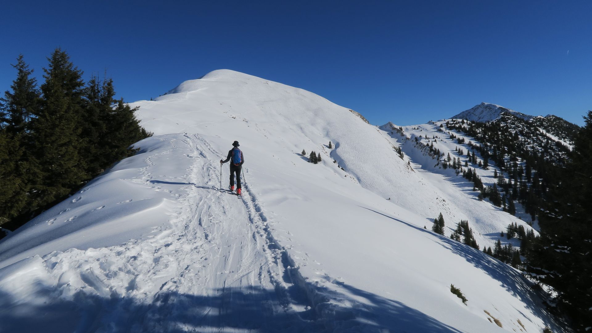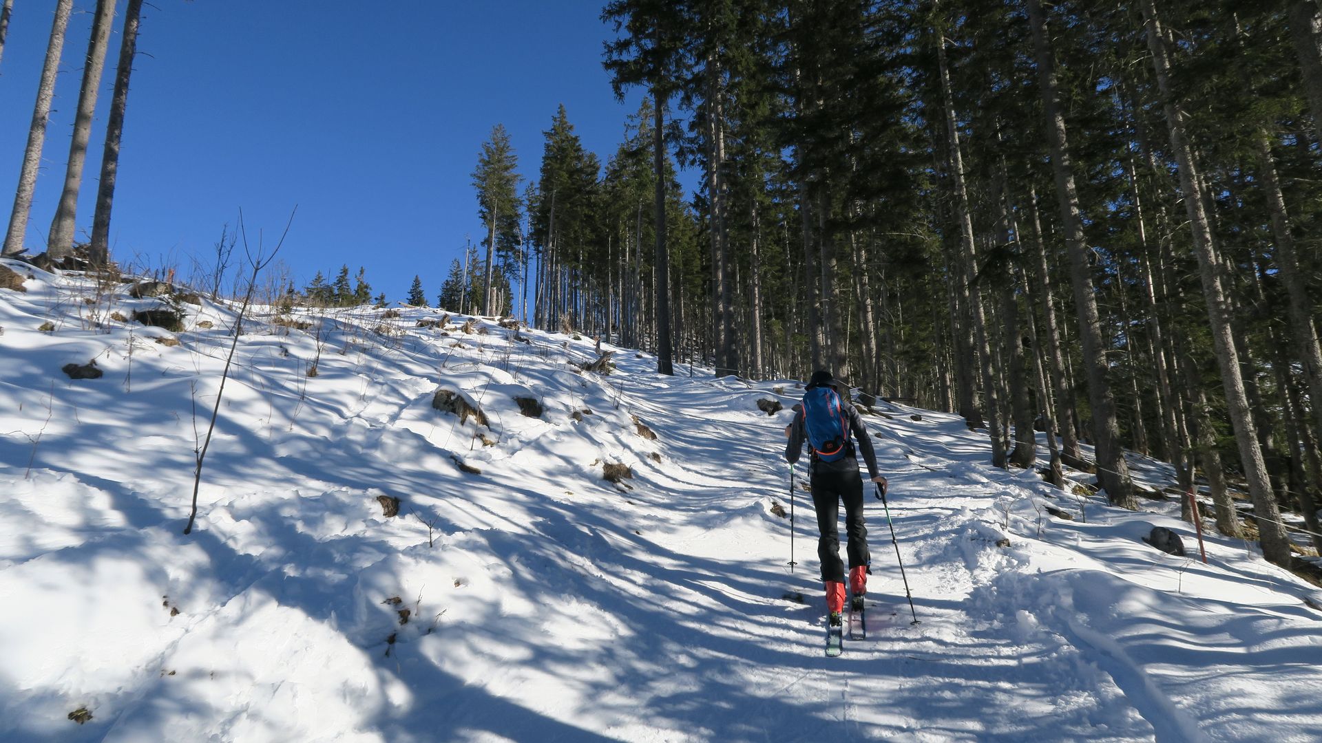 Verhältnisse: Der Forstweg ist durchgehend in einem sehr guten Zustand, unten ist er sogar präpariert für die Rodler. Die Waldschneise entlang des Rückens hat ausreichend Schnee, so dass man gut rauf und einigermaßen runterkommt. An einigen Stellen war allerdings schon sehr vorsichtiges Seitwärts-Abrutschen angesagt. Vereist waren die Steilstellen noch nicht, höchstens mal bisserl harschig.