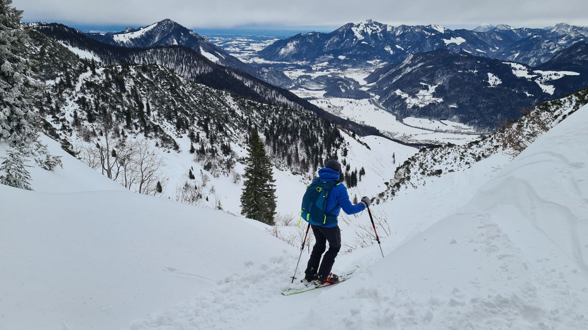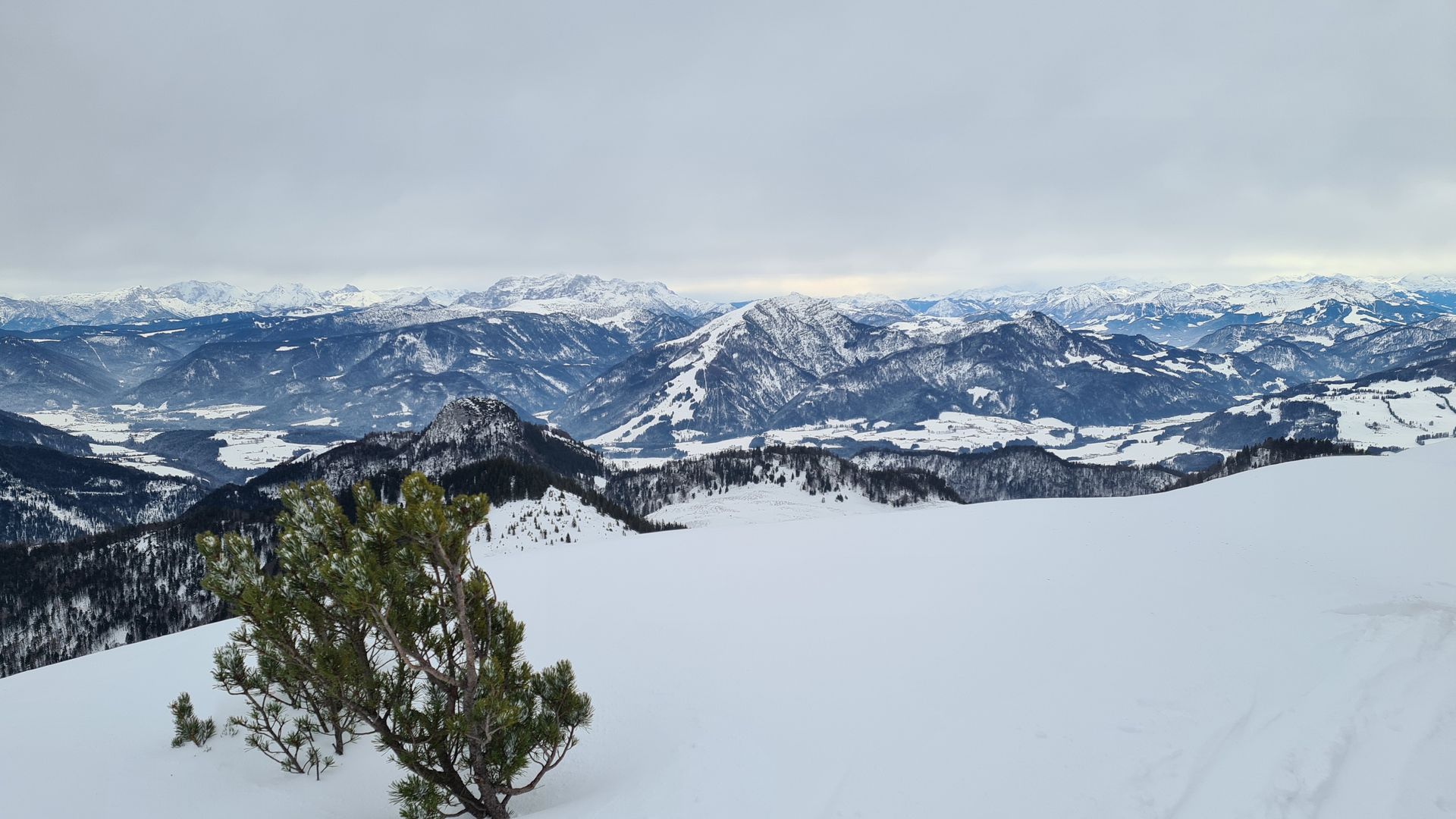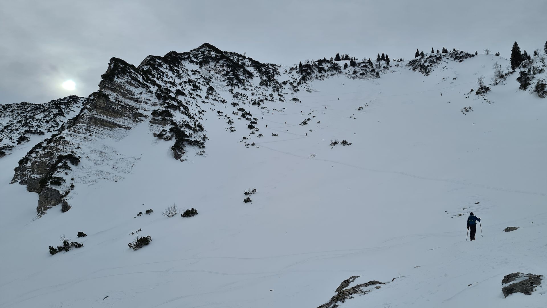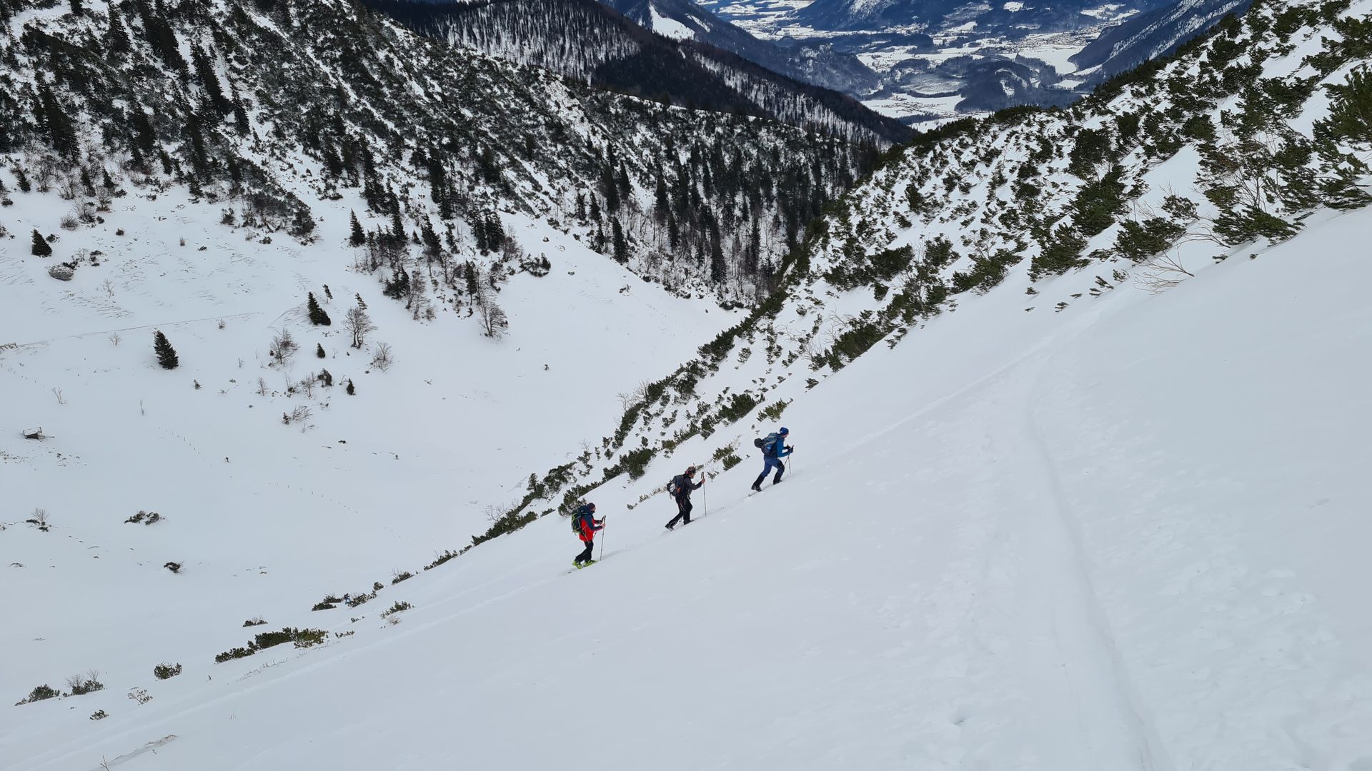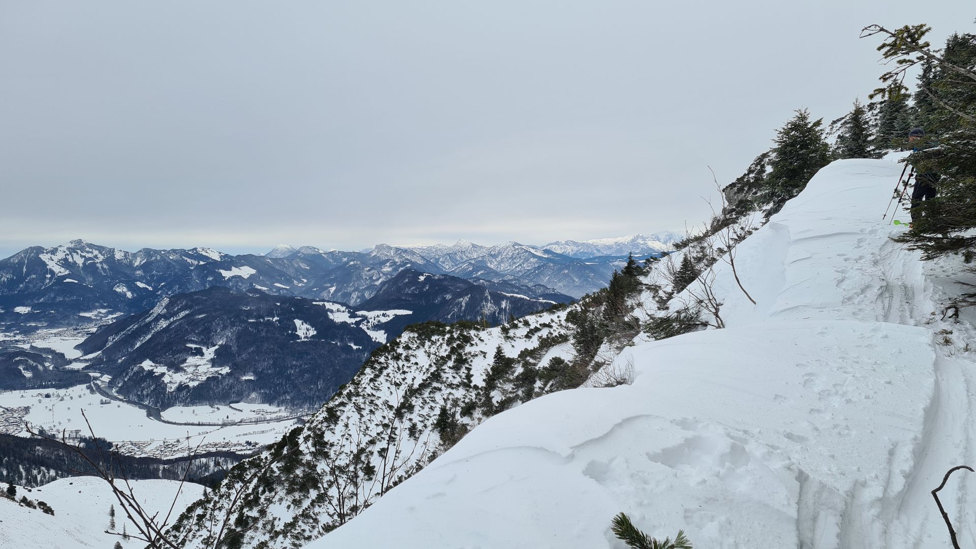 Der ganze südseitige Hang auf der rechten Seite im Aufstieg (Stübeckrücken?) ist übrigens sehr abgeblasen, aber entlang der Route zum Breitenstein gibt es sowohl für den Aufstieg und die Abfahrt richtig gut Schnee. Der Gipfelbereich vom Geigelstein sah ziemlich abgeblasen aus, siehe Foto.
