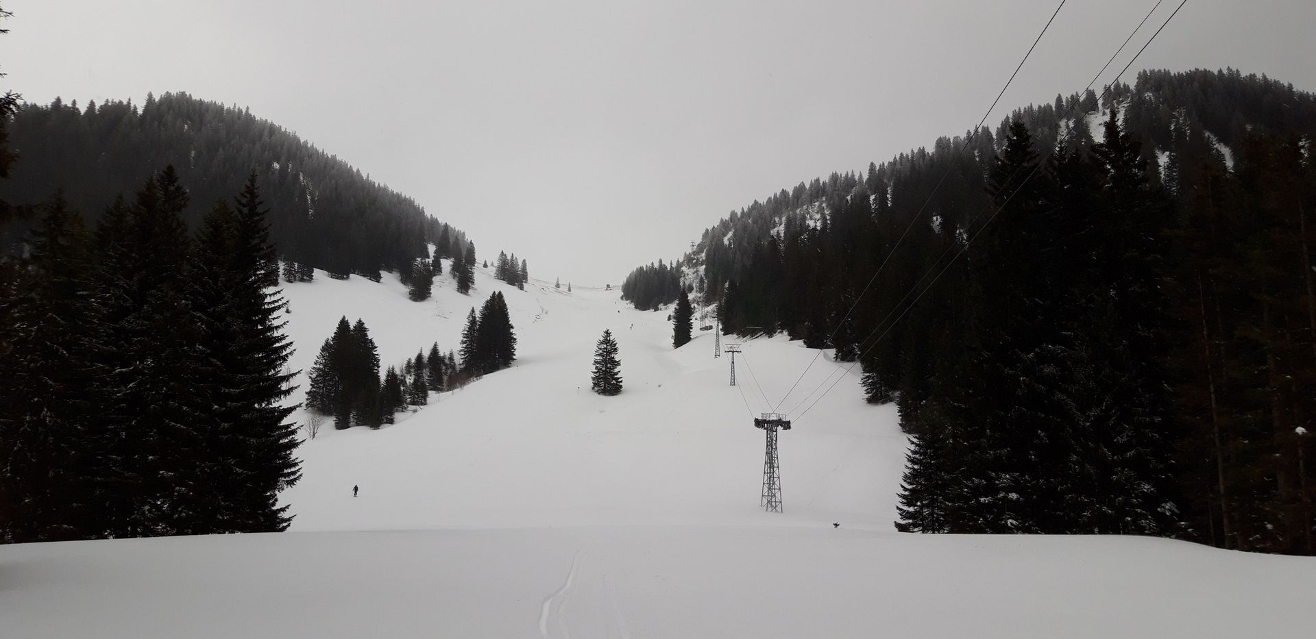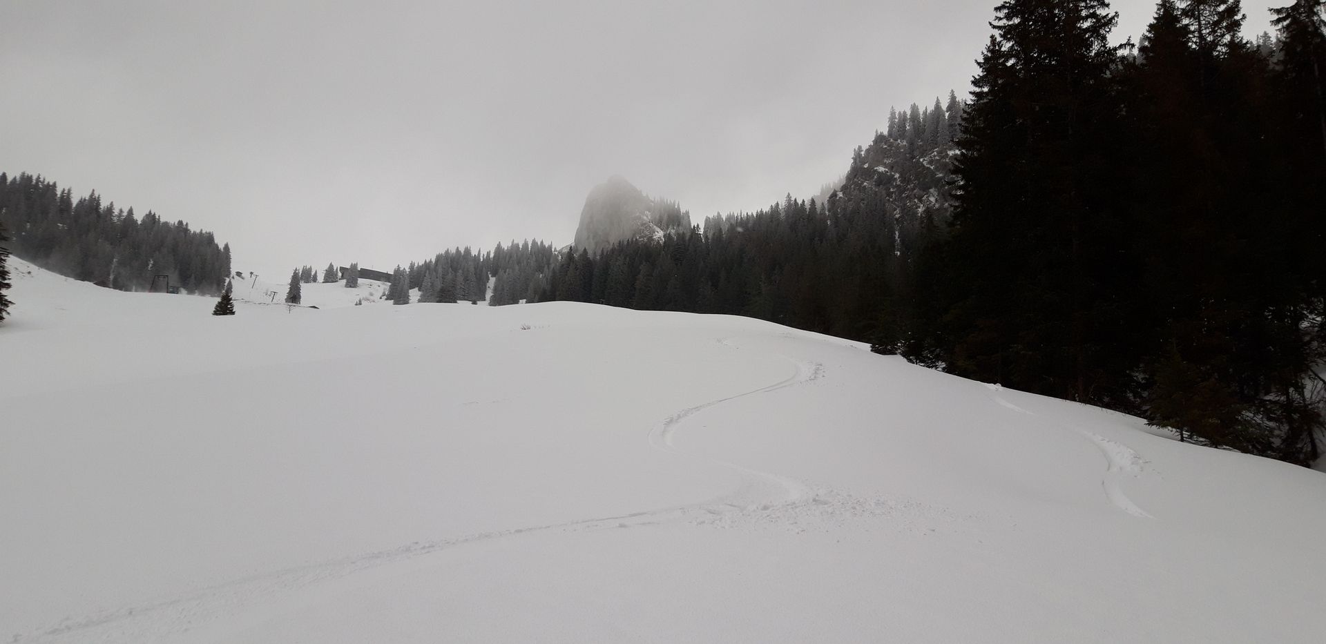 Heut Nachmittag hab ich am Spitzing eine kleine Runde gemacht: Über die Piste zur Bergstation, Abfahrt über die Wiesen der Maxlrainer Alm (den ausgeblasenen obersten Hang habe ich im Wald umfahren) und via Wallenburger Alm zum Lämpersberg. Ich bin nicht ganz hoch, sondern habe ungefähr auf 1700 Metern umgedreht, weil die Sicht zu schlecht wurde. Abfahrt bis zur Bergwacht-Hütte und kurzer Aufstieg über die Forststraße zum Lochgraben rüber.